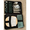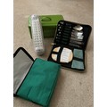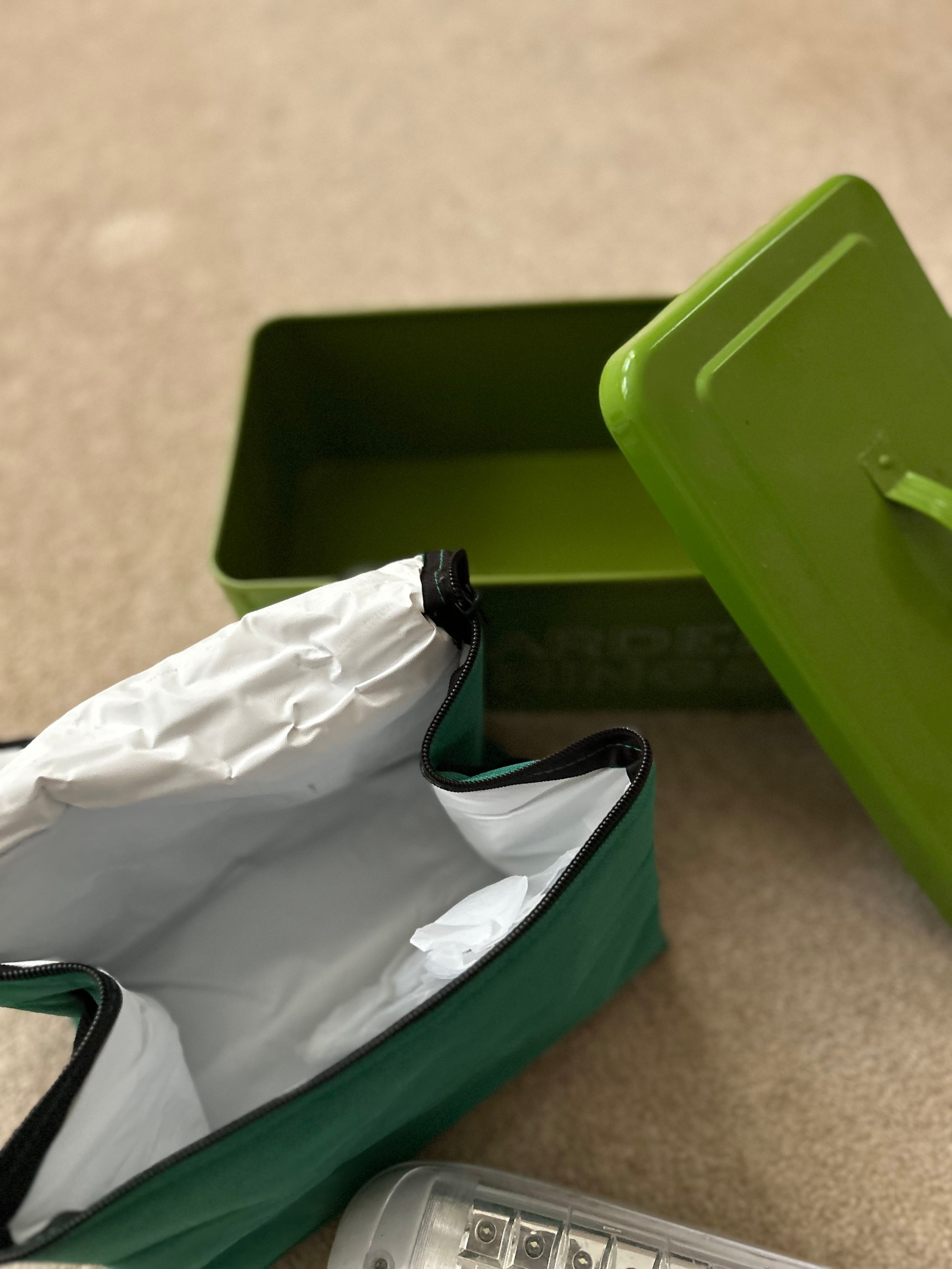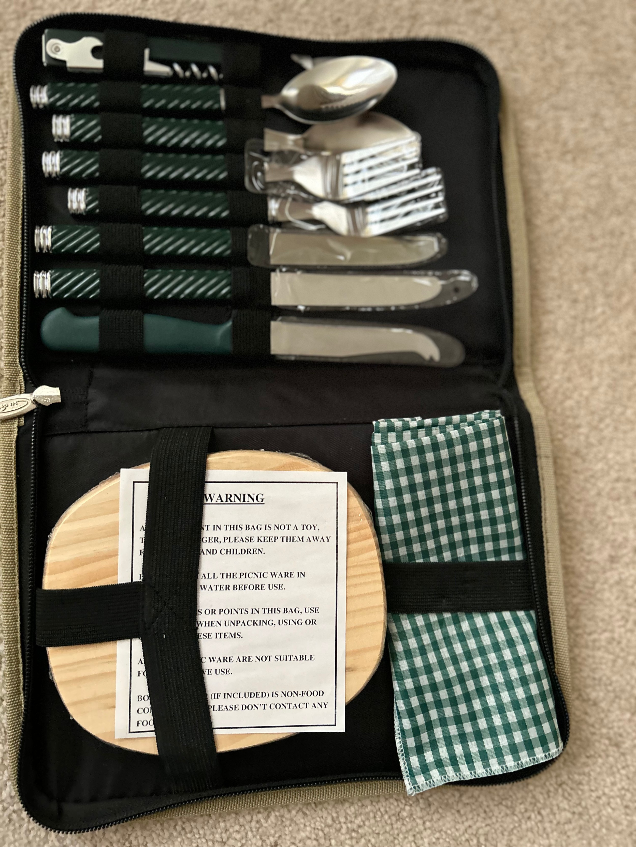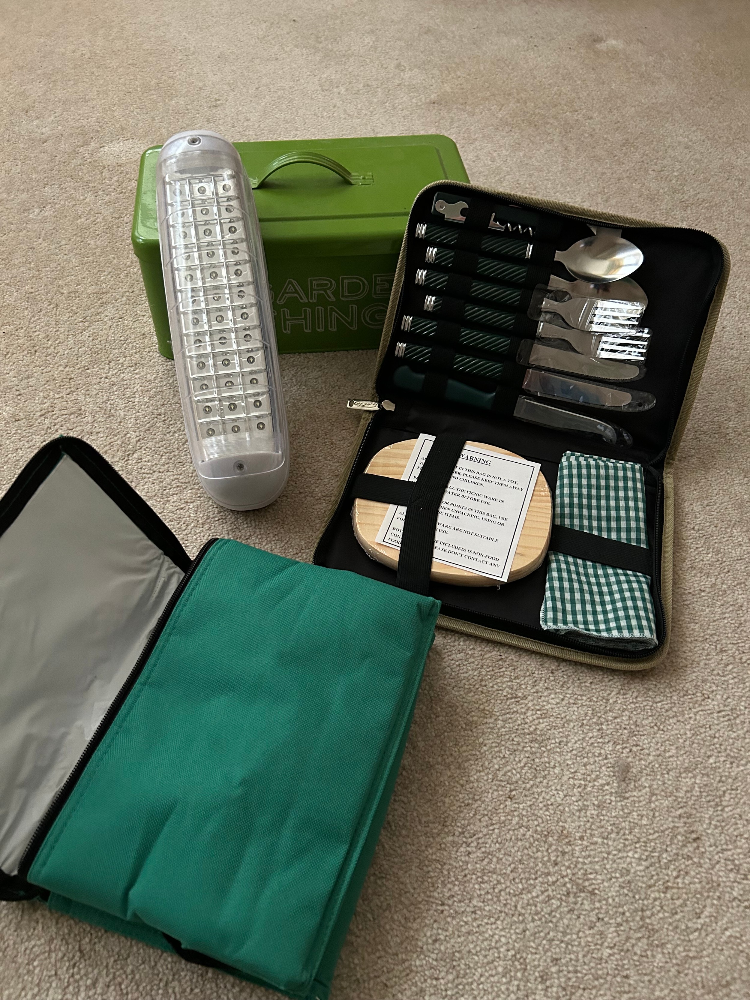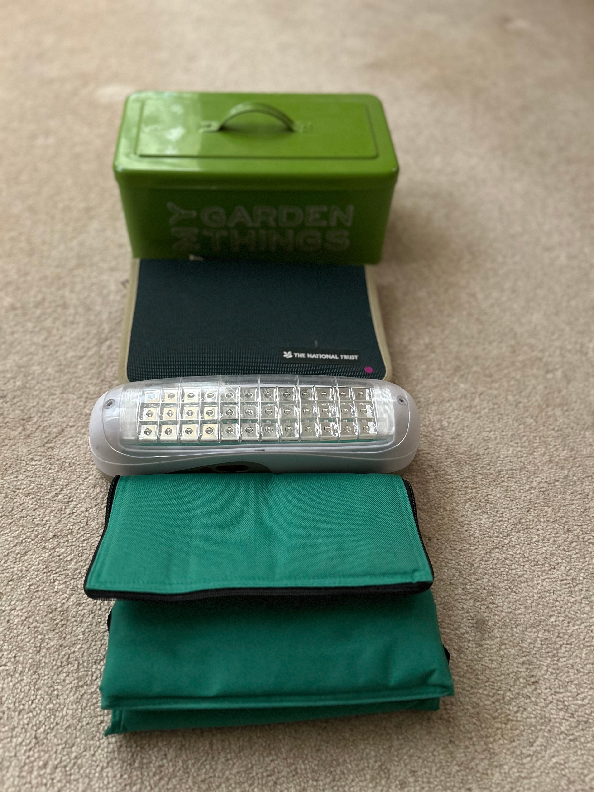 A NATIONAL TRUST PICNIC SET FOR 2 WITH CHEESE BOARD, A SANDWICH COOL BAG, A TIN “MY GARDEN THINGS” AND A RECHARGEABLE LED LIGHT (WORKING WHEN LOTTED)