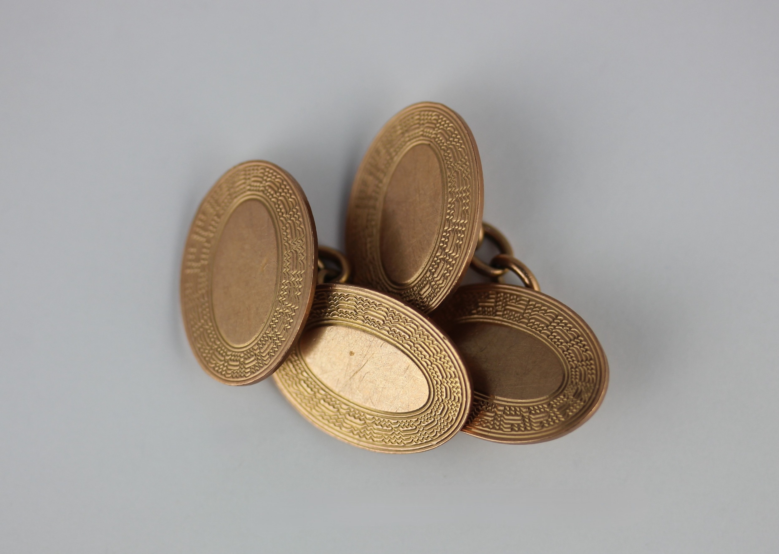 A pair of 9ct gold oval cufflinks the backs and the fronts decorated with engine turned borders Birmingham 1925 weight 7.6g