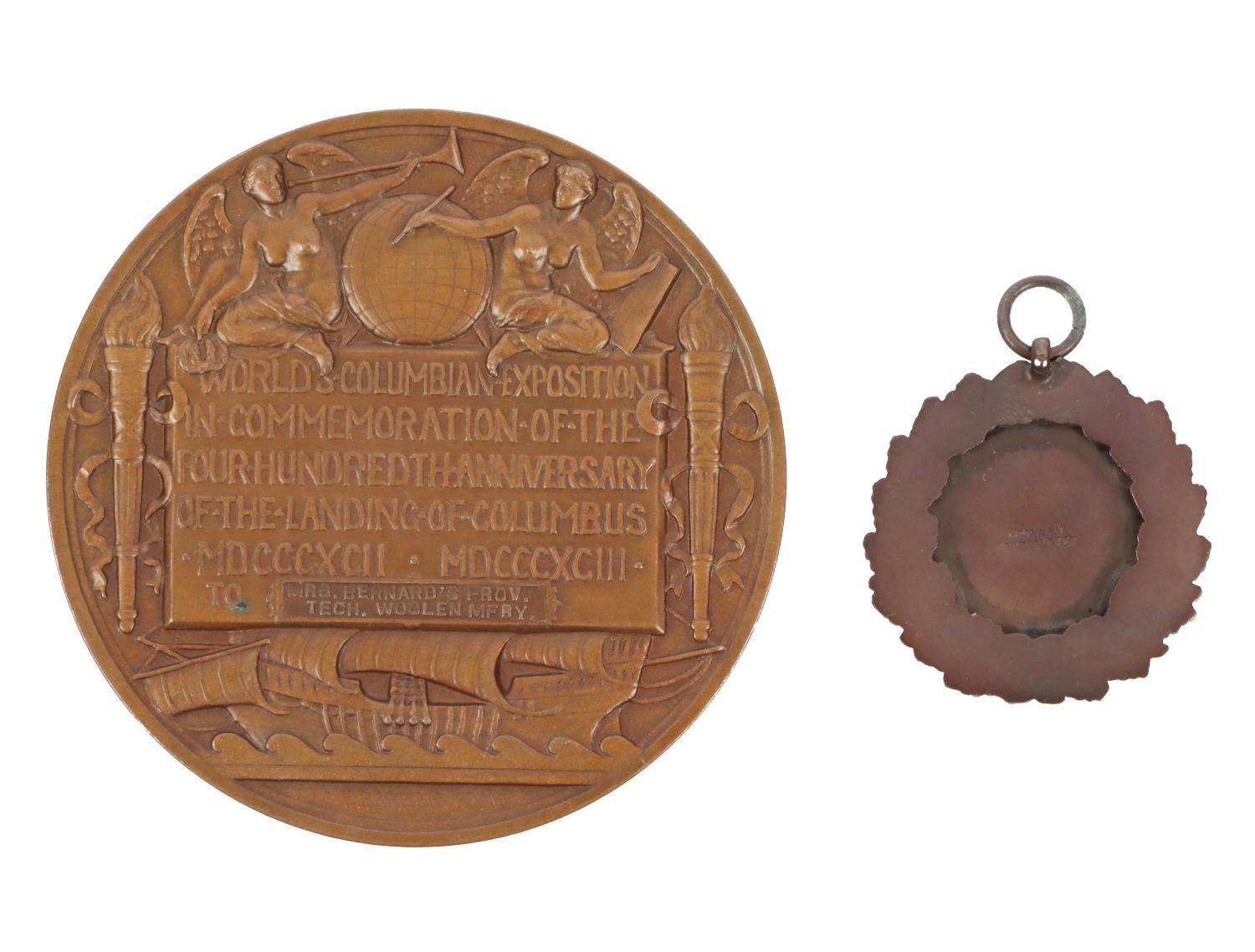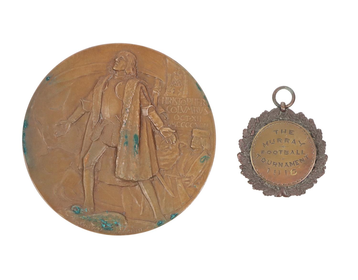 Medals: A bronze Medal for Worlds Columbian Exposition, 1892 (400 years anniversary of the landing of Columbus, awarded to Mrs. Bernard's Prov. Tech. Woolen, MFRY. designed by C.E. Barber, also a cased bronze Medal inscribed 'The Murray Football Tournament 1916,' by H.G Cronnen, Kent, in original box. (2)