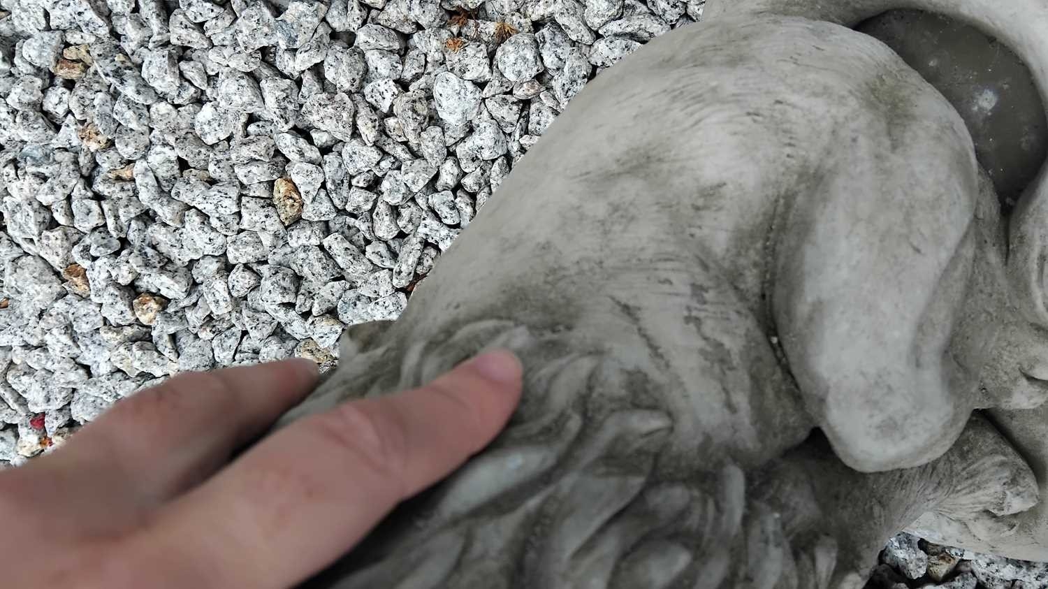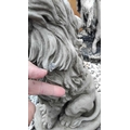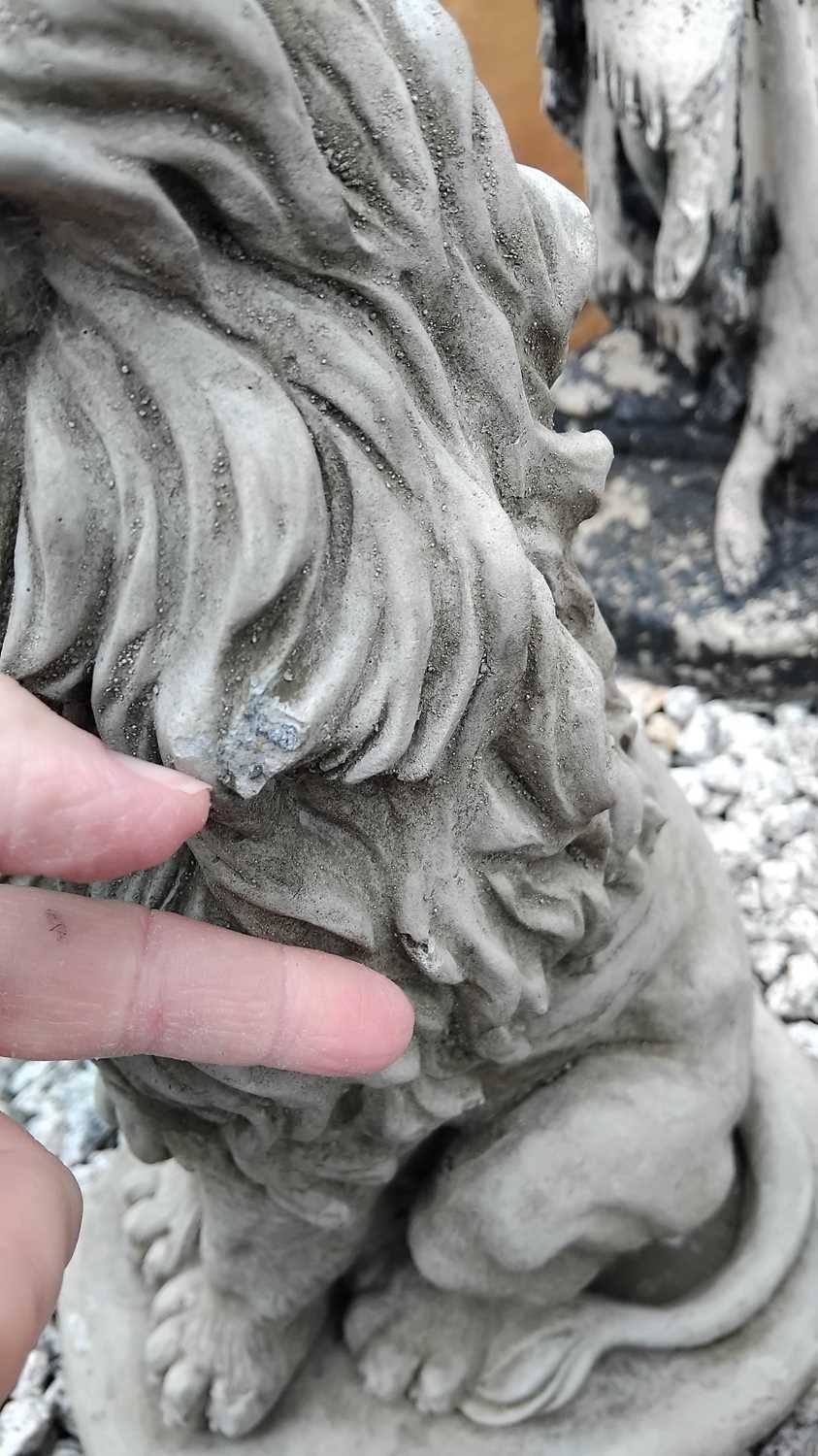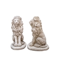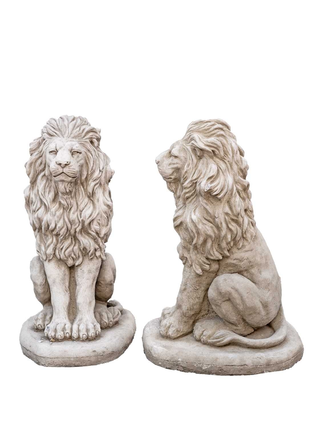 A pair of cast stone sculptures of seated lions. Raised on shaped bases. Height 40cm. One of the lions has three small losses to its mane. Please refer to condition report photographs.