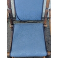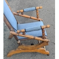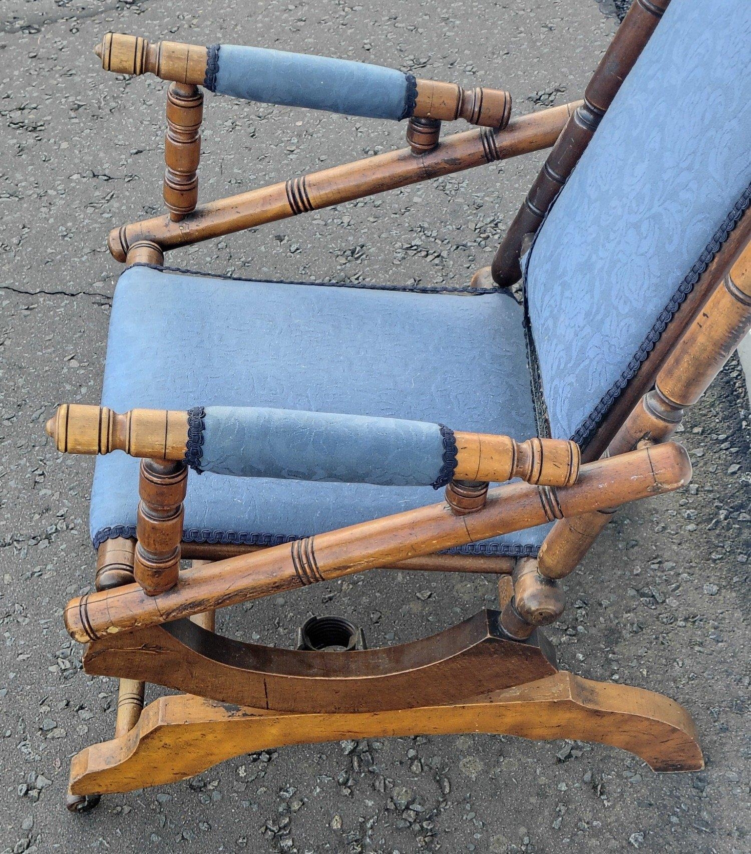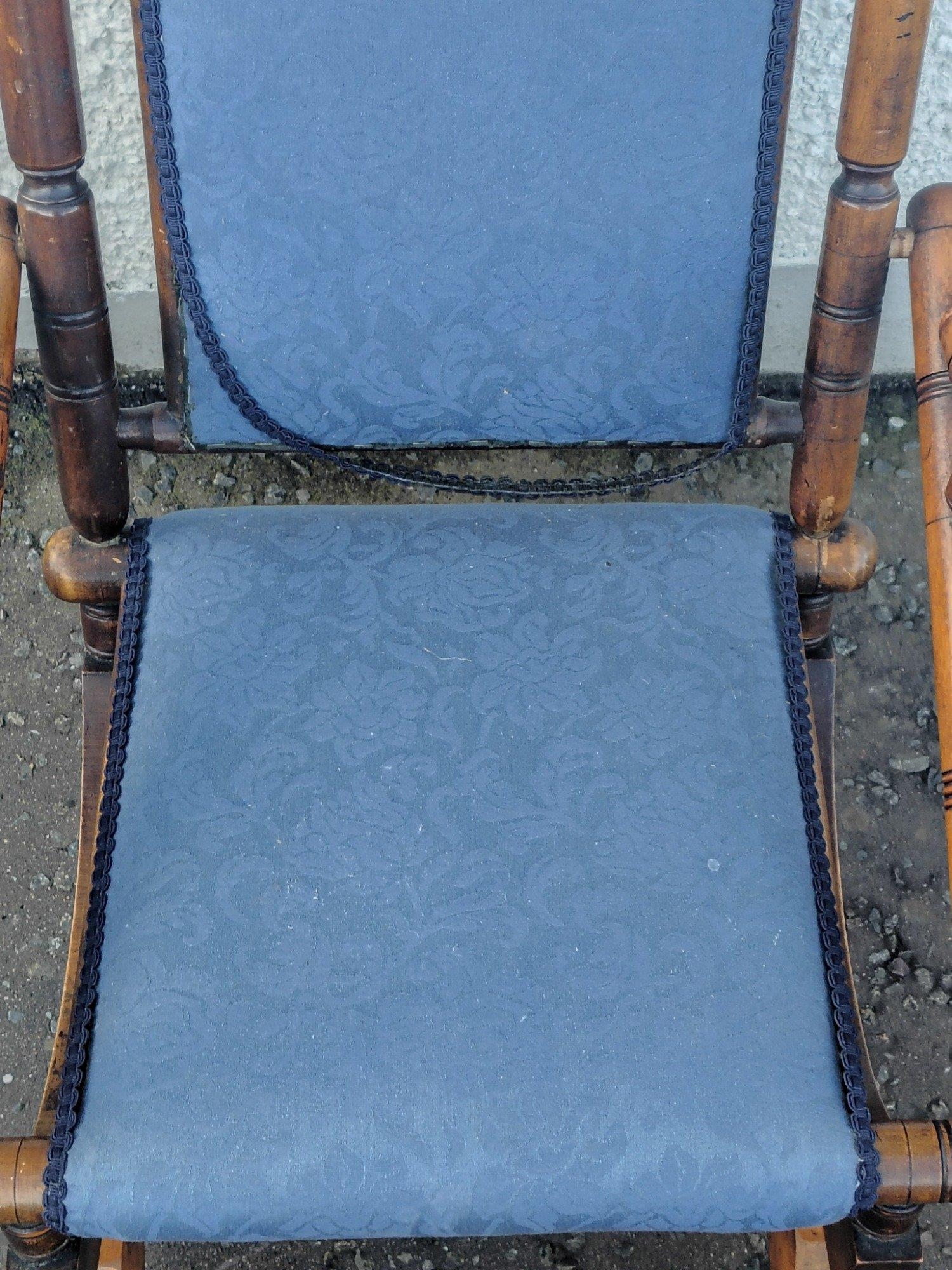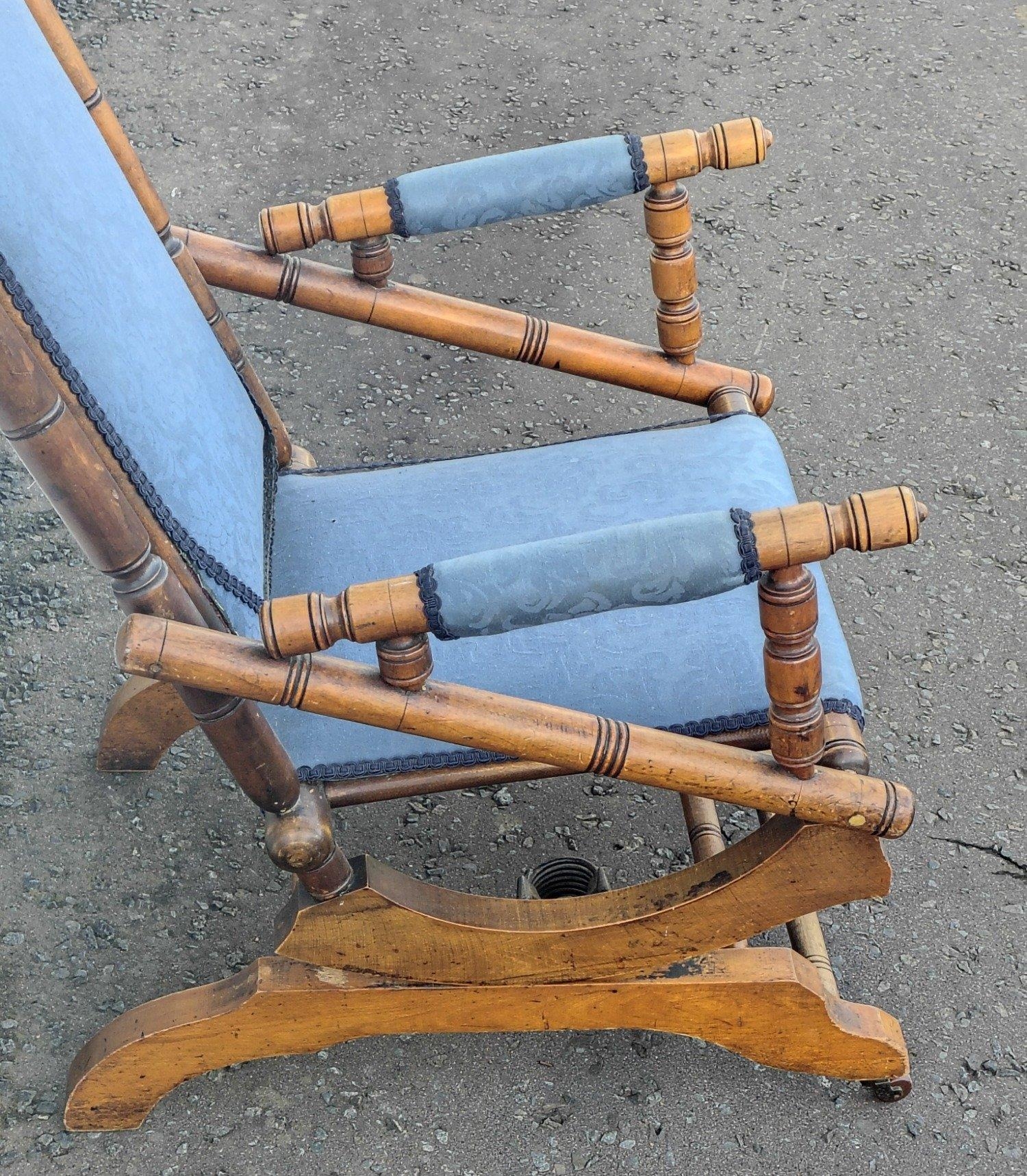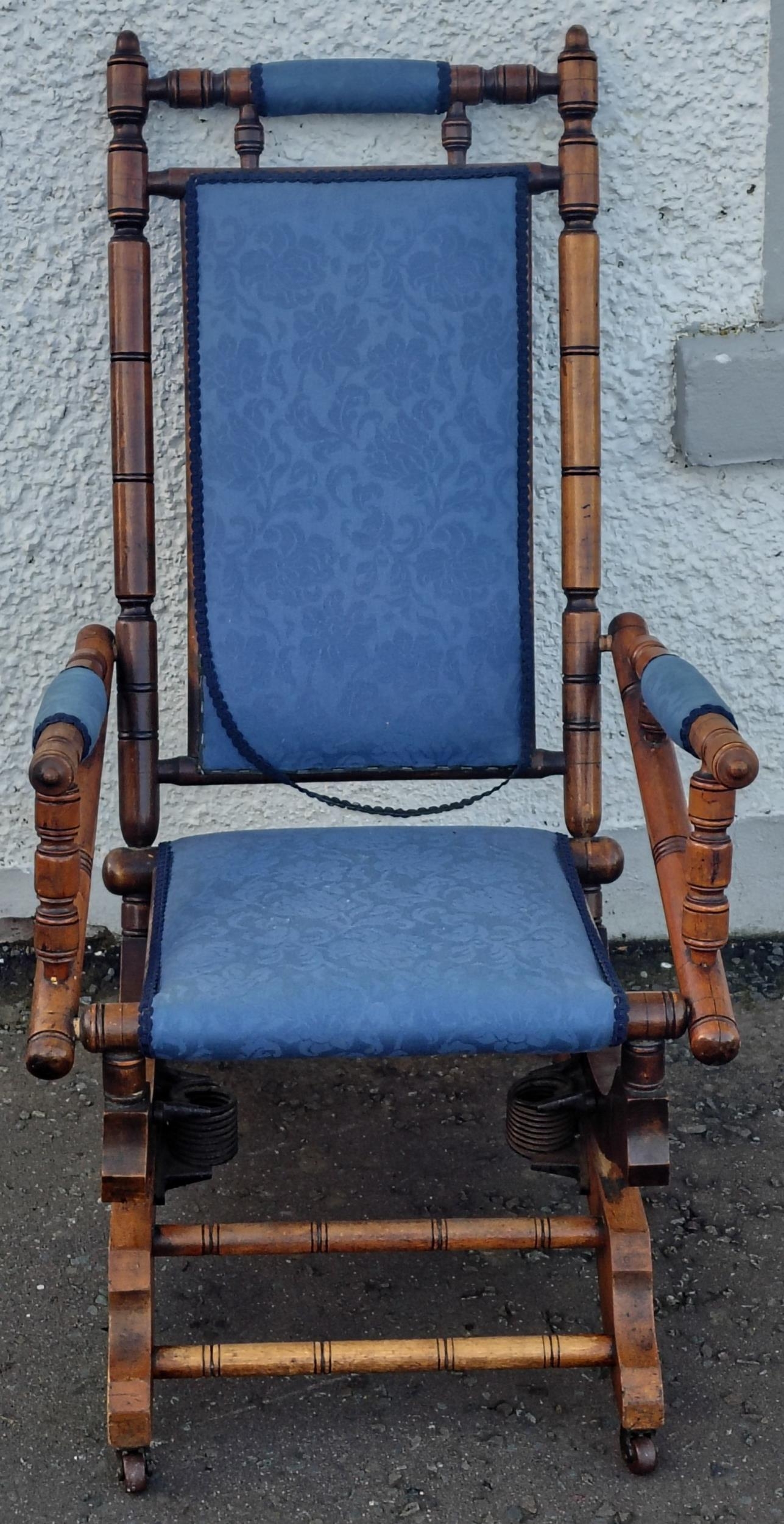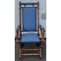 A late Victorian beechwood American rocking chair with blue floral fabric covering. Height 103cm approx, W57cm