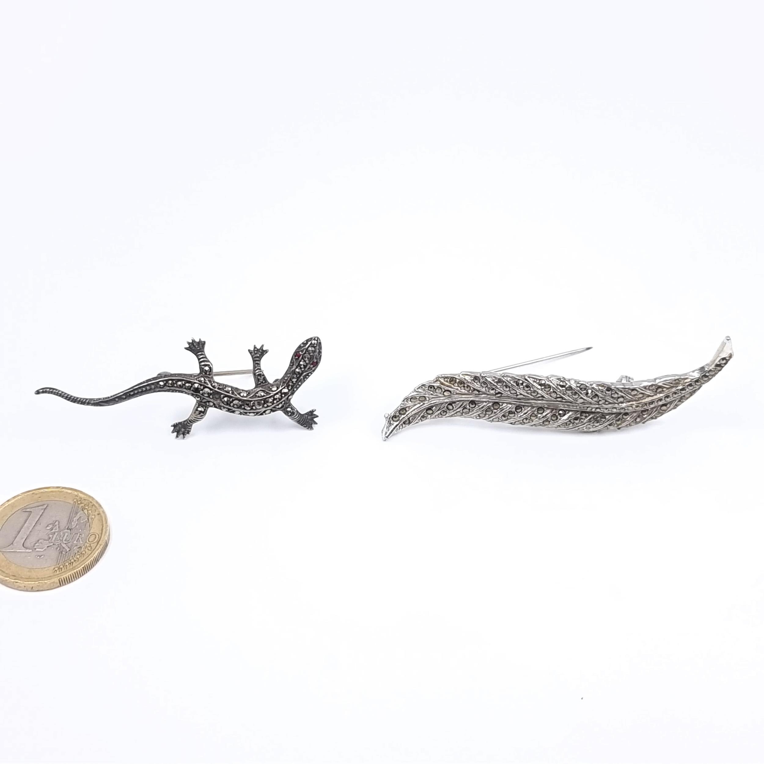 Two vintage brooches including a sterling silver lizard example with jeweled eye (4.72 grams), and a white metal leaf designed example. Both featuring marcasite detailing.