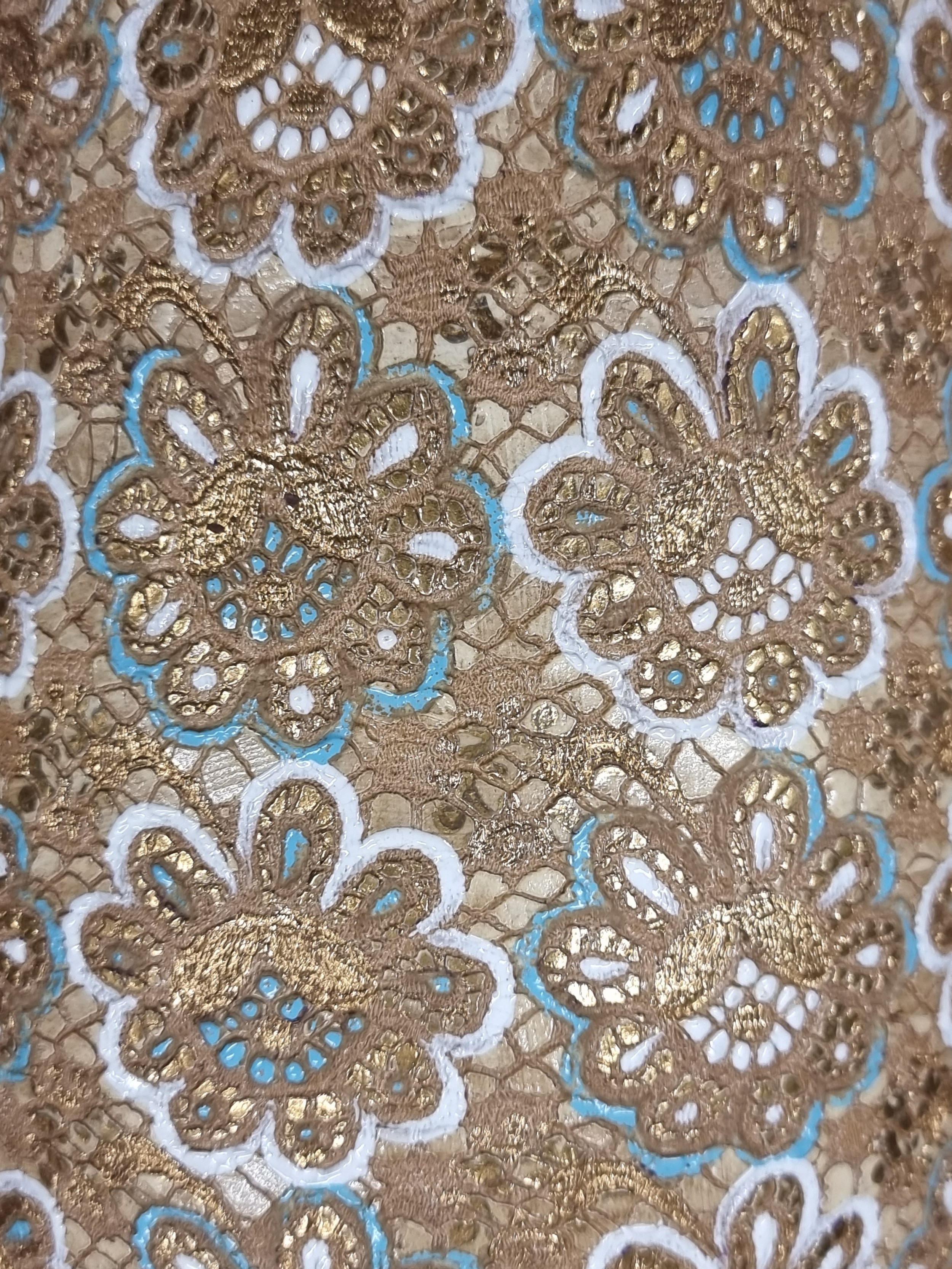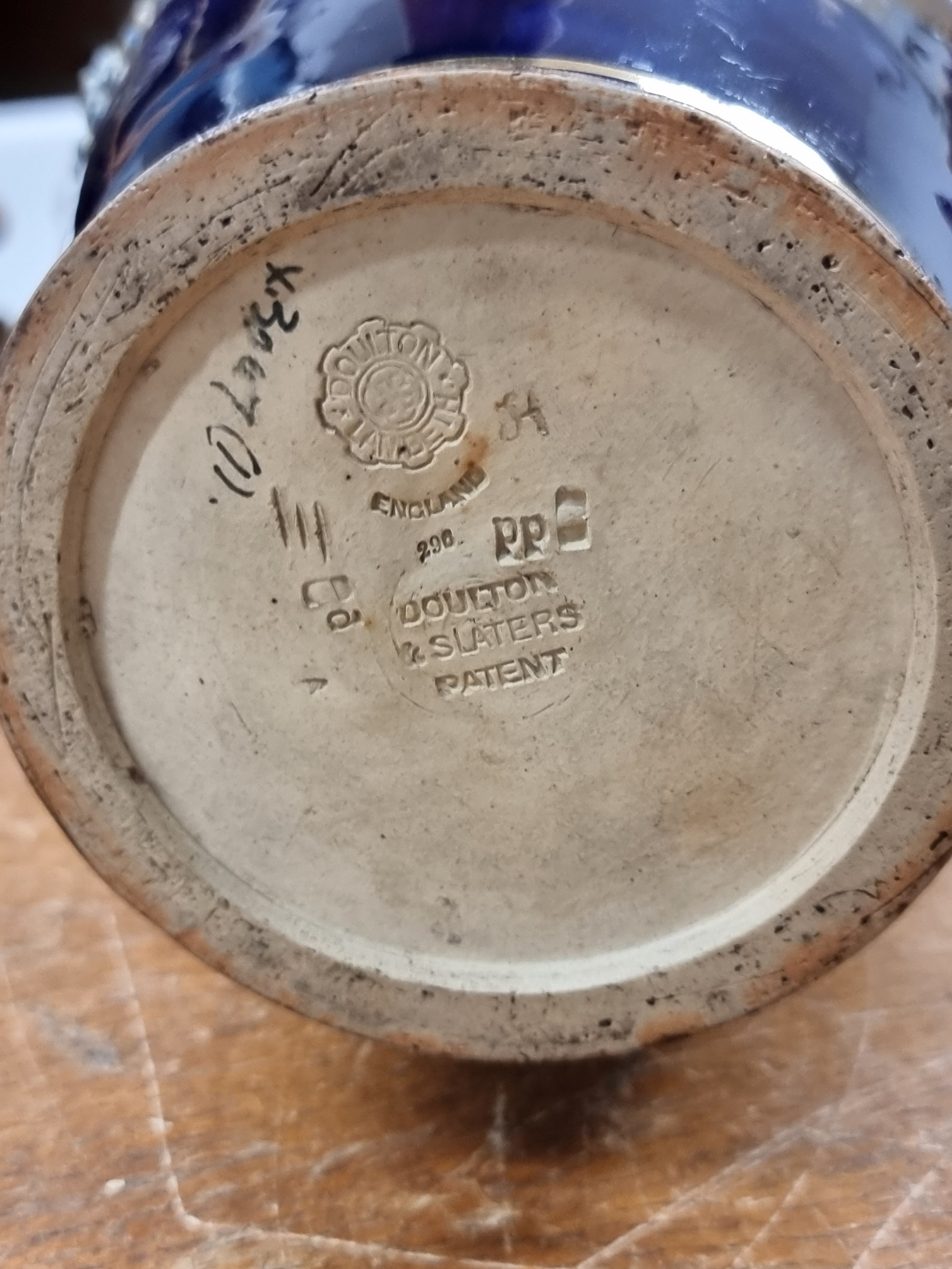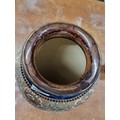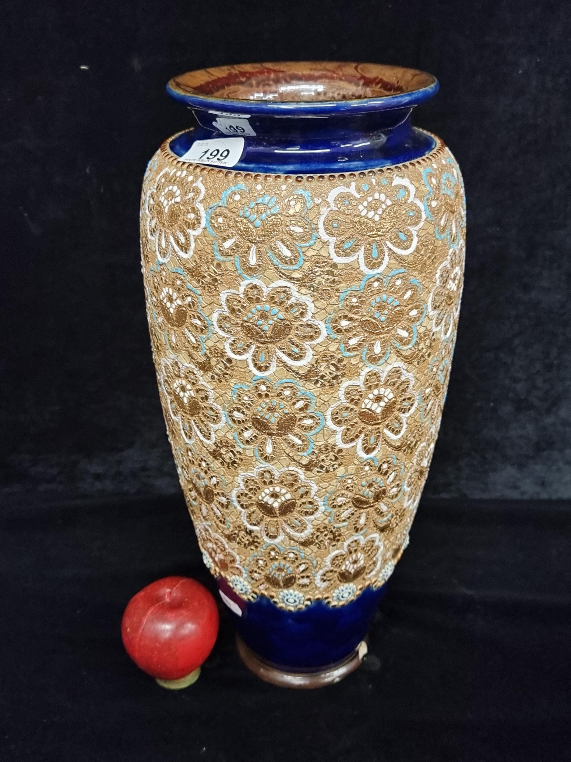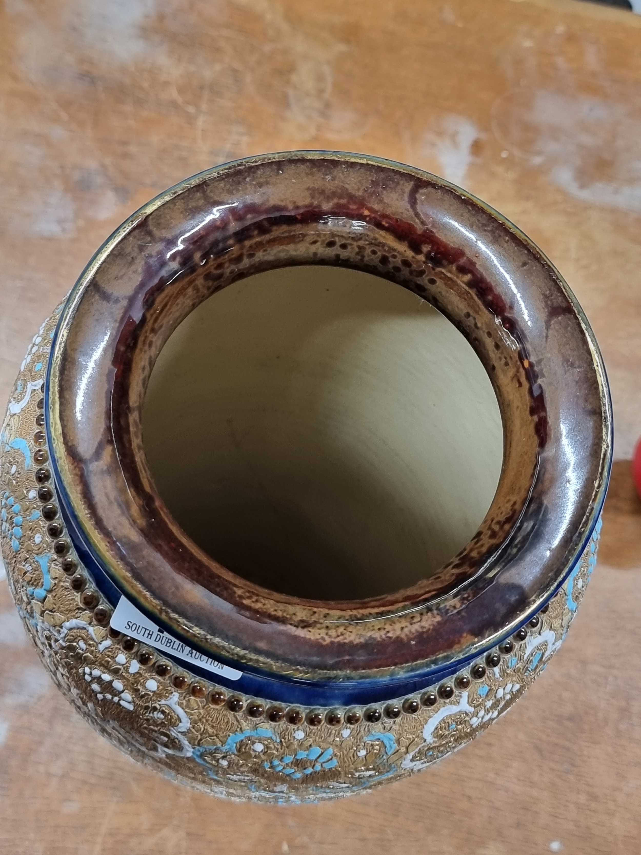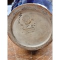 Star lot : An early 20th century very large Doulton Lambeth vase. A very ornate piece, richly decorated with profuse gilded and turquoise decoration in high relief against a glossy cobalt blue glaze. With makers mark to base. There is a chip the base rim as pictured., biggest one we have seen.