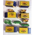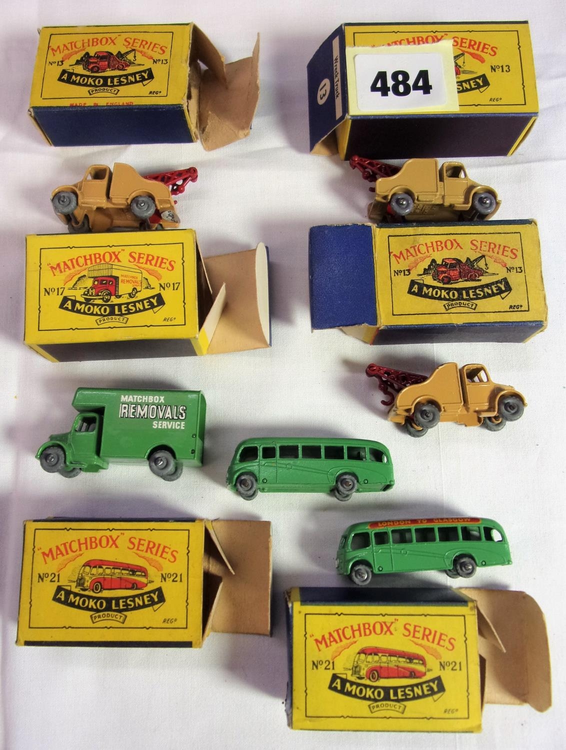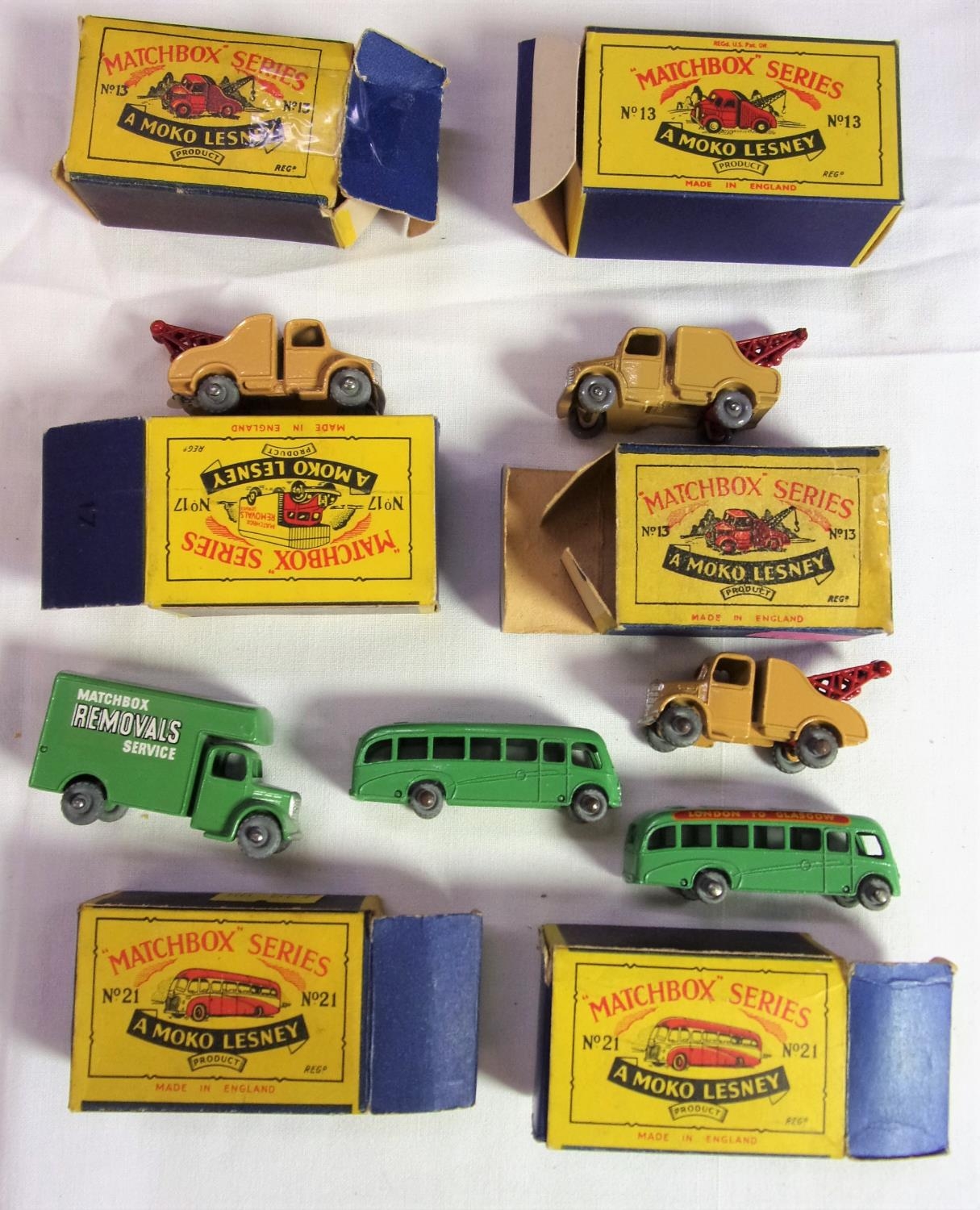 MATCHBOX 1-75 6 VERY EARLY MATCHBOX SERIES A MOKO LESNEY MODEL COMPRISING NUMBER 13 BREAKDOWN CRANE TIMES 2 NUMBER 13 A LATER VERSION OF THE WRECK TRUCK NUMBER 17 THE REMOVAL VAN AND NUMBER 21 THE BEDFORD COACH TIMES 2