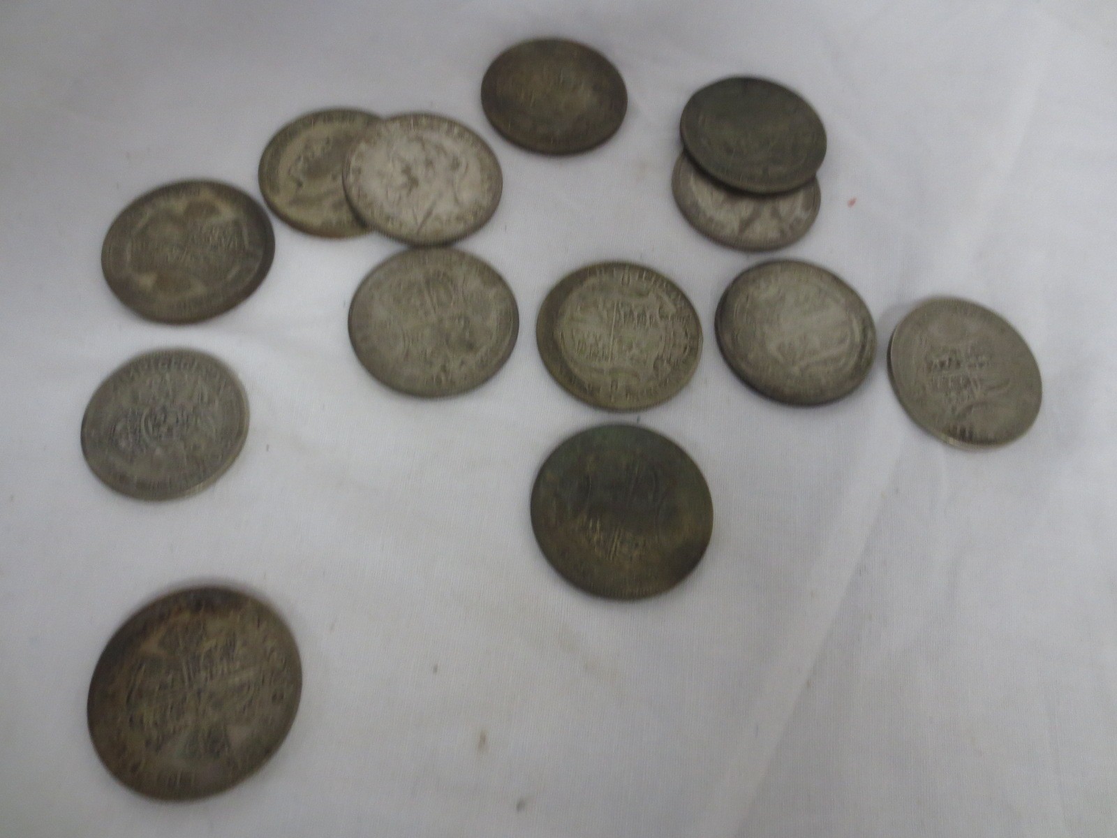 A selection of 10 George V and 2 George VI half crowns plus a George VI florin, all .500 silver content, approx weight 176.87g