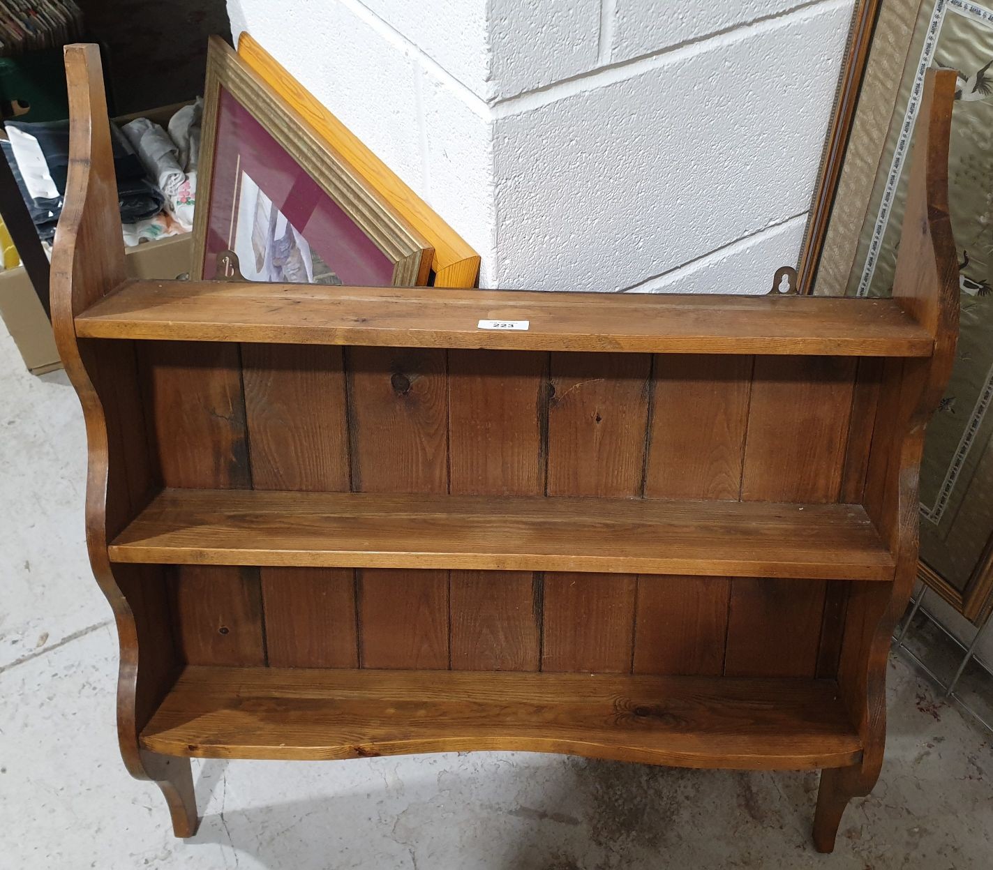A pine three tier wall shelf, width 26.25". No shipping. Arrange collection or your own packer and shipper please.
