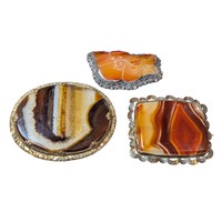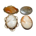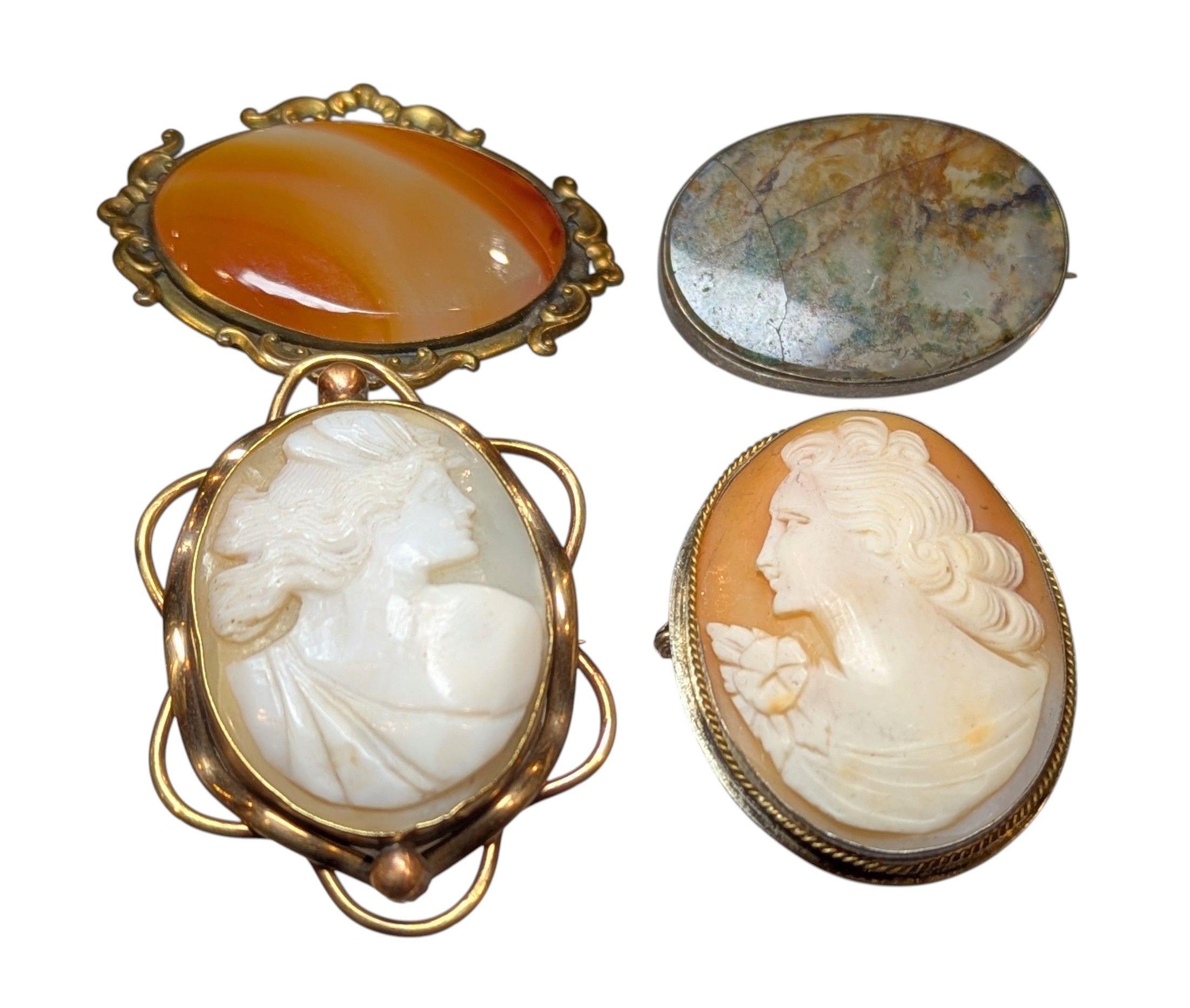 A selection of brooches, to include a Victorian gold plated mounted oval shell cameo brooch with a right facing lady in high with flowing hair, an unmarked white metal mounted oval shell cameo brooch with a left facing lady in high relief, an unmarked white metal mounted oval flat cabochon moss agate brooch and a base metal mounted oval cabochon banded carnelian agate brooch, a/f