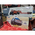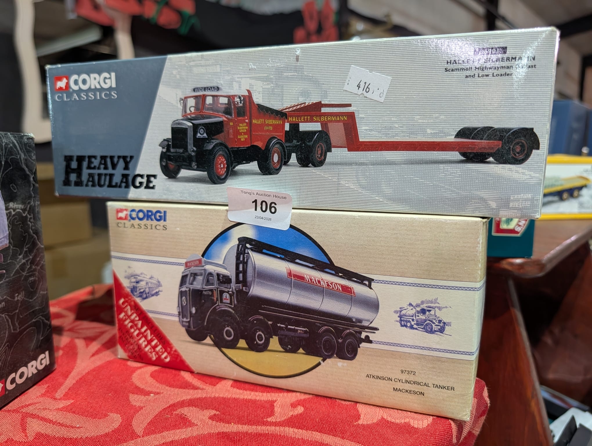 collectible Corgi die-cast model trucks, specifically a 1:50 scale Hallett Silbermann Scammell Highwayman Ballast and Low Loader (item 16901) and an Atkinson Cylindrical Tanker (item 97372). These sets include limited edition certificates and are part of the Corgi Heavy Haulage series.
