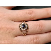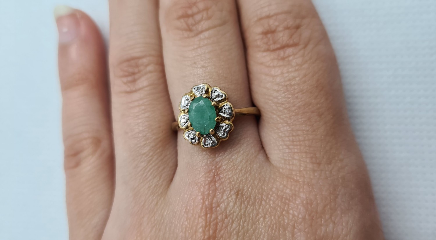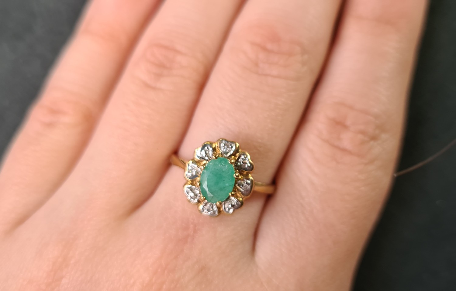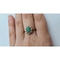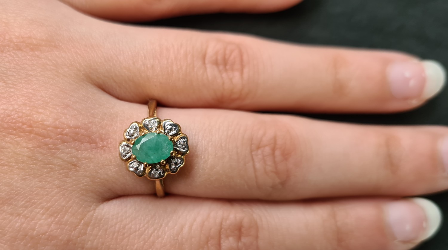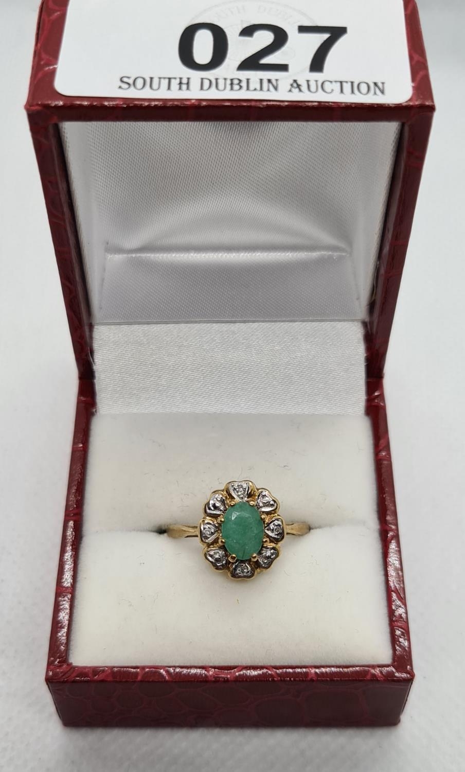 9ct yellow gold emerald and diamond ring size N1/2, cluster ring