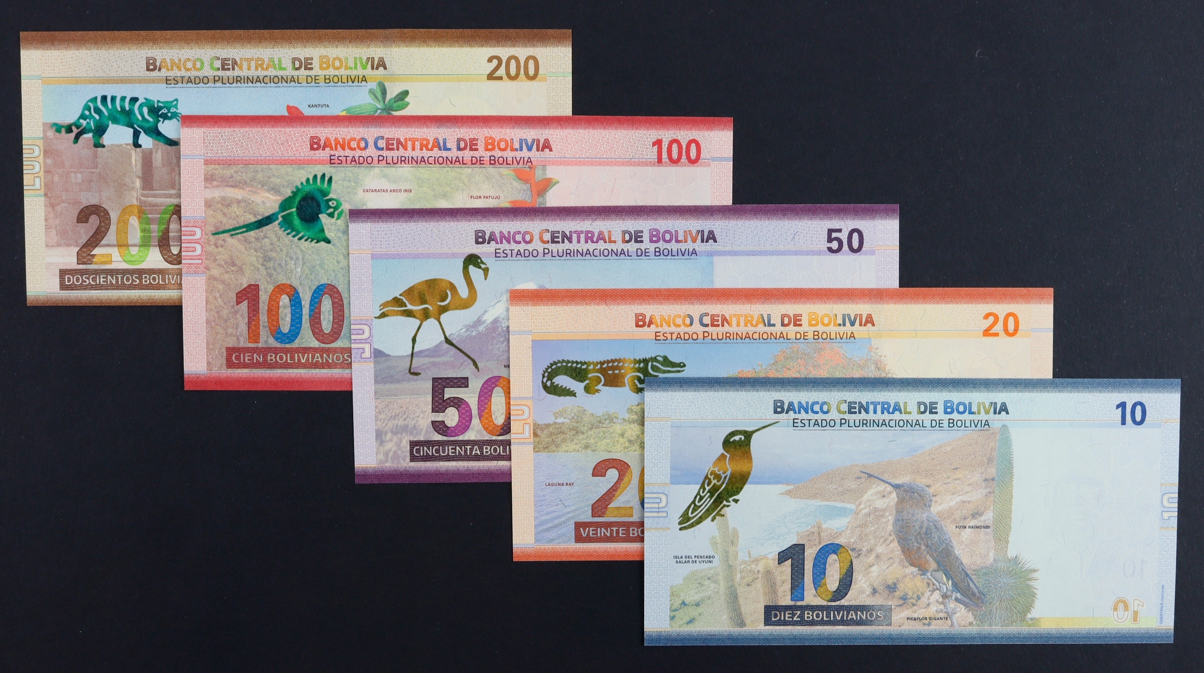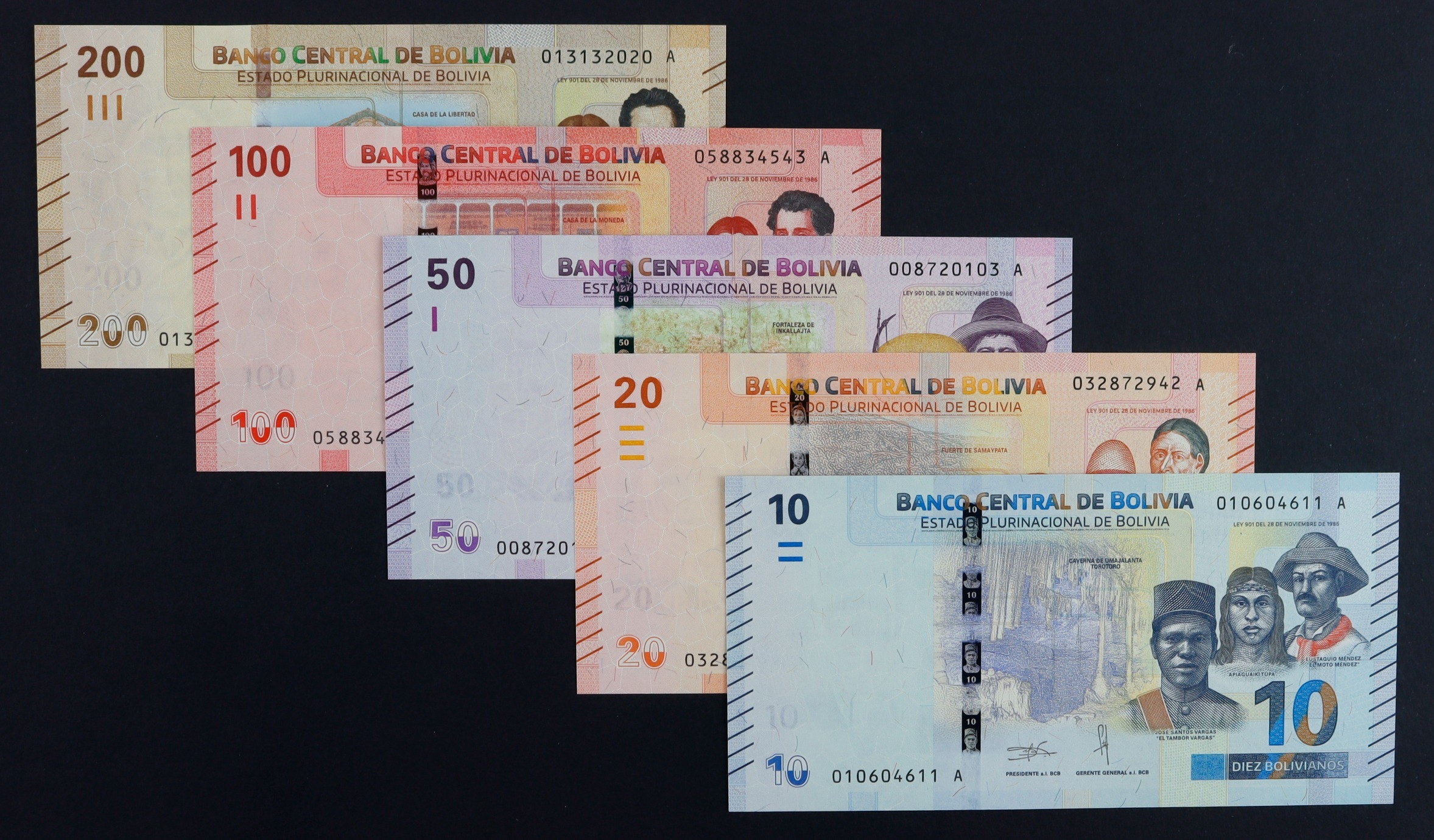 Bolivia (5), 200 Bolivianos, 100 Bolivianos, 50 Bolivianos, 20 Bolivianos, 10 Bolivianos, dated Law 28th November 1986 issued 2018 - 2019 (BNB B417 - B421, PickNL) Uncirculated