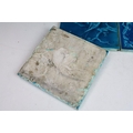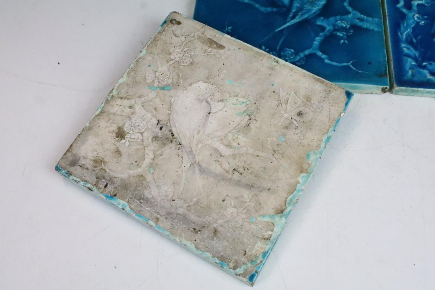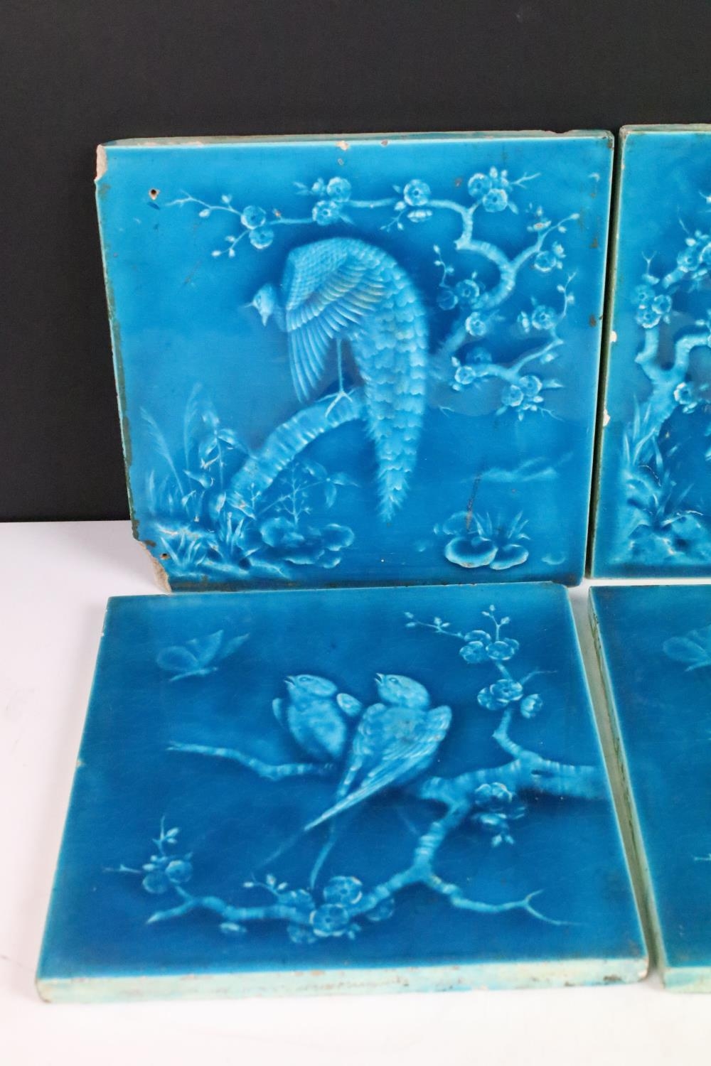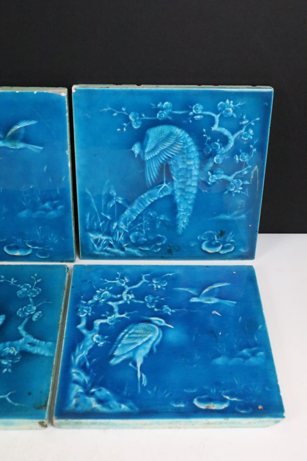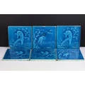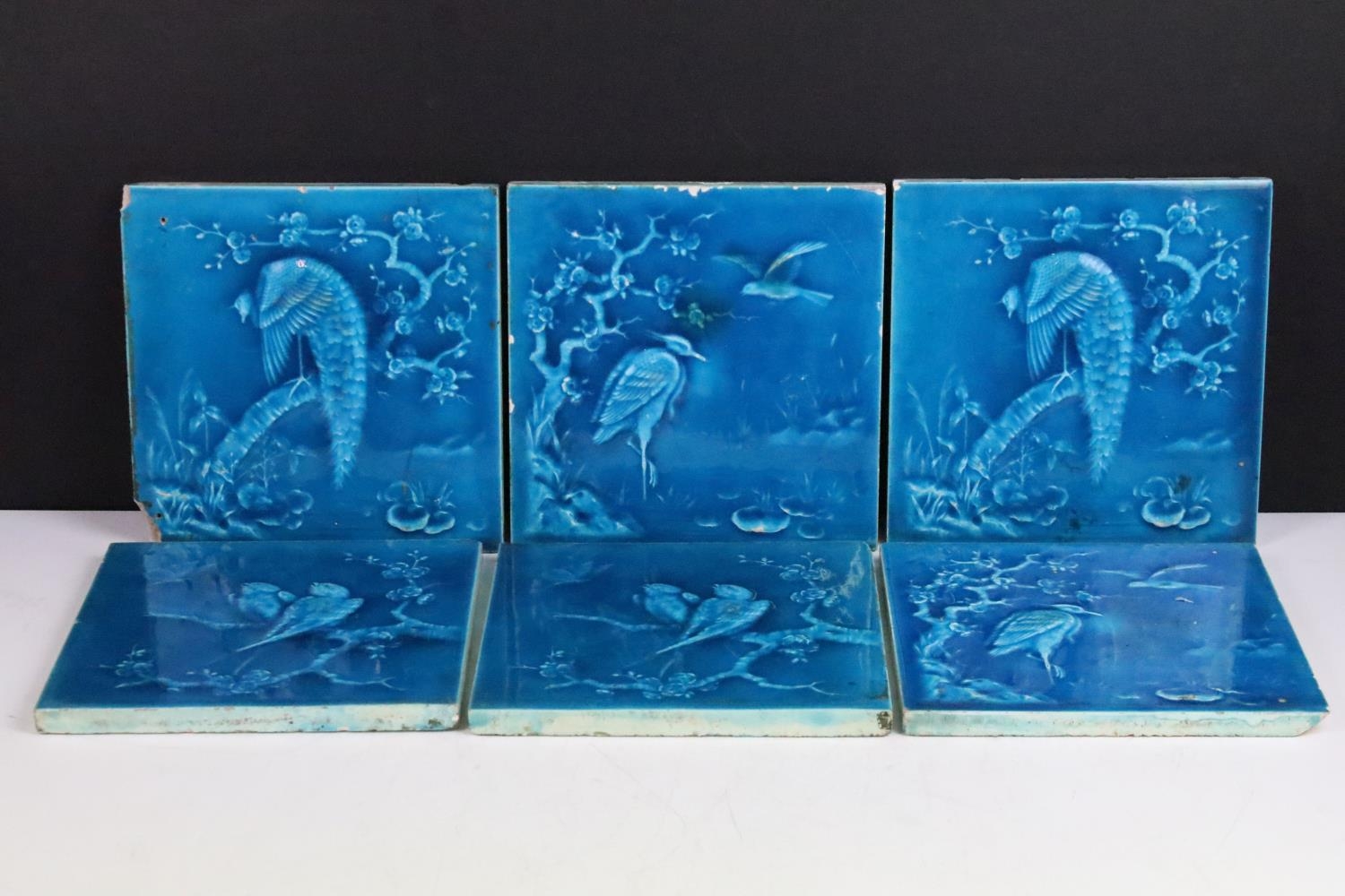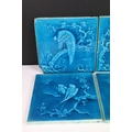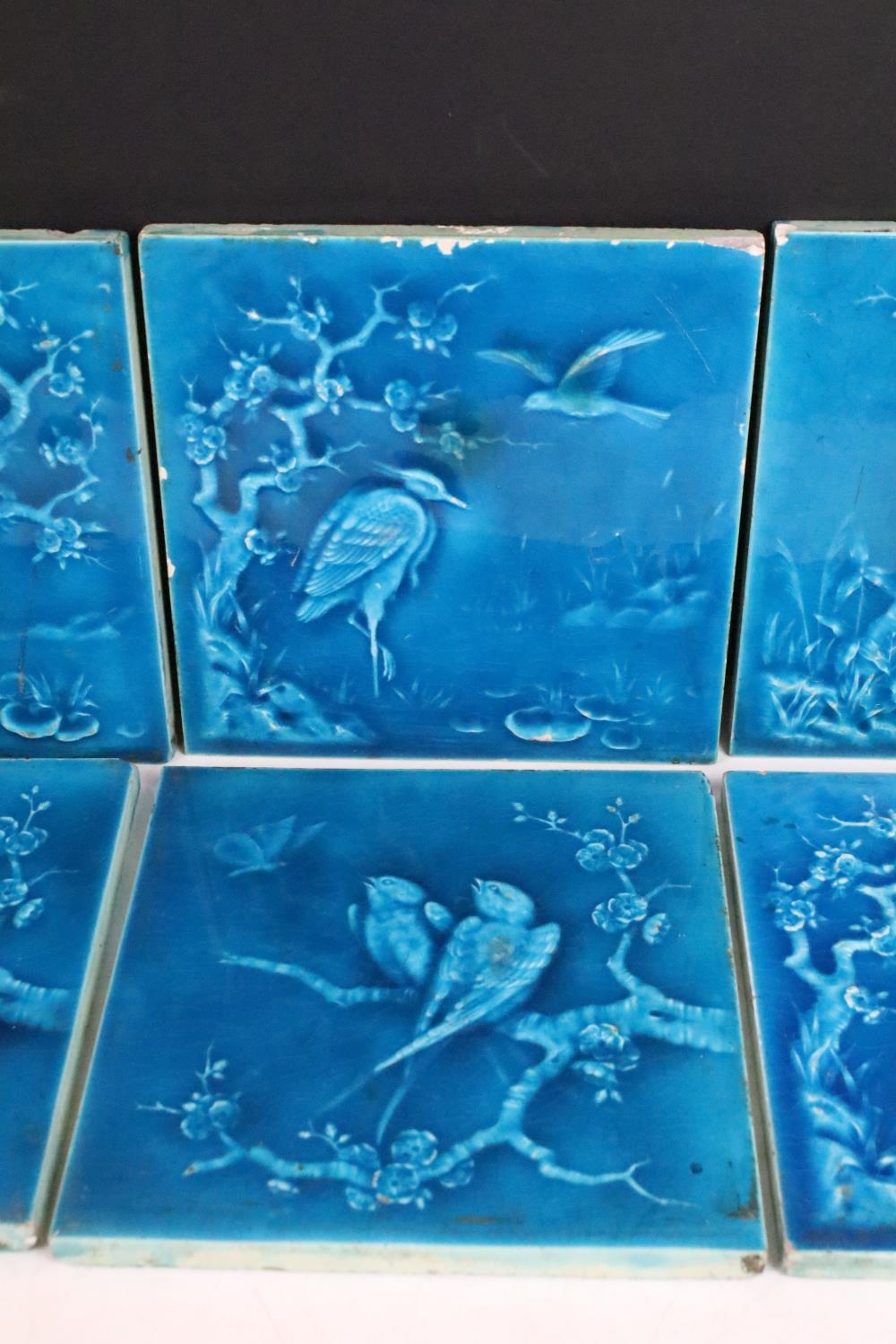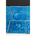 Six Minton aesthetic period tiles. Overall teal glaze, each design featuring a bird scene, unmarked.