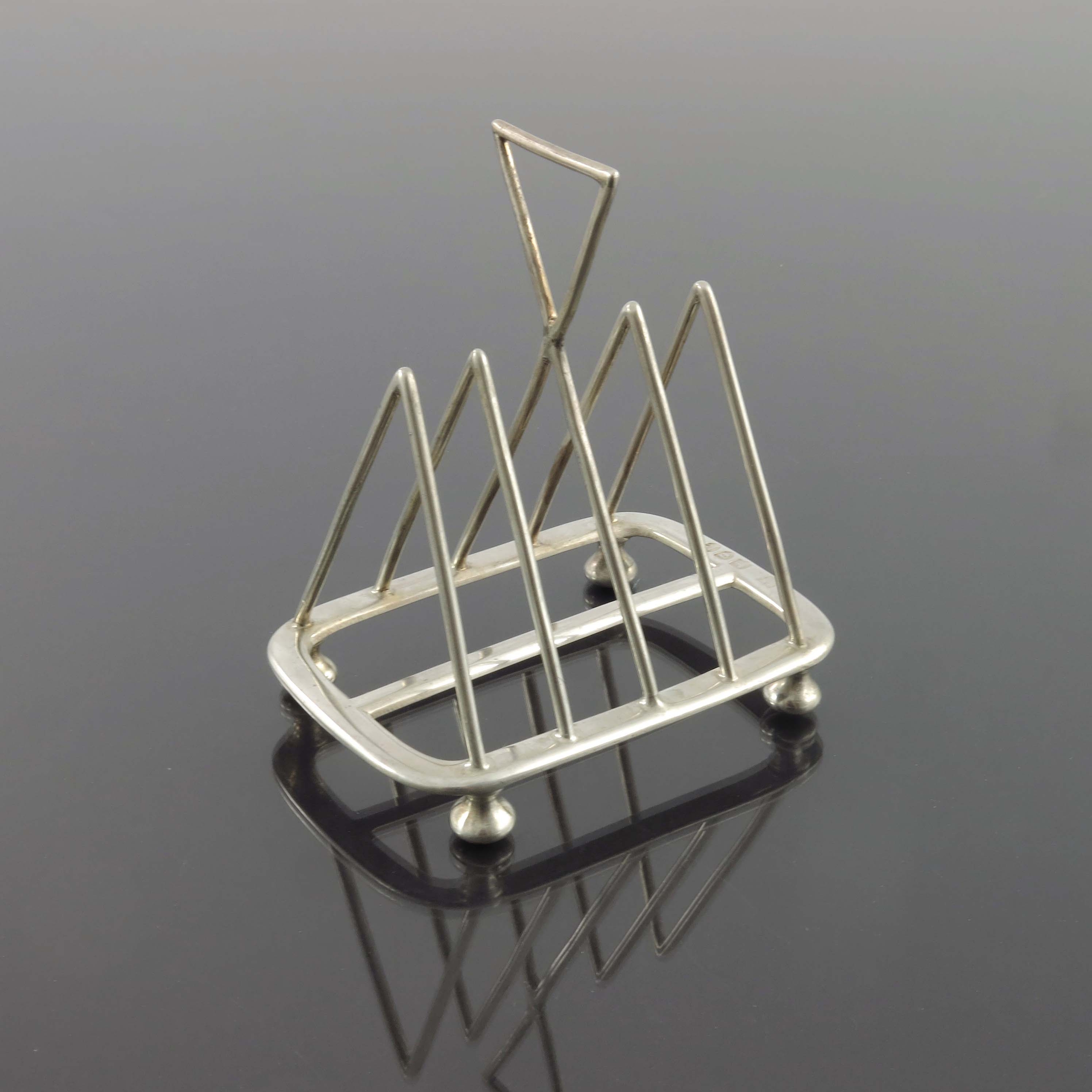 A Victorian silver four division toast rack, Henry Wilkinson and Co., London 1892, in the style of Christopher Dresser, triangular wire separators and handle on a rectangular base and knop feet, 10cm high, 3.46ozt