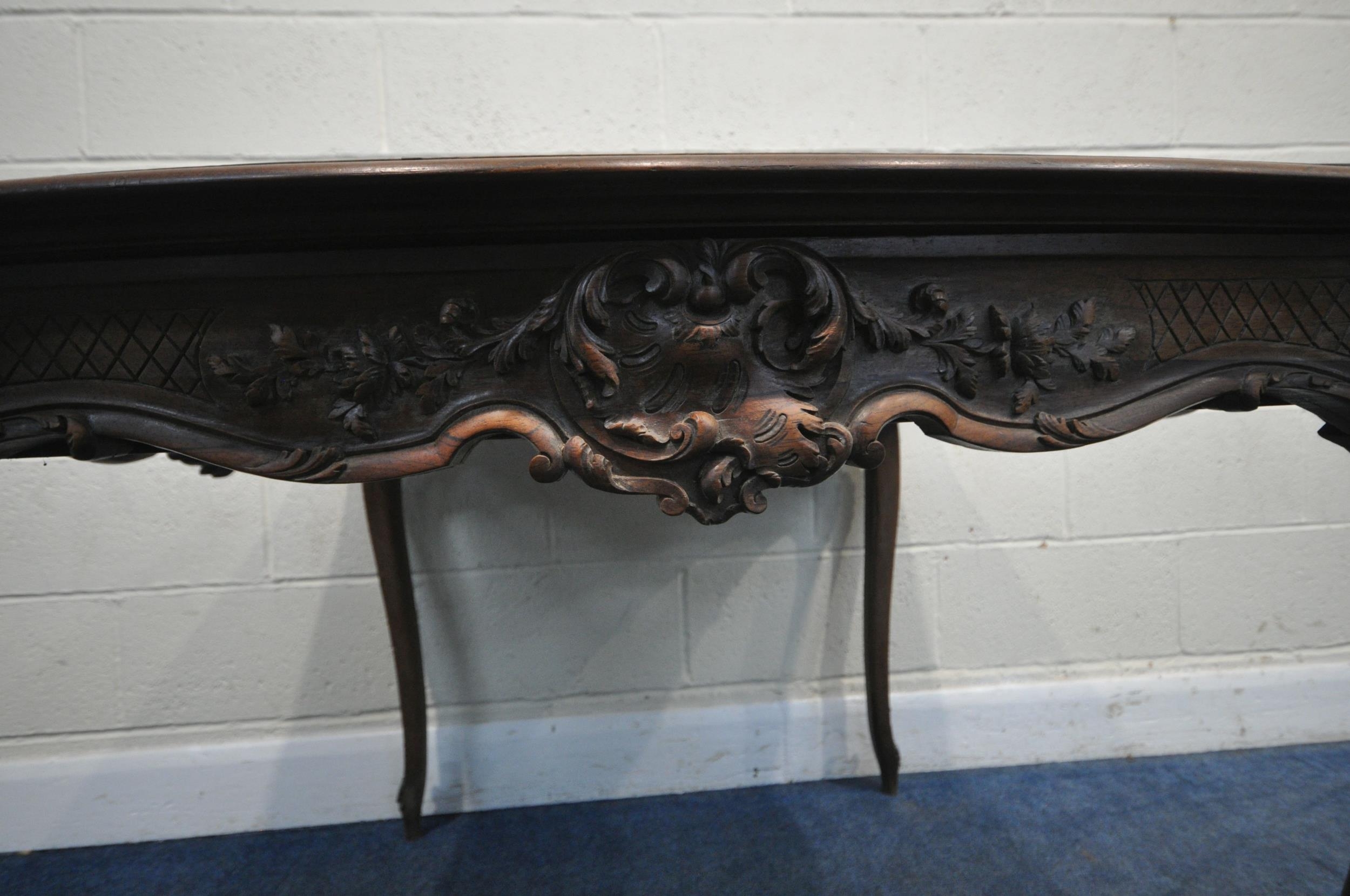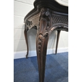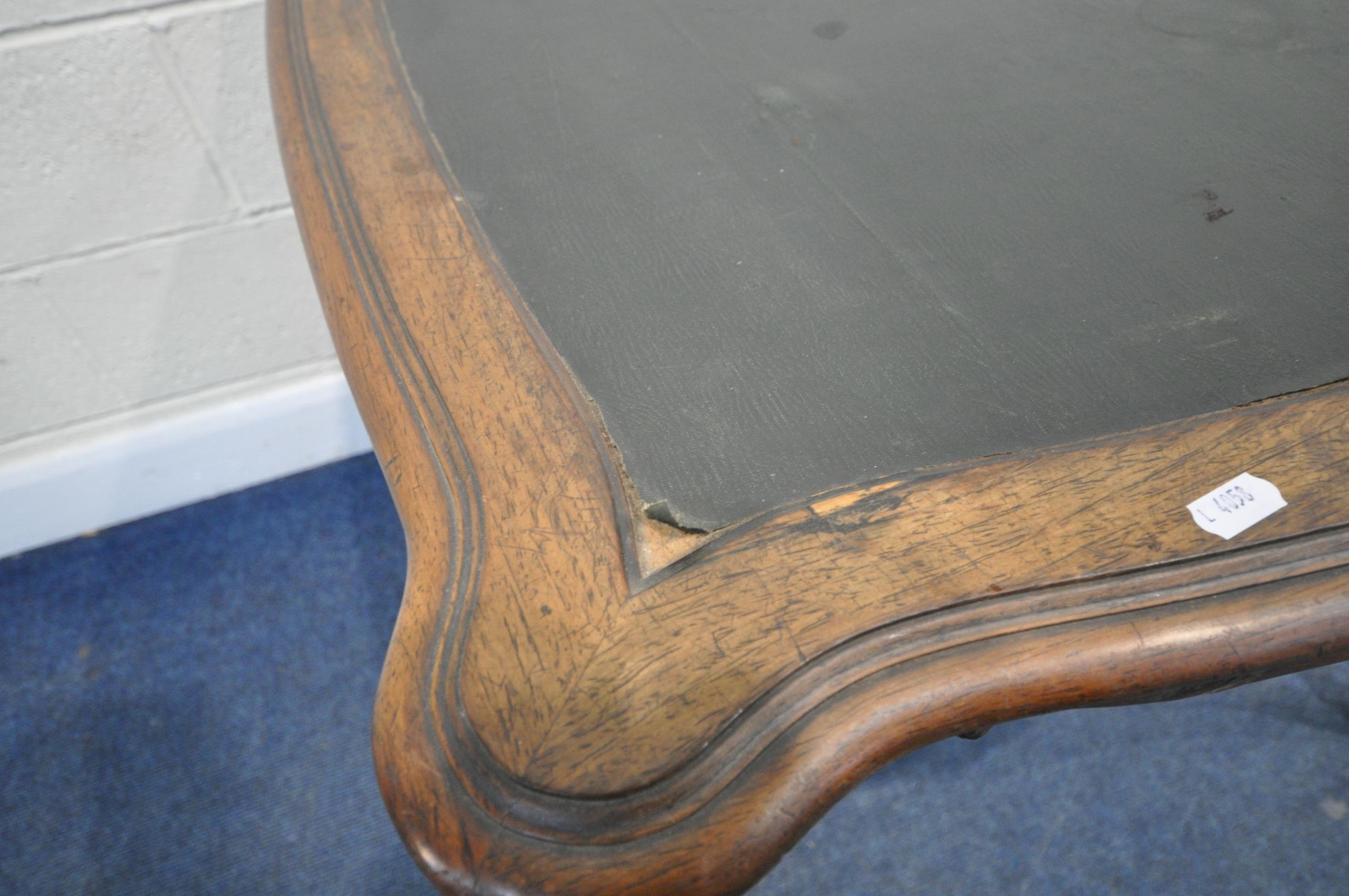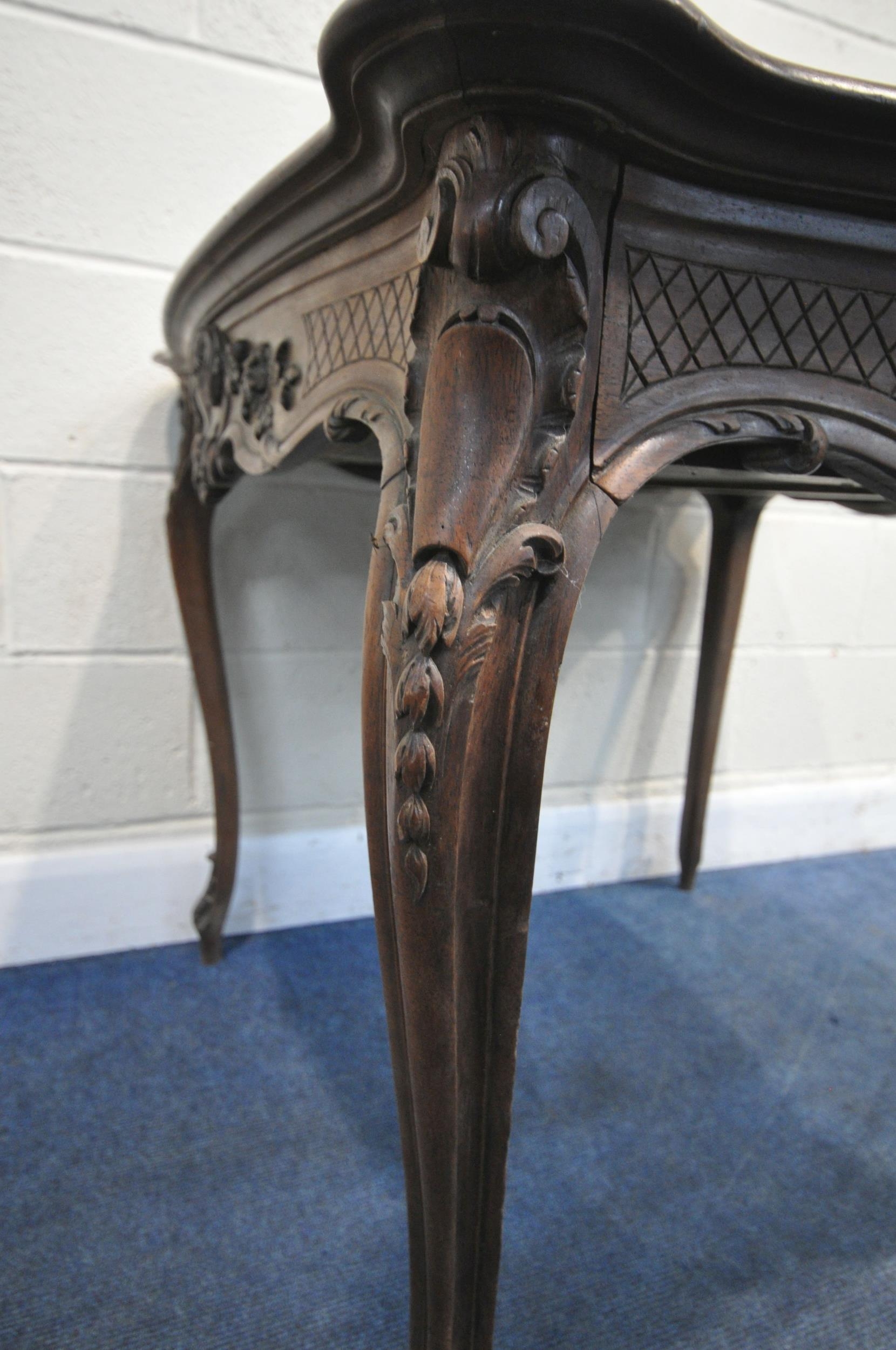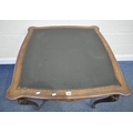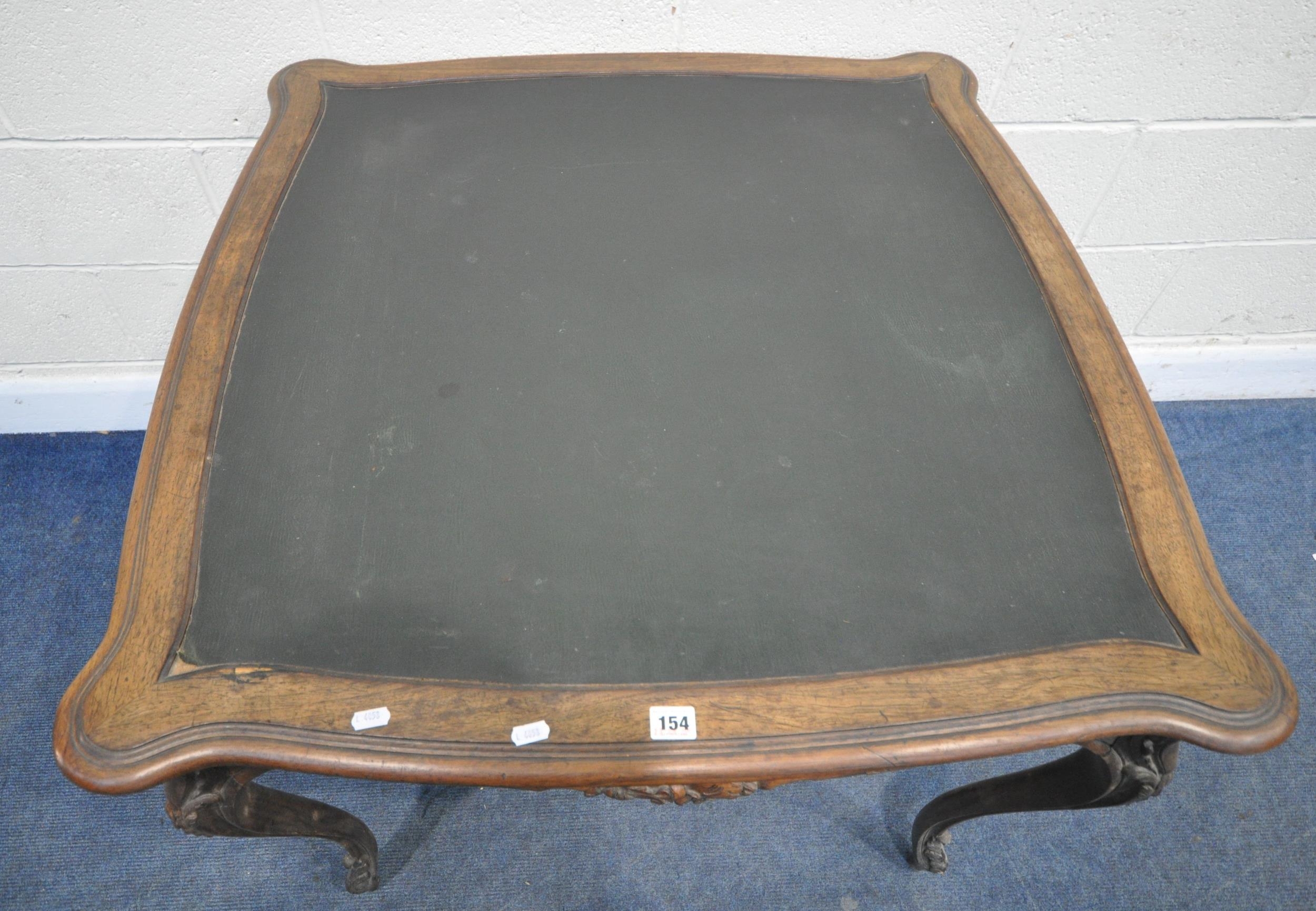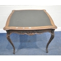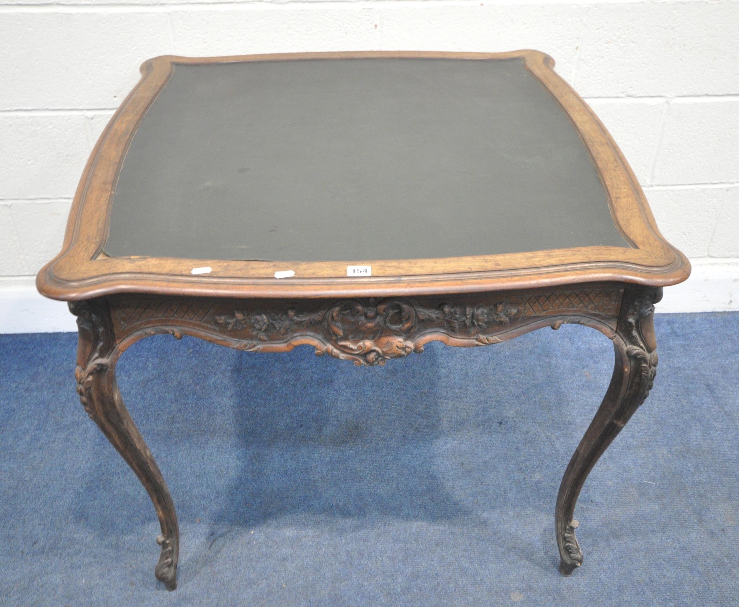 A 20TH CENTURY FRENCH GAMES TABLE, with a black leatherette playing surface, a single frieze drawer, scrolled and foliate details, raised on cabriole legs, 92cm squared x height 76cm, condition report: leatherette surface play worn, lifting, other historical wear and usage