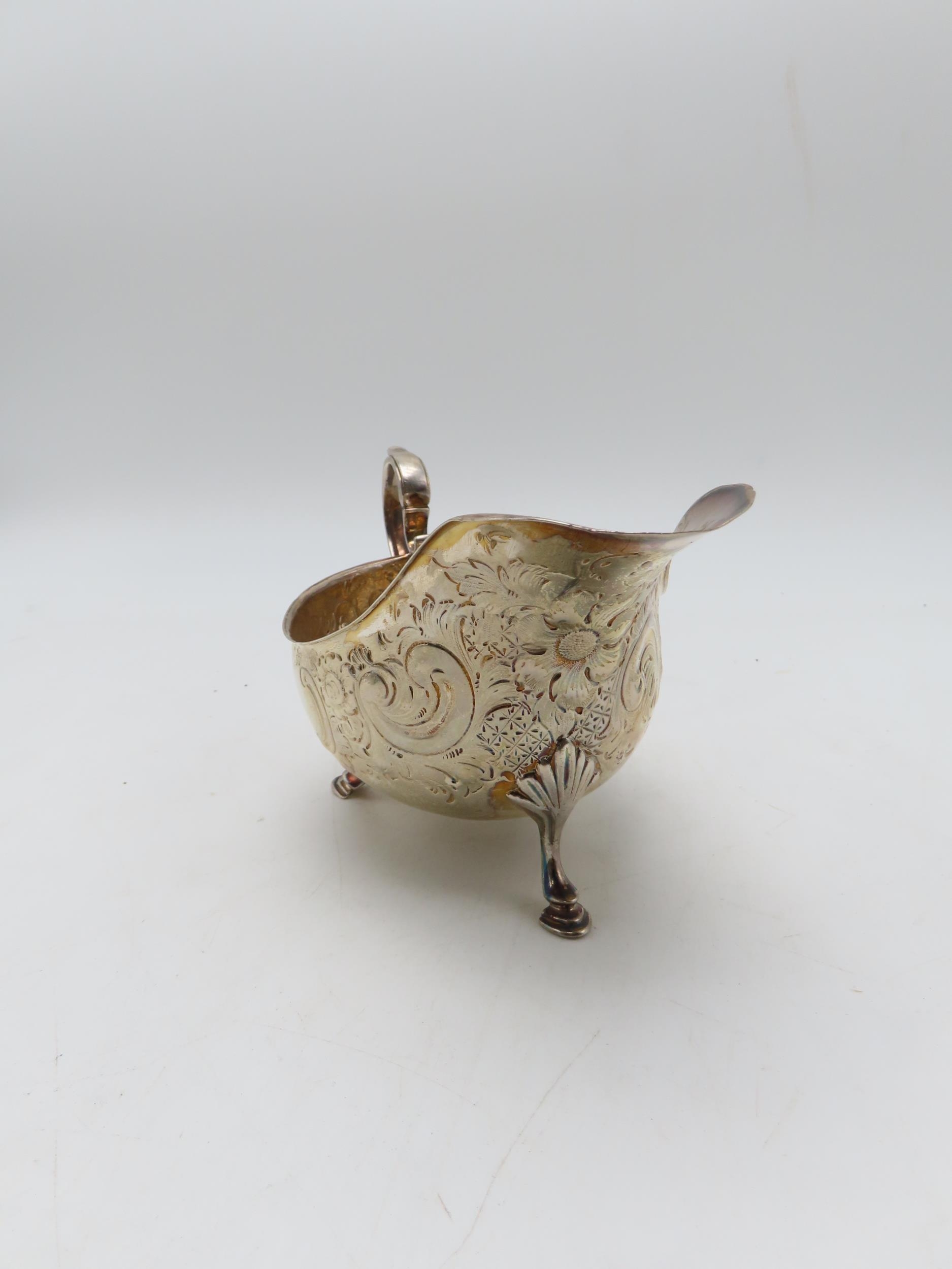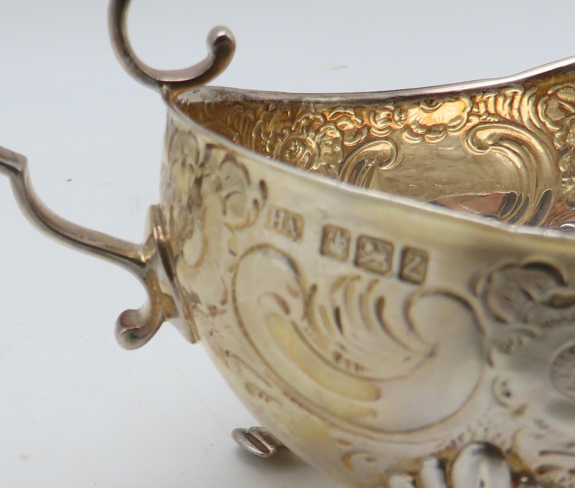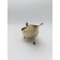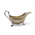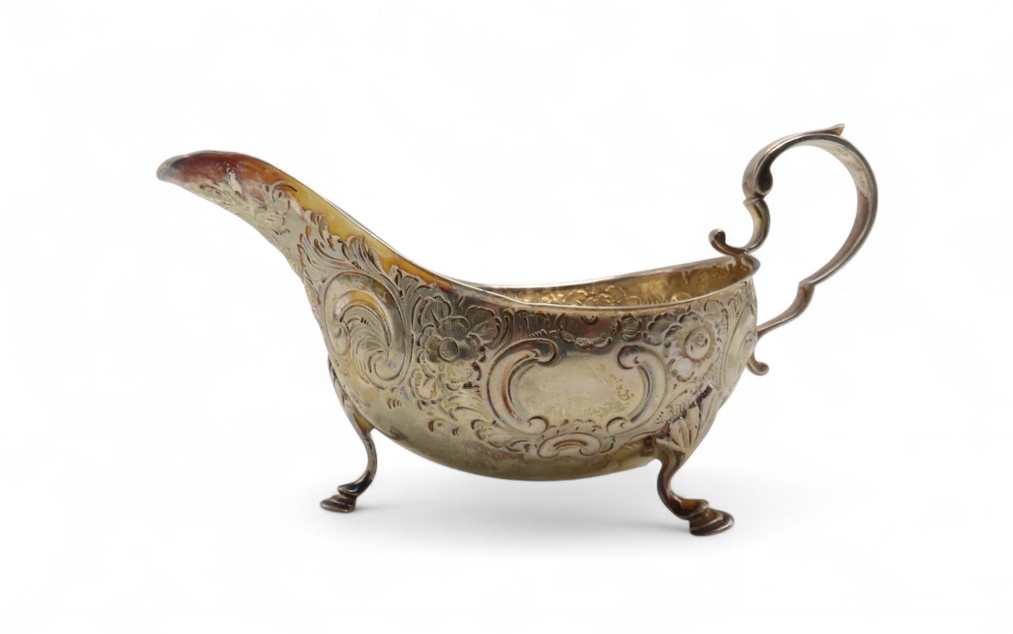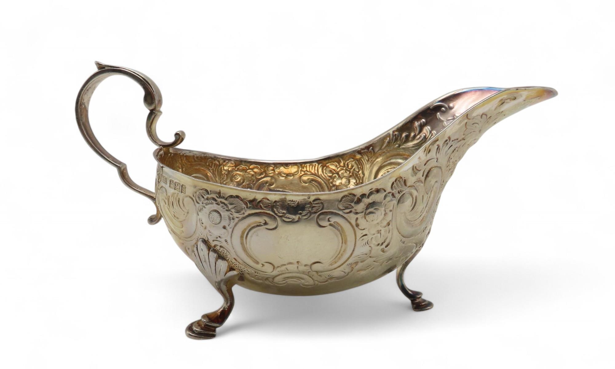A silver sauceboat, by Atkins Brothers Ltd, Sheffield 1902, with embossed scrolling foliate decoration, on four hoof feet, with a scroll-capped handle, 204gms