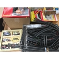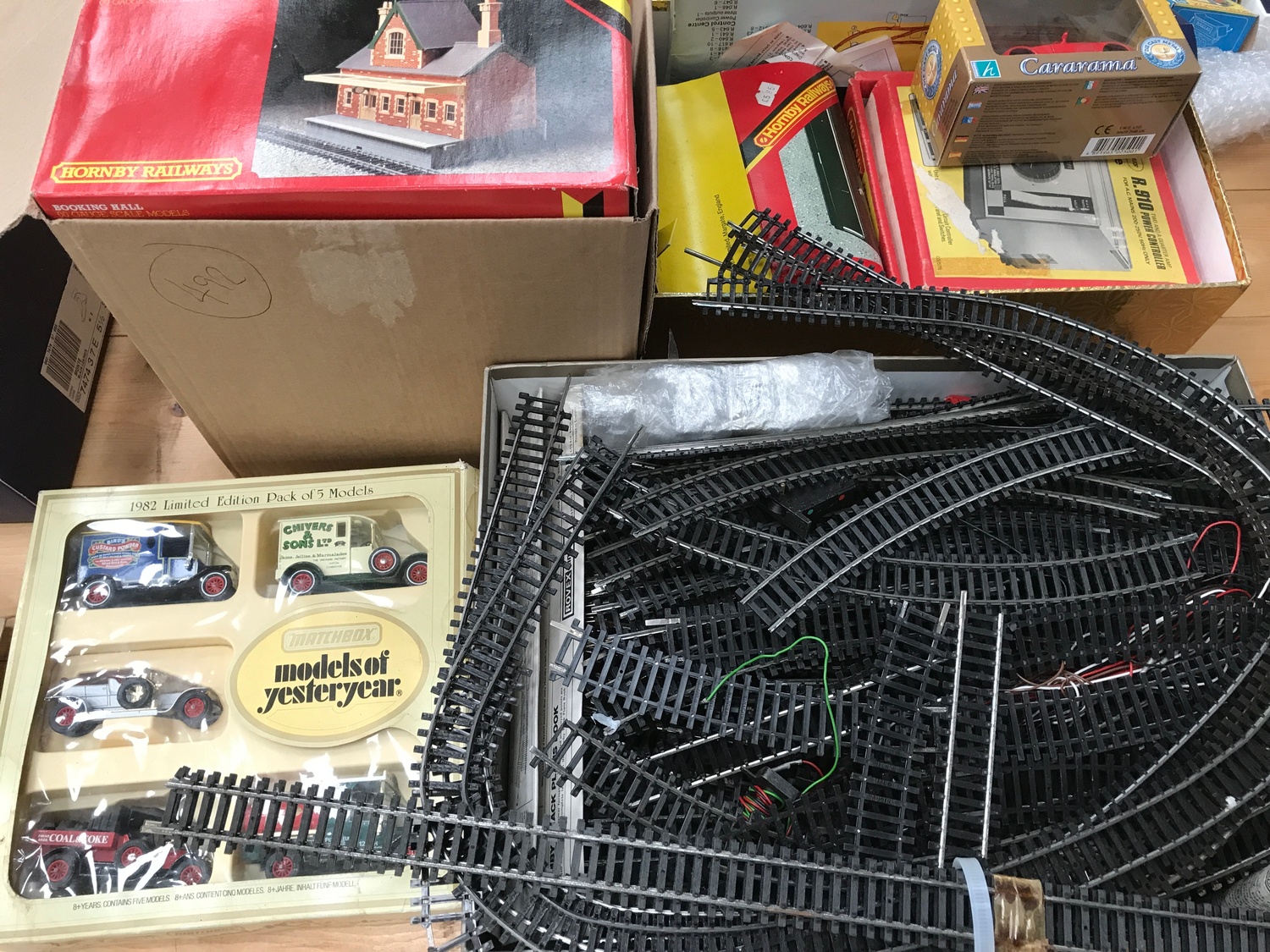 QUANTITY OF 00 GUAGE MODEL RAILWAY TRACK, SMALL QUANTITY ROLLING STOCK, ORIGINAL HORNBY POWER UNIT R910 TOGETHER WITH R902, SUNDRY CATALOGUES, BOOKING HALL, WIRES ETC, MATCHBOX MODELS OF YESTERYEAR 5 CAR SET AND A BOXED CARARAMA CAR