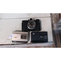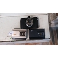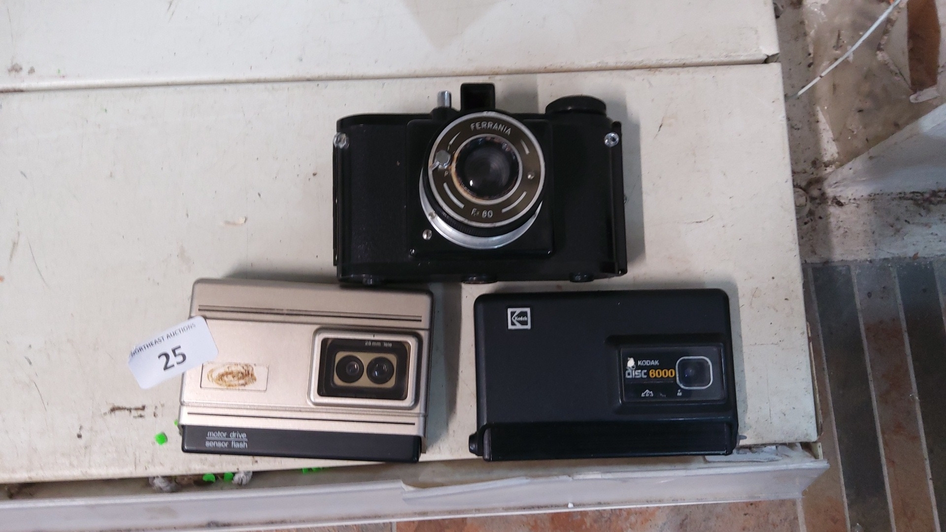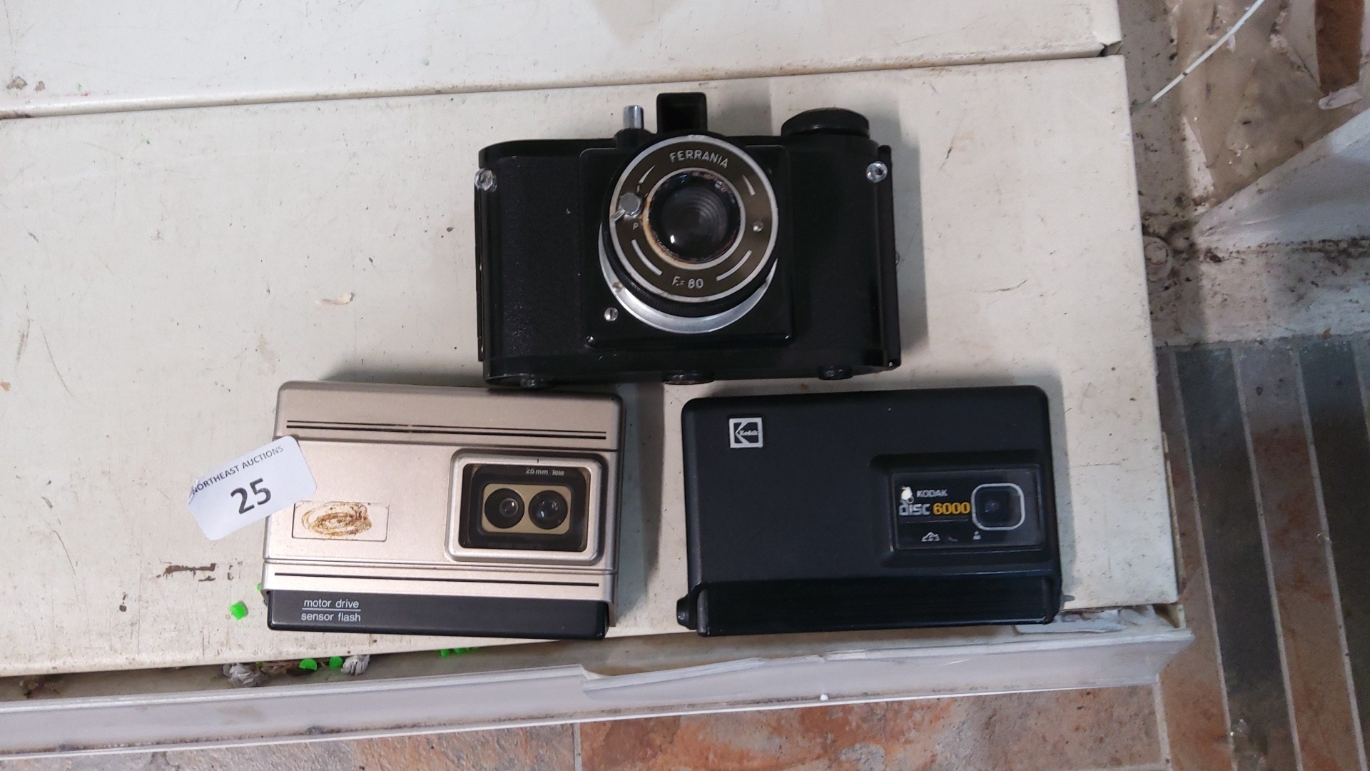 A group of three cameras, including a Kodak Disc 6000 compact camera, a silver-toned compact camera labelled ‘motor drive’ and ‘sensor flash’, and a black box camera fitted with an f/80 ‘FERRANIA’ lens.