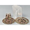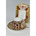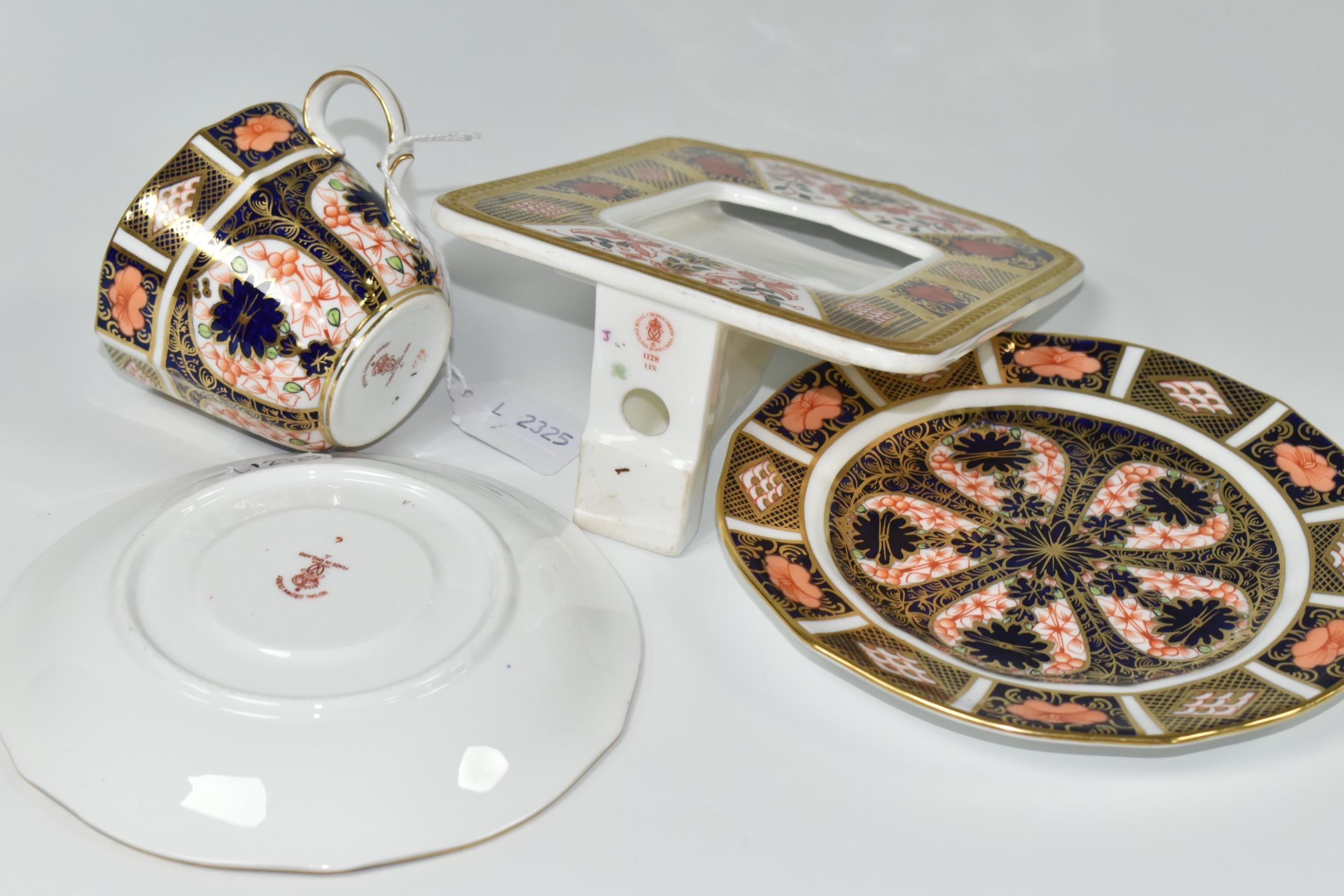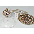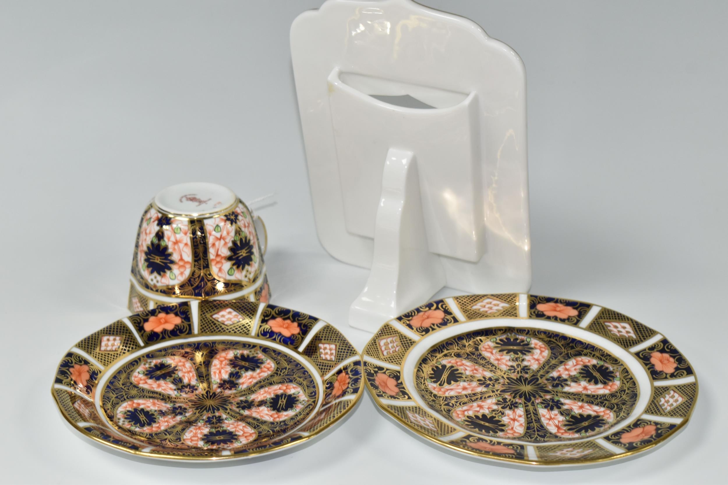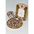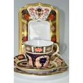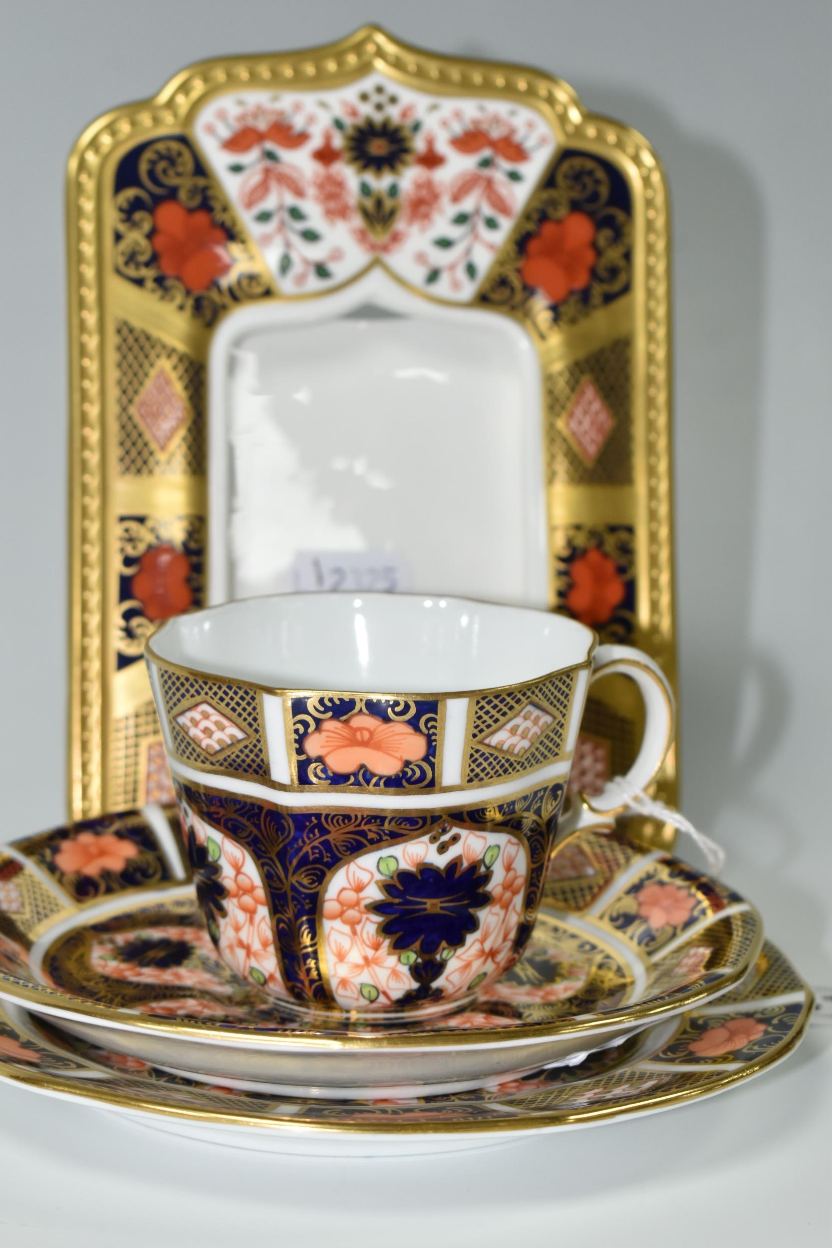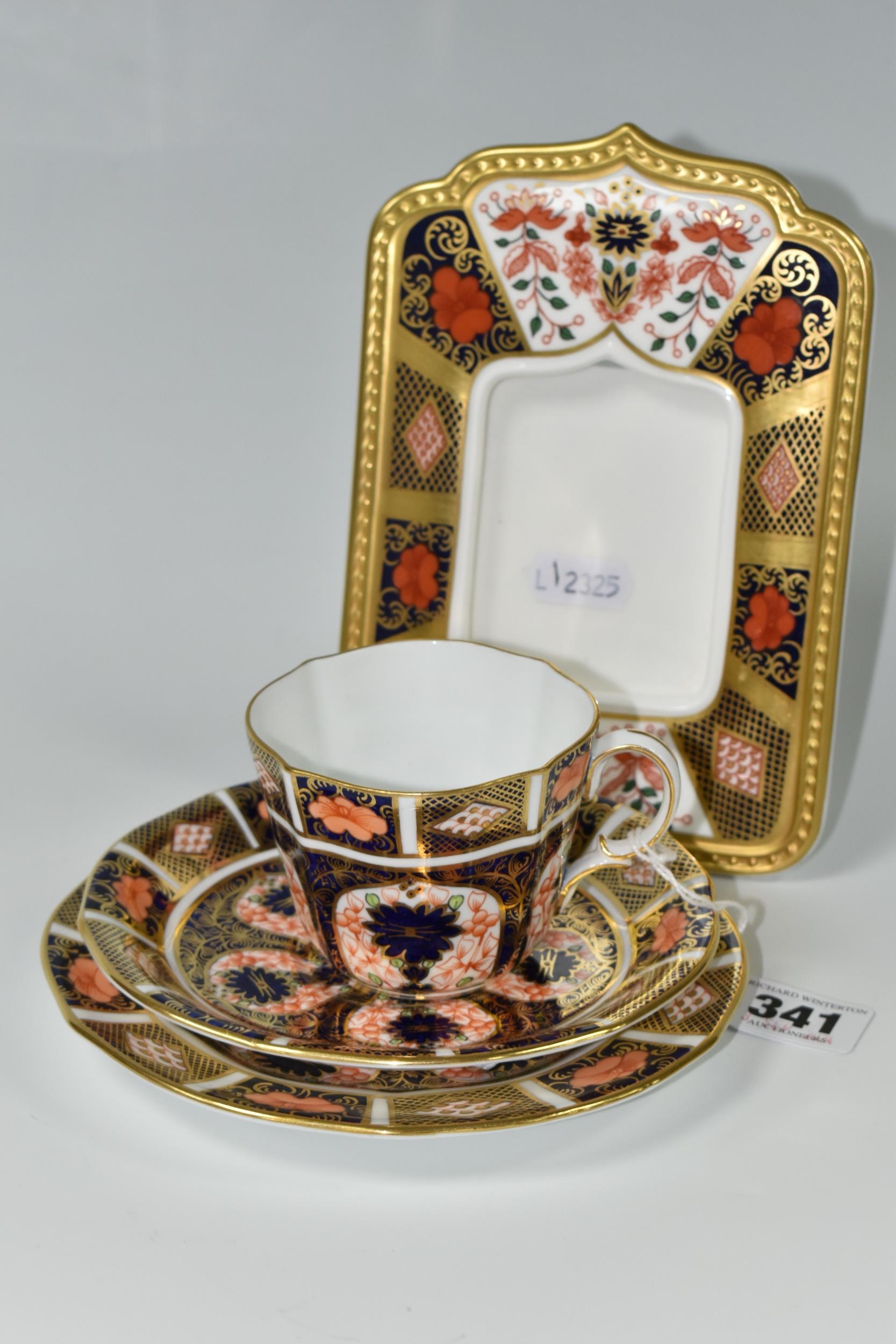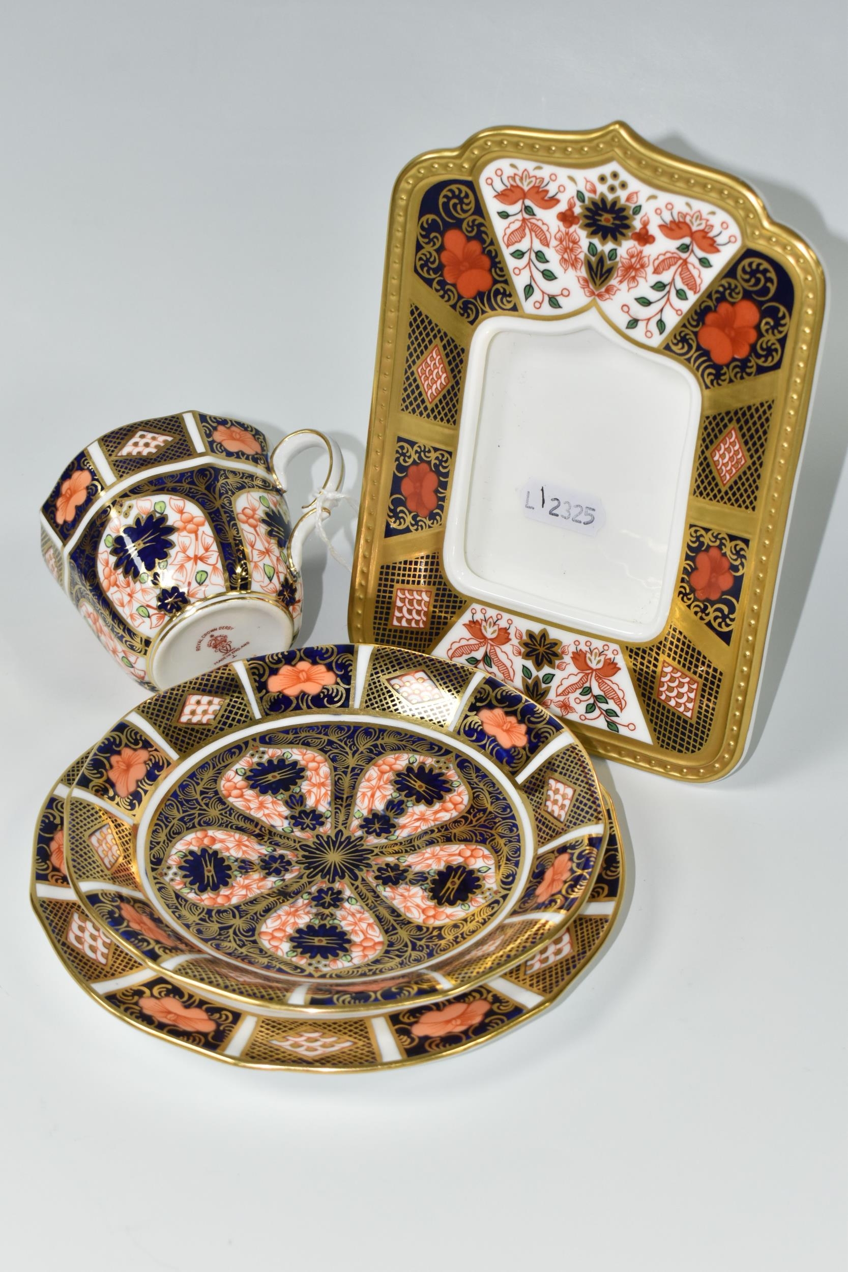 A ROYAL CROWN DERBY IMARI PHOTOGRAPH FRAME AND TRIO, in 1128 pattern, the photograph frame with 'solid gold' bands, red backstamp and date cypher for 1996, each piece of the trio bearing the date cypher for 1922 (4) (Condition Report: all pieces appear in good condition, no obvious damage, signs of light use)