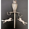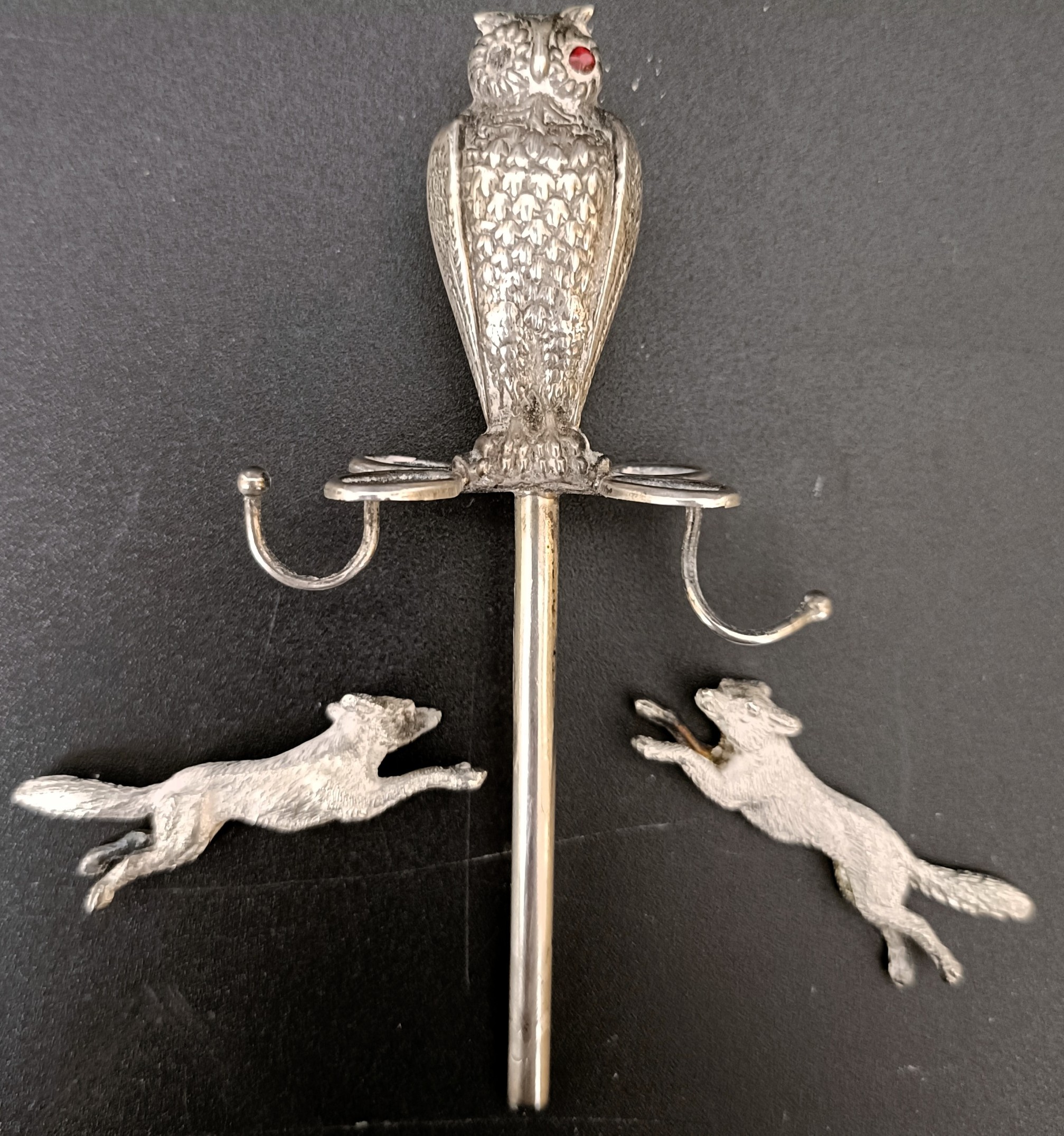 A silver coloured metal ring holder, with an owl finial, lacking base, and a pair of silver coloured metal foxes, 0.7 ozt