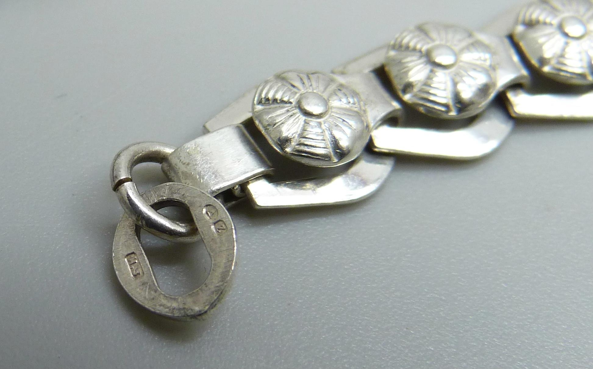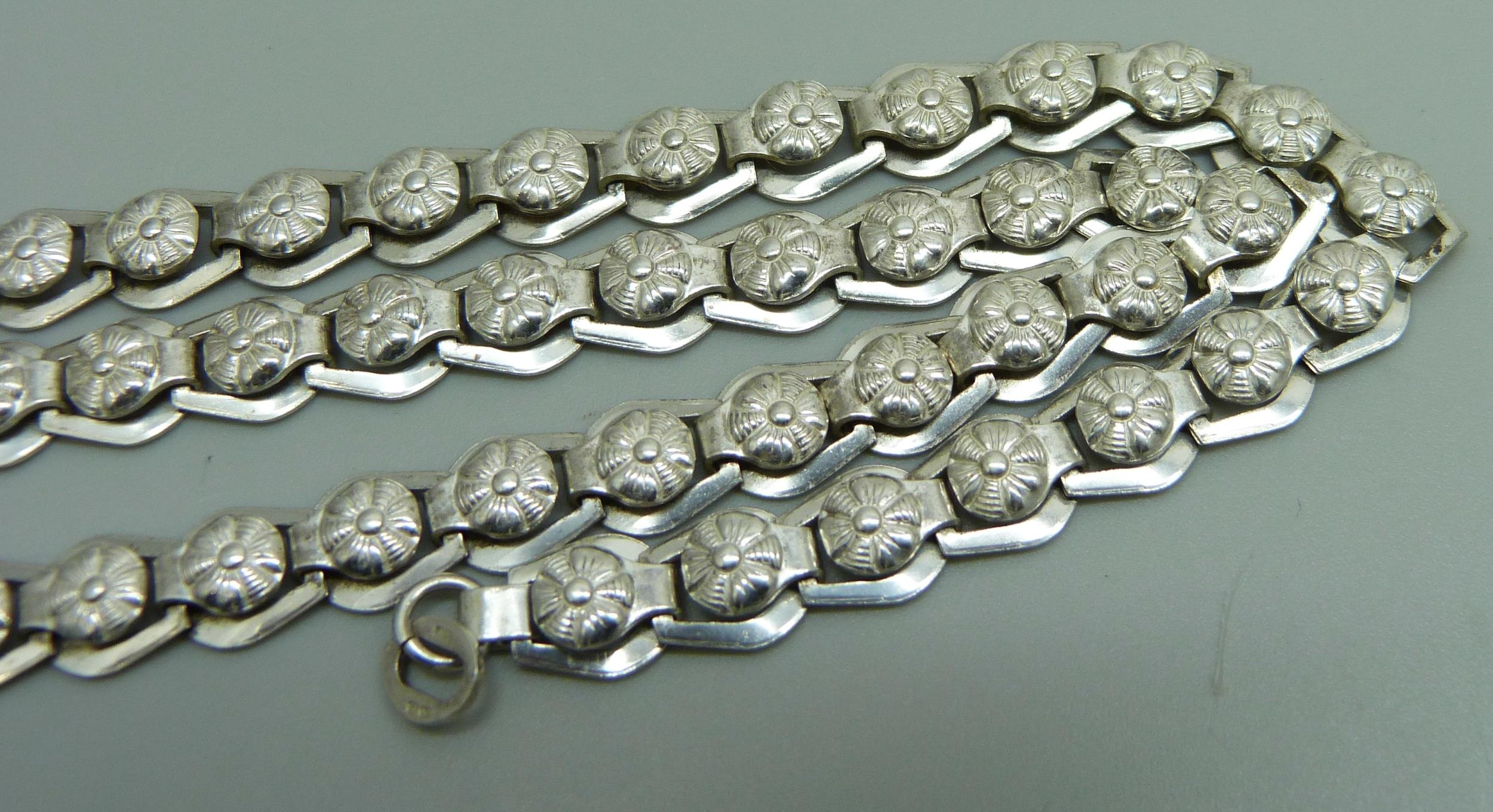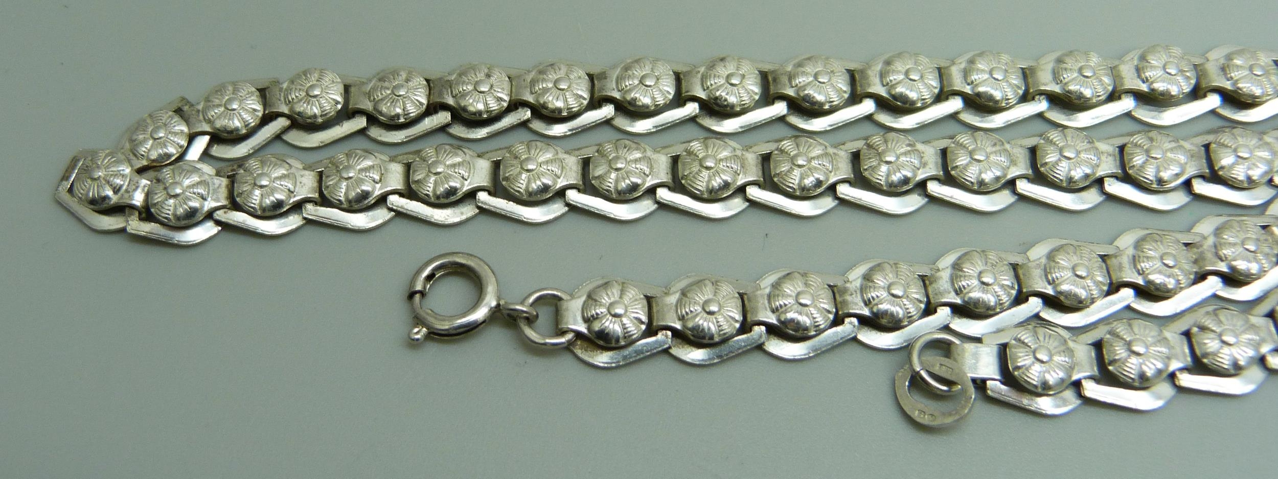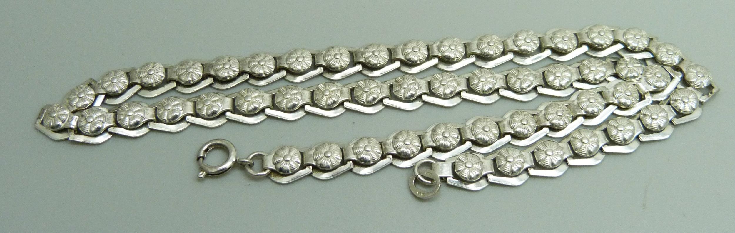 A silver articulated necklace with Art Nouveau style links, possibly Scandinavian, Birmingham import mark, 23g, 41cm