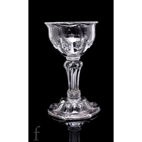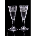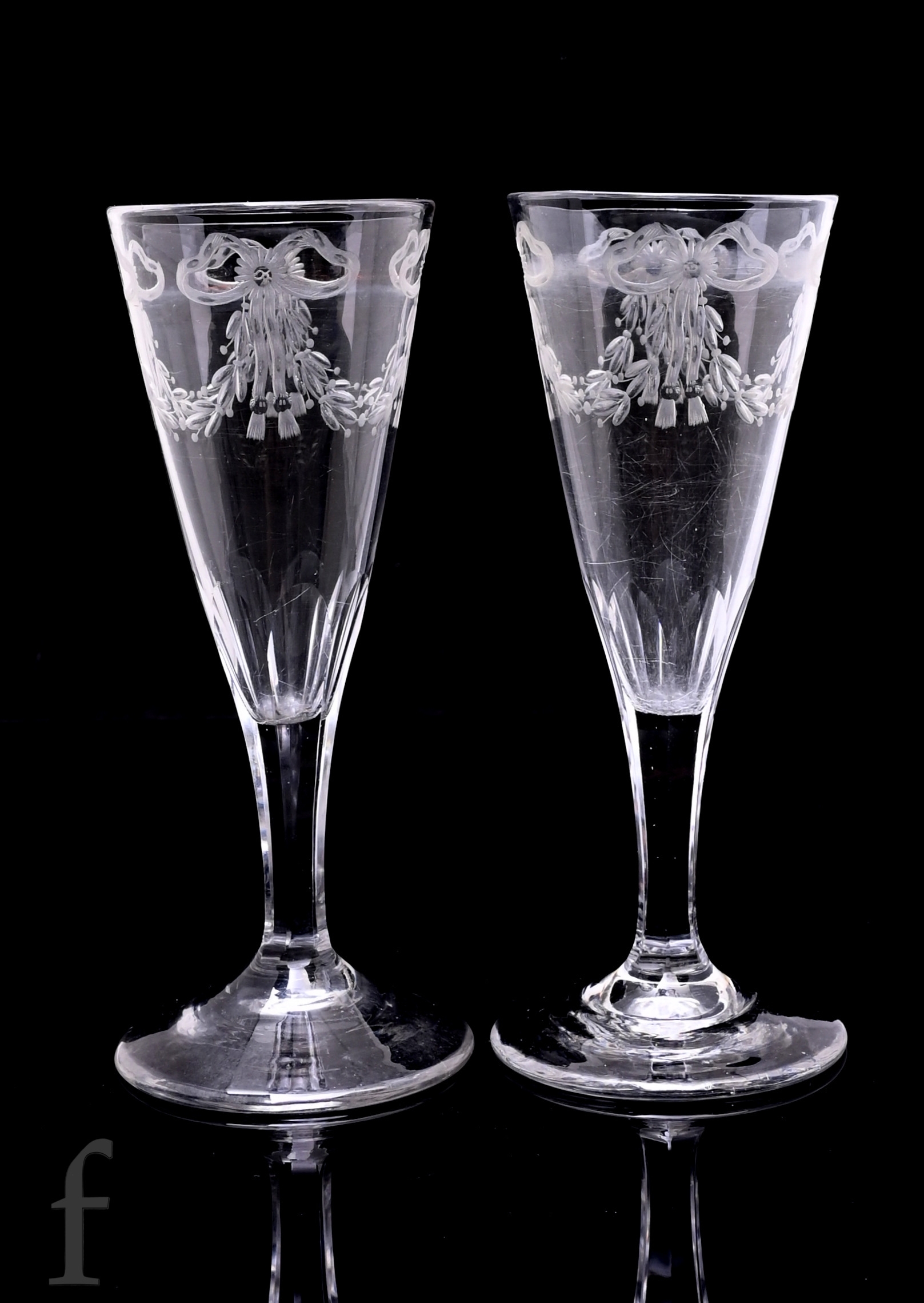 A pair of late 19th Century clear crystal drinking glasses in the 18th Century taste, each with a slender conical bowl with engraved ribbon tied floral garland above a slice cut stem and shallow conical foot, height 16cm. (2)