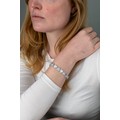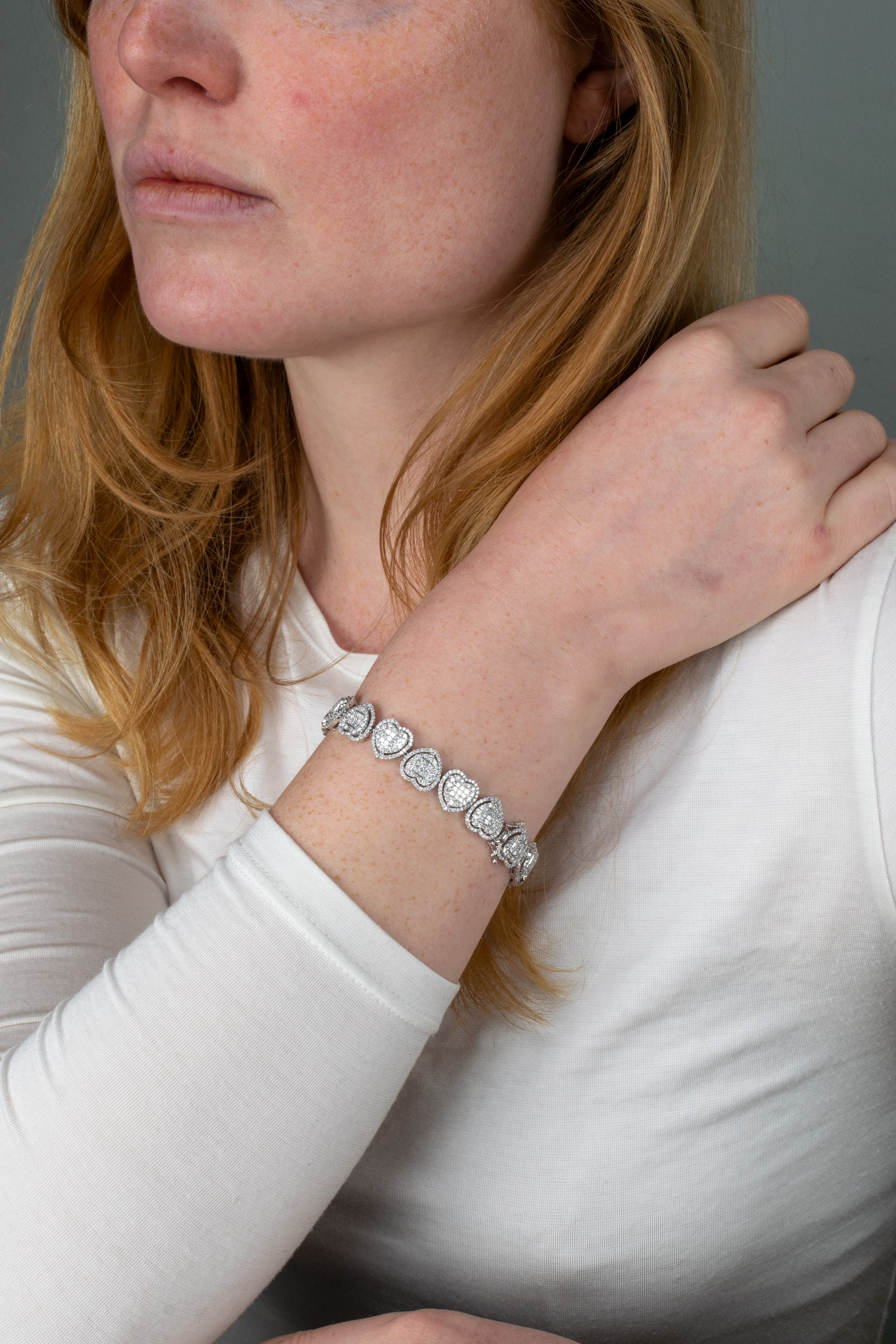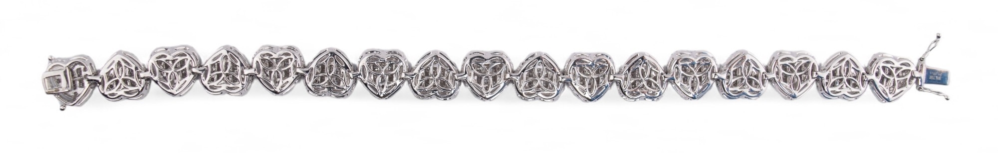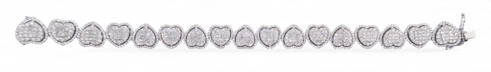 An 18k white gold diamond heart-shaped sectioned bracelet, composed of seventeen sections, each set to the centre with nine invisibly-set princess-cut diamonds, within a two-row surround of brilliant-cut diamonds. Total weight of diamonds 9 - 10 carats, F-G colour, VS clarity.