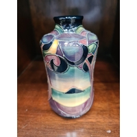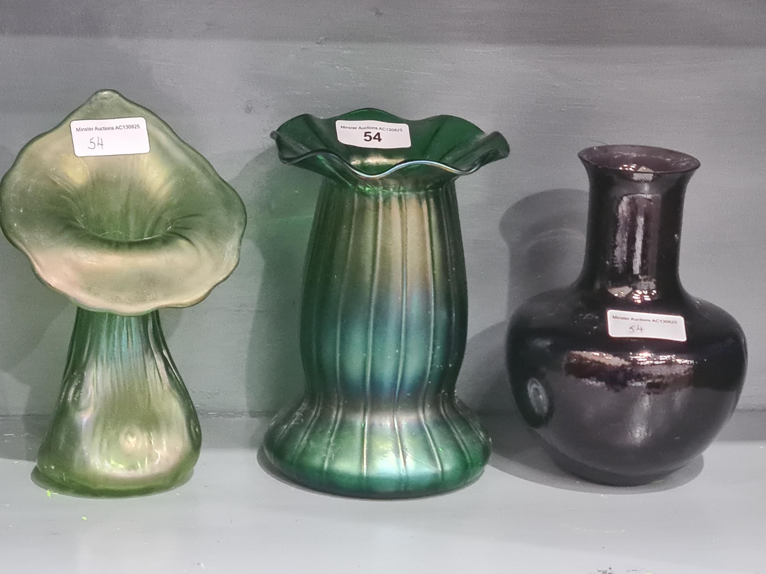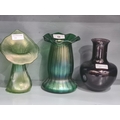 An Art Nouveau Loetz type green glass Vase with blue rim,6in, green glass Pulpit Vase, 7in and a Caithness amethyst Vase with sinuous floral design, 6in (CAB)