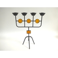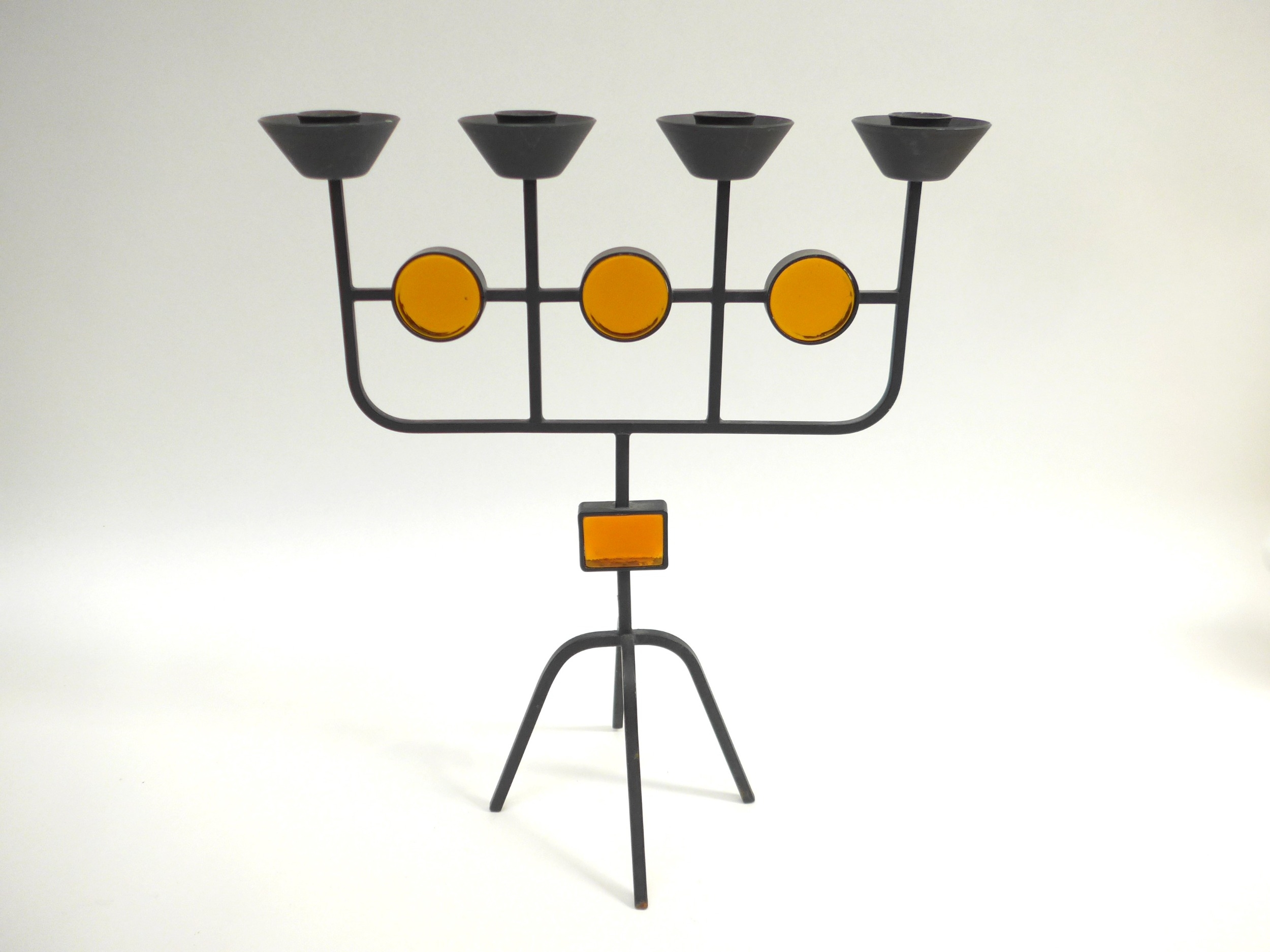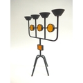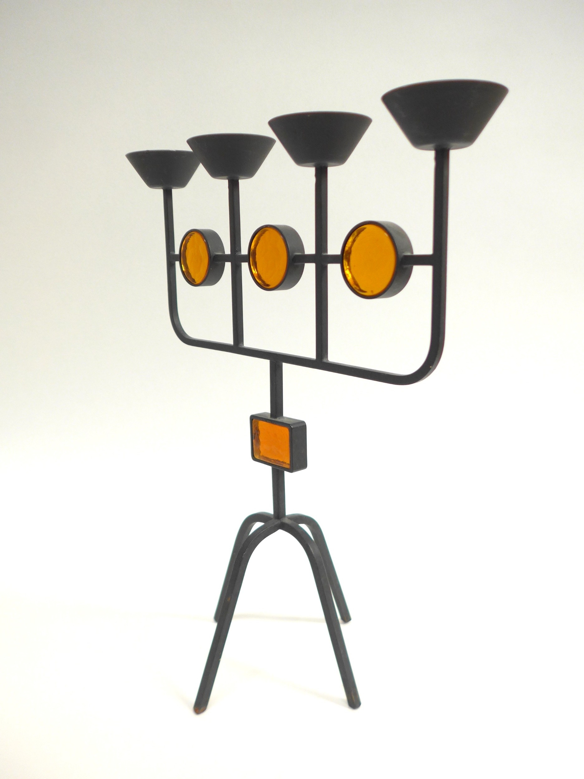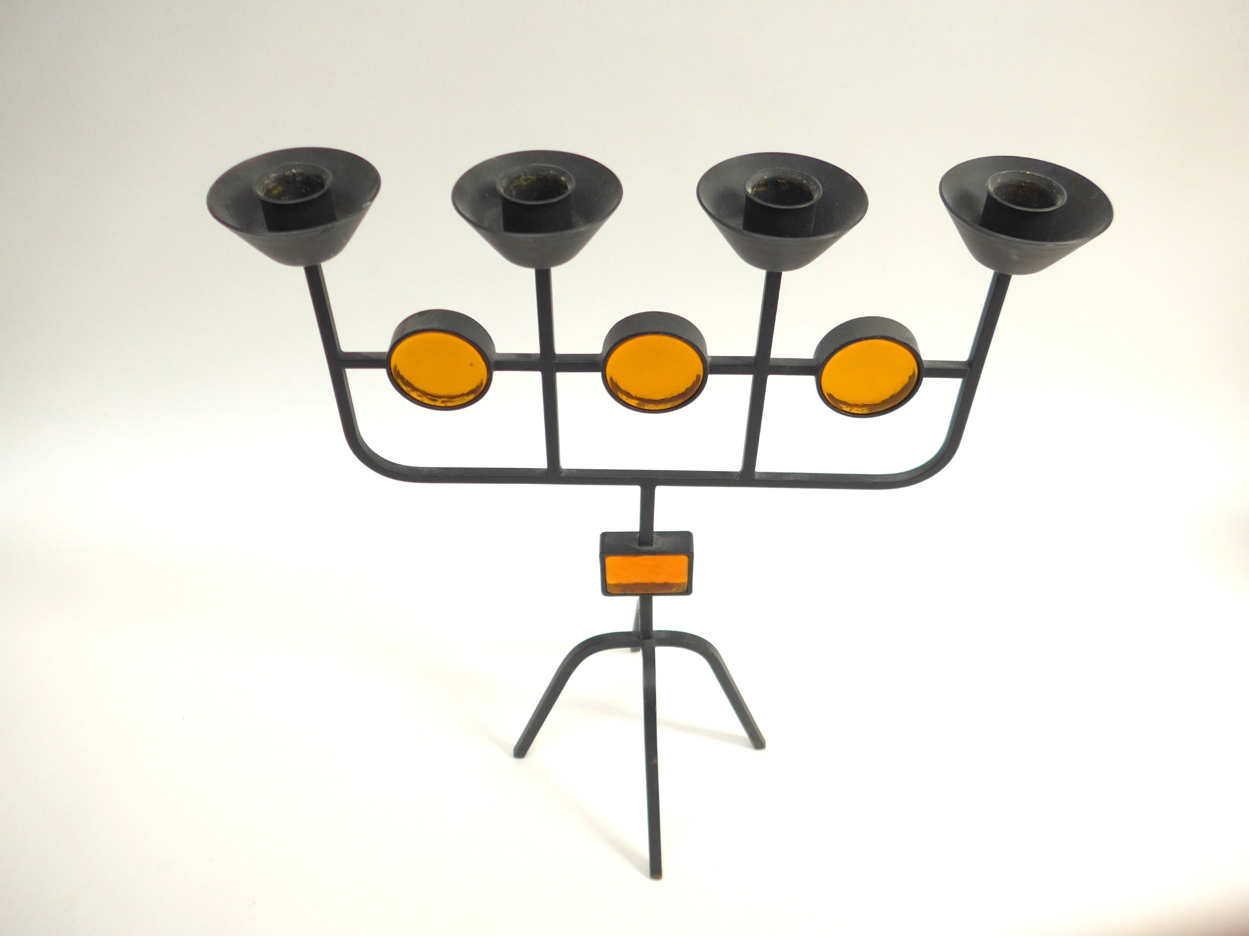 A Swedish candle holder by Gunnar Ander (1908-1976) for Ystad Metal, c1960's in iron and amber glass. 33cm high x 28.5cm wide
