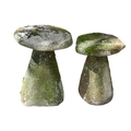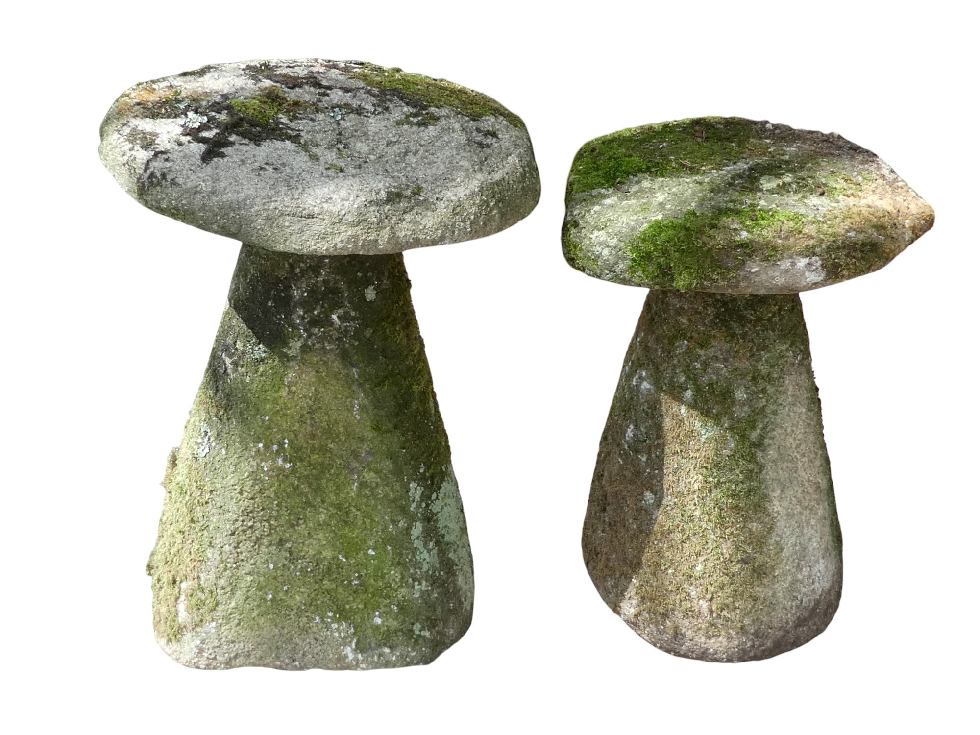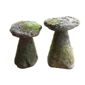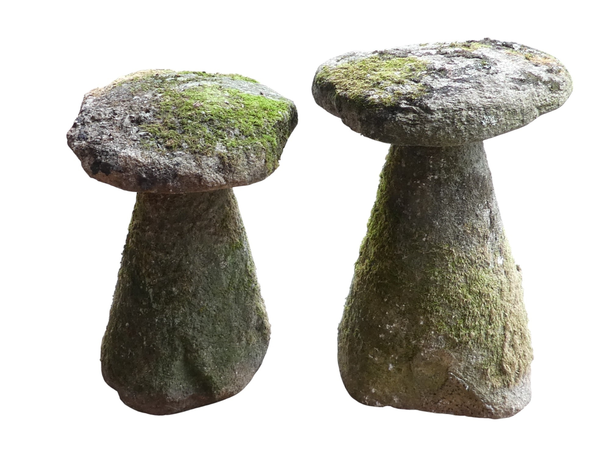 Two granite staddle stones - with domed tops and circular tapering bases, one 67cm high, the other 63cm high.