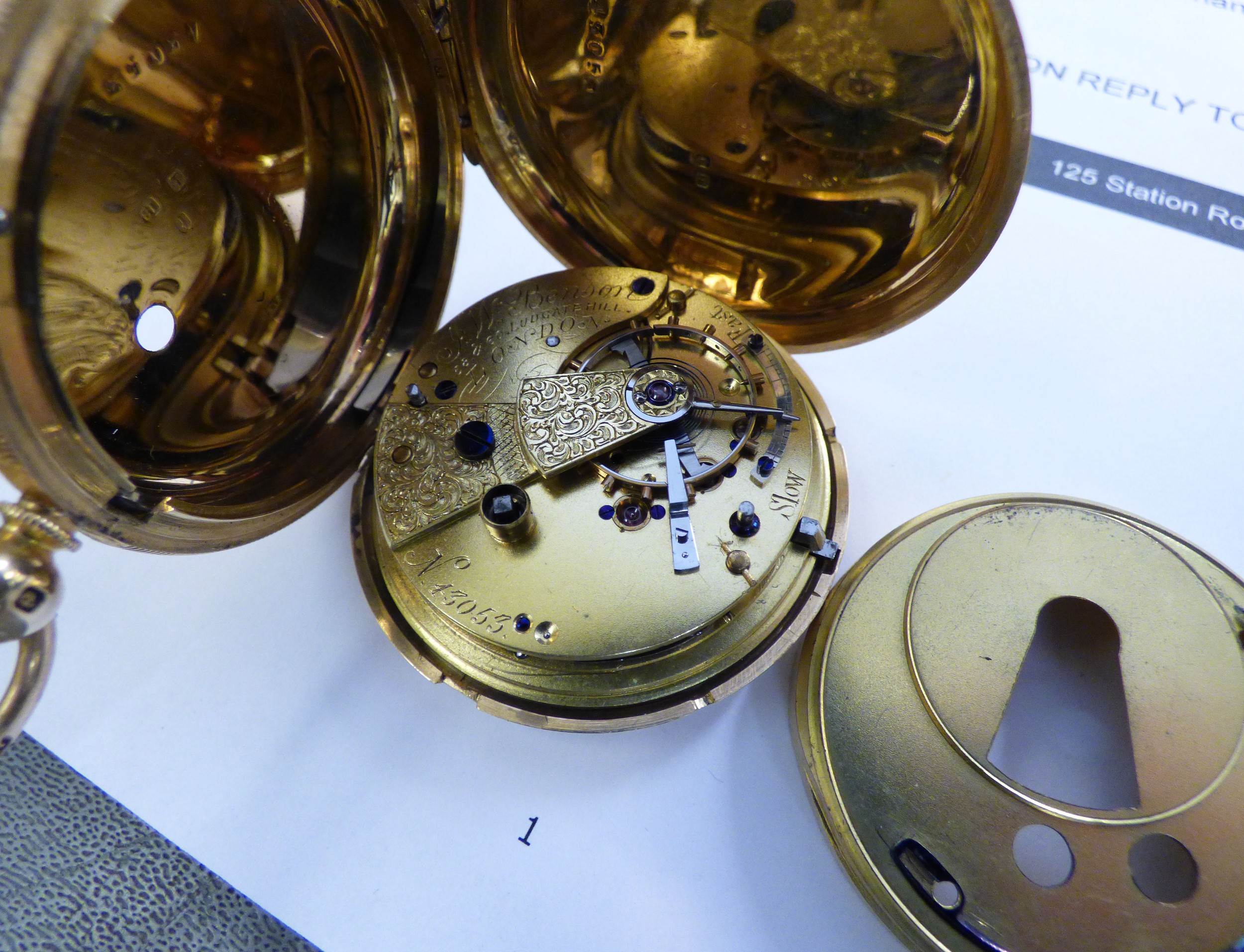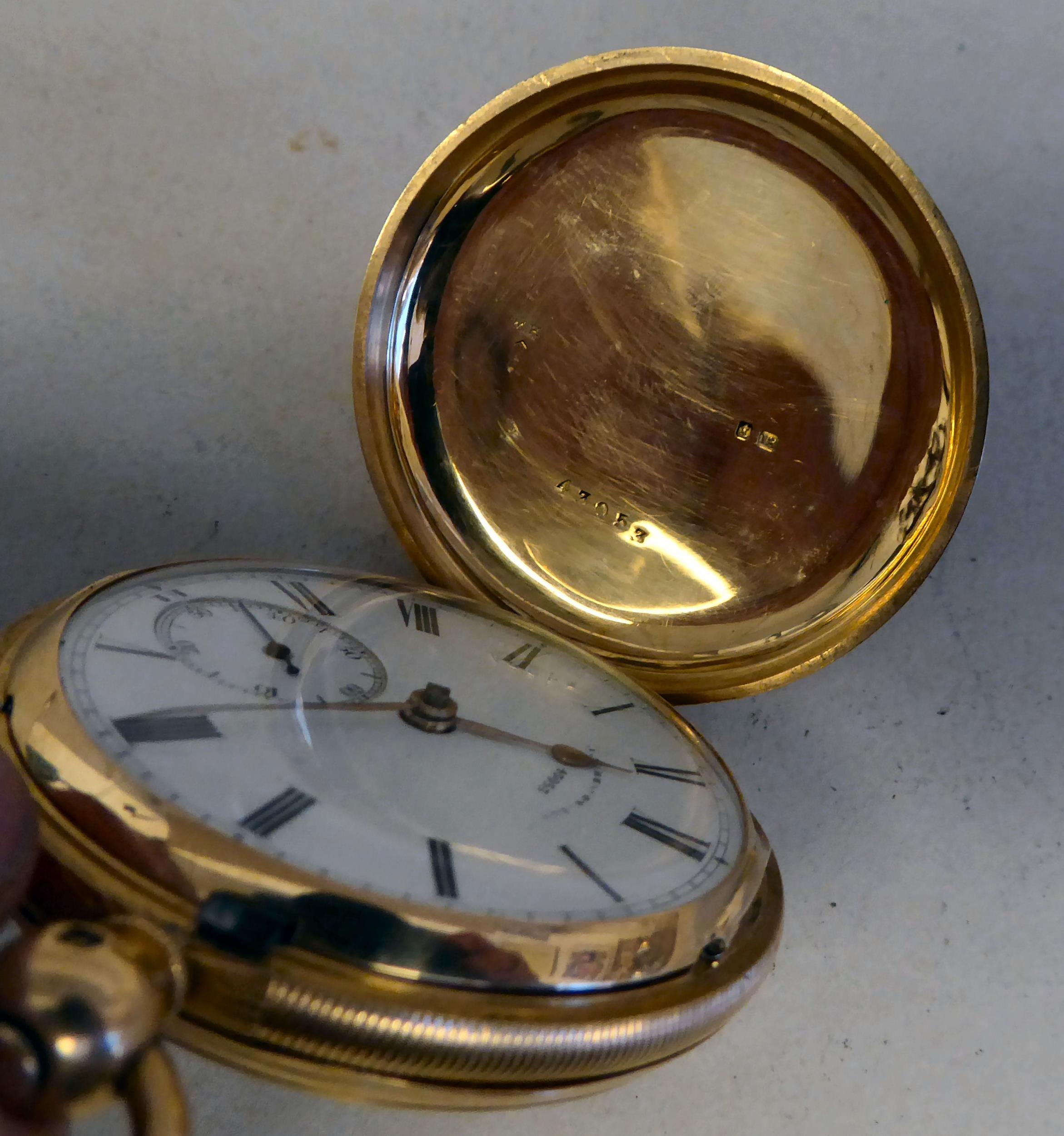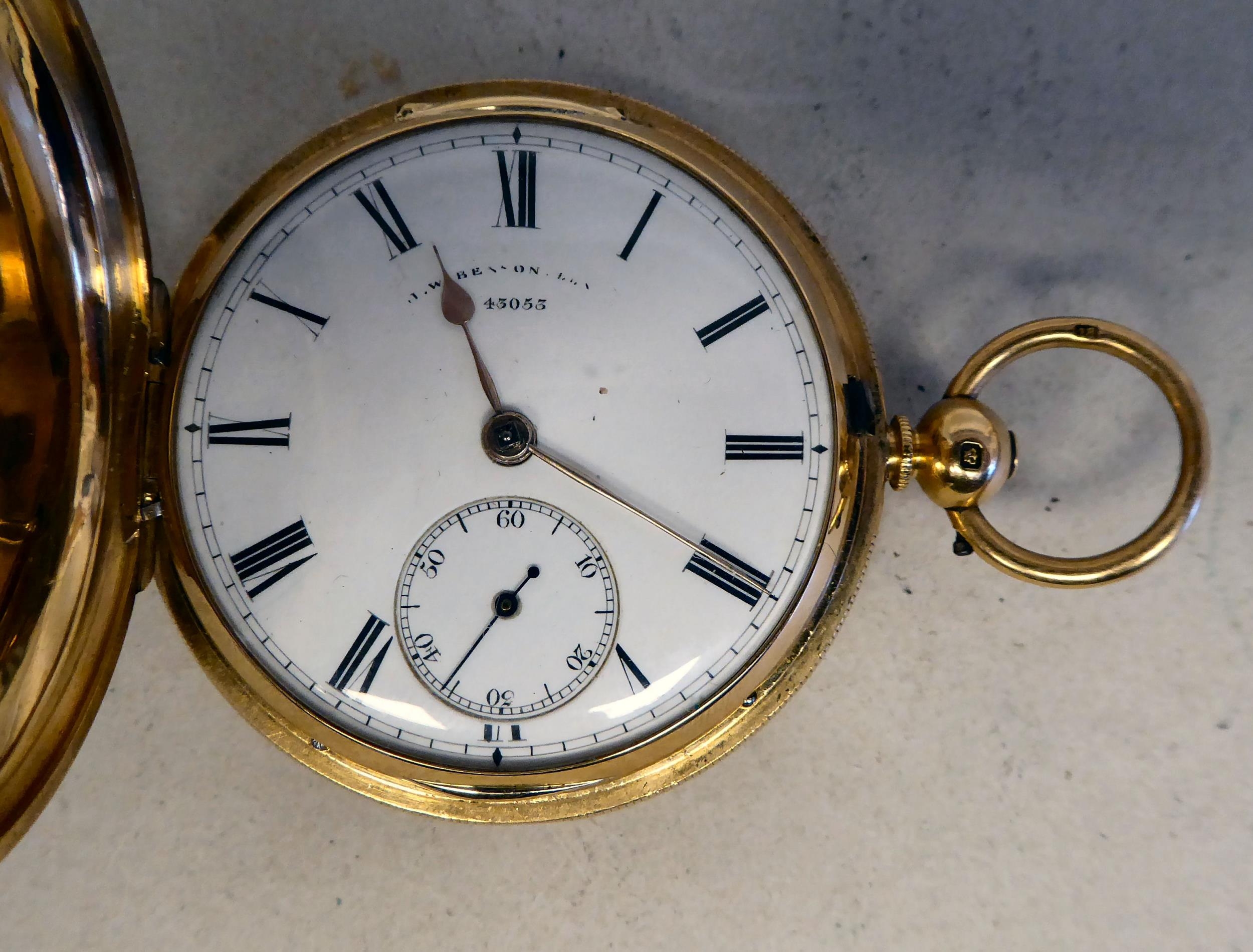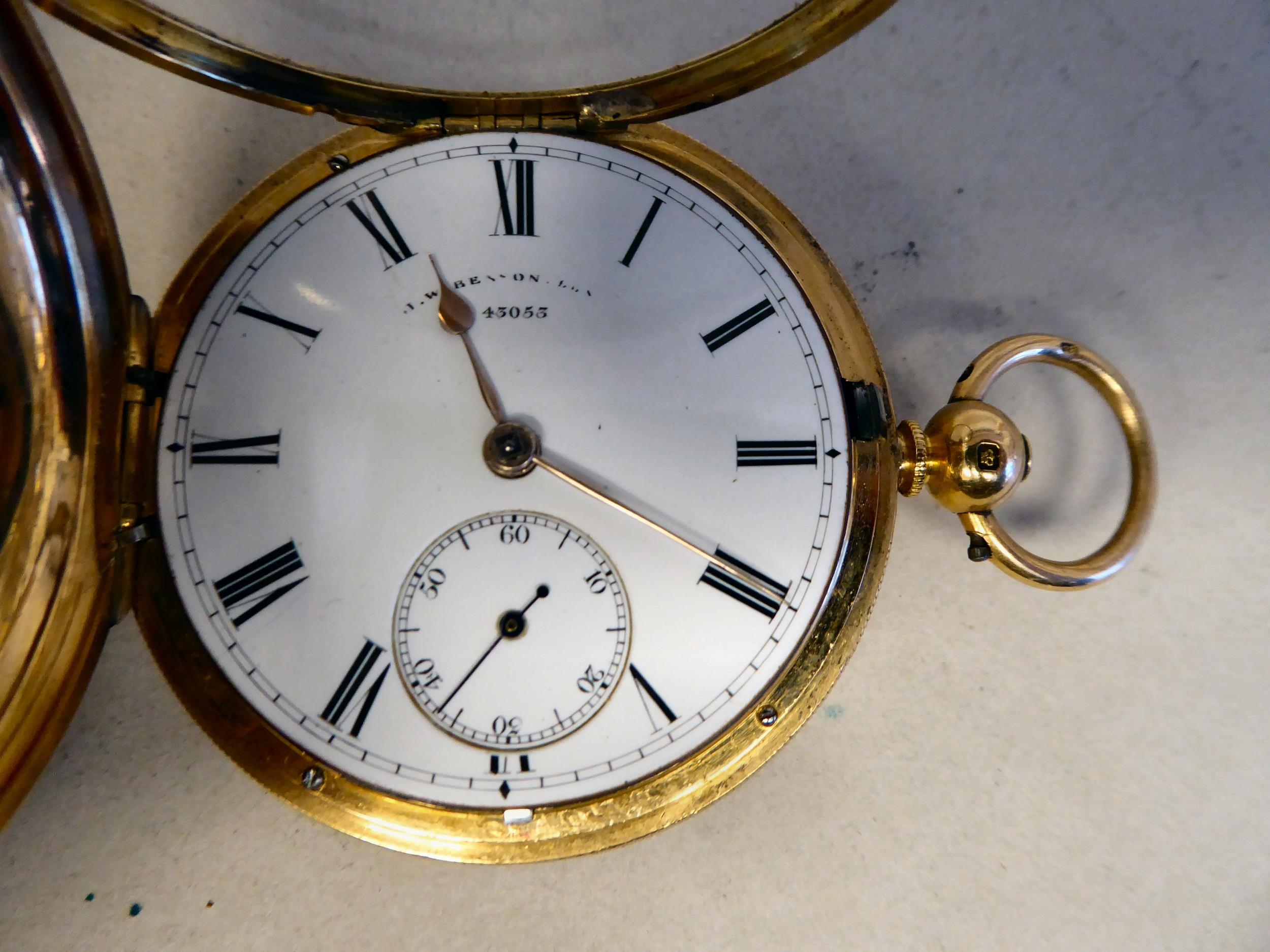 A JW Benson 18ct gold cased Hunter pocket watch, movement no.43053, faced by an enamelled Roman dial London 1934 (approx. weight 98 grams)