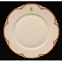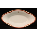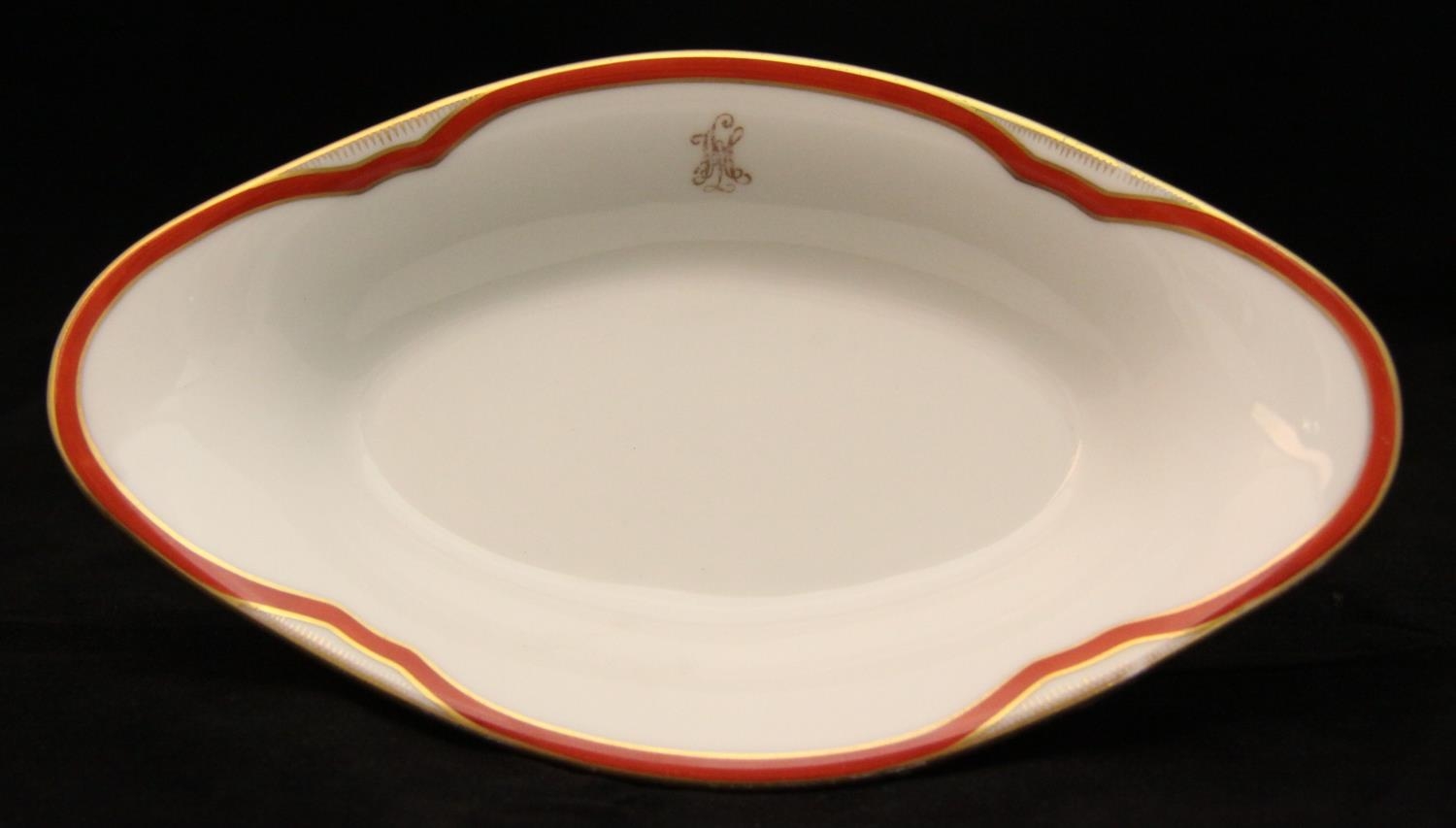 Germany, Third Reich, Leibstandarte S.S. Adolf Hitler, part of a dinner service made in Bavaria and believed issued for the 10th anniversary of November 1923 Munich Beer Hall Putsch, obtained in the late 1940s from a Royal Marine by a Derbyshire publican, and by direct descent to her grandson, oval sweetmeat dish, 8.75''x5'', red and gilt border with LAH monogram, and to back, 1814 1914, Hutchenreuther, Hohenberg, Bavaria, monogram somewhat rubbed