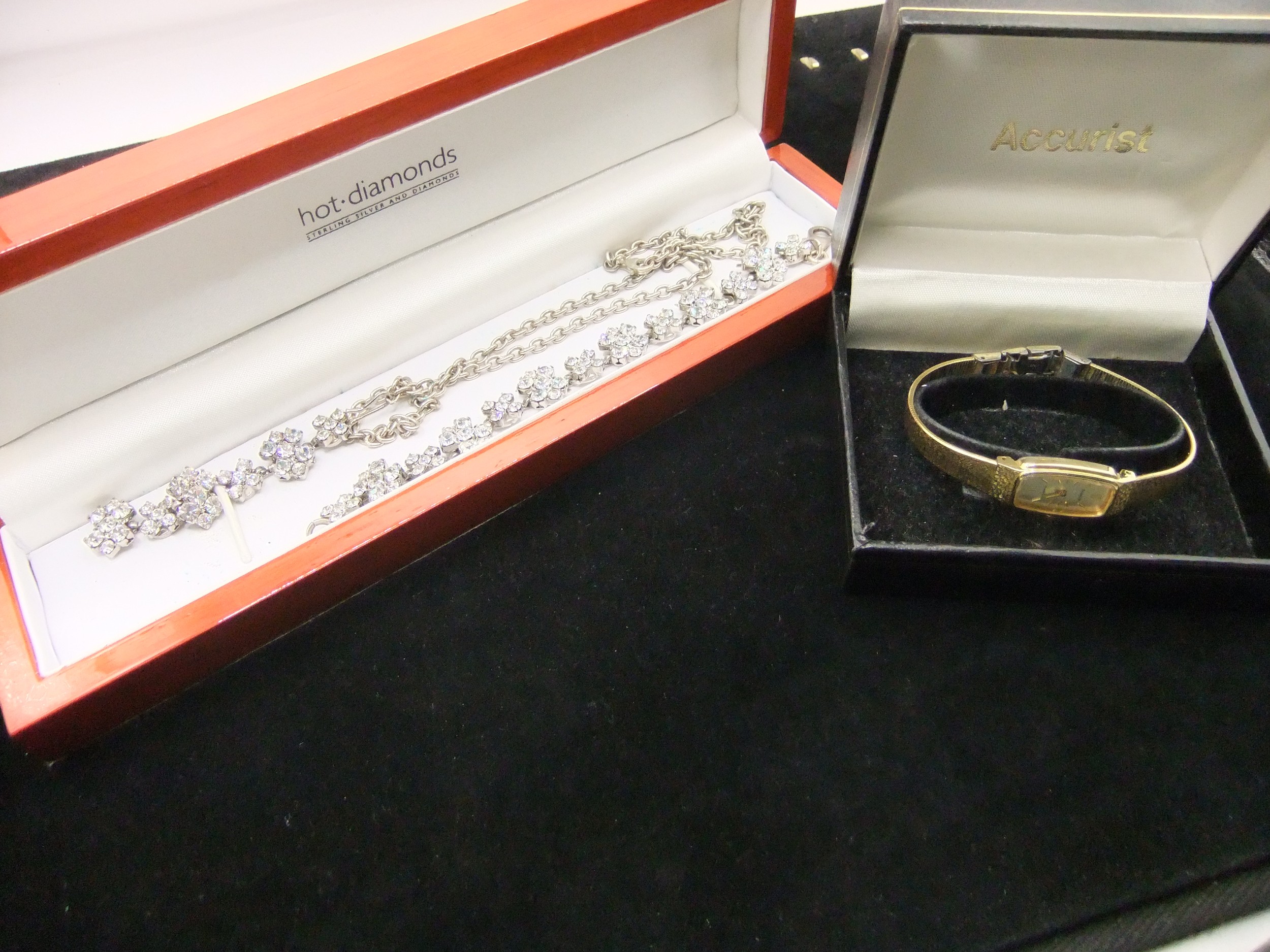 A sterling silver matching bracelet and necklace pair set with clear stones in a wooden laquered presentation box and a ladies gold tone Accurist wrist watch