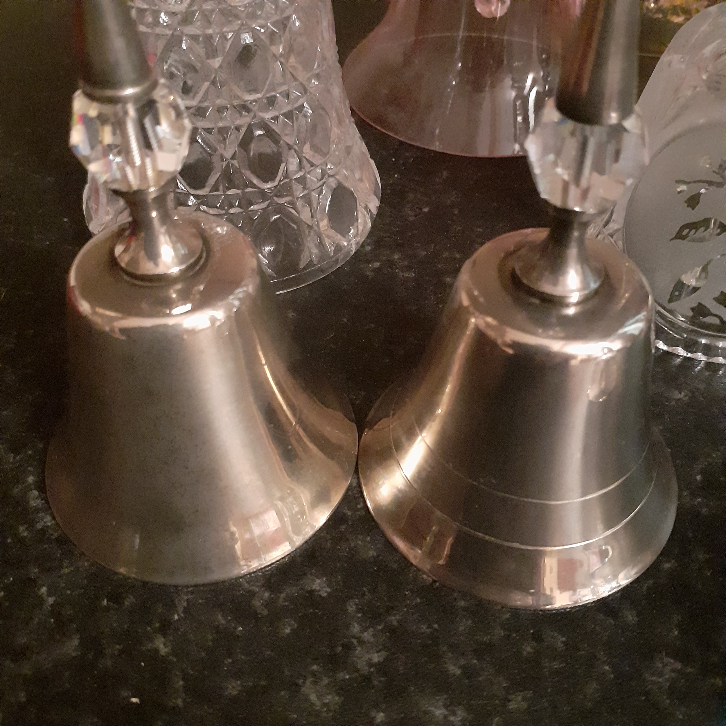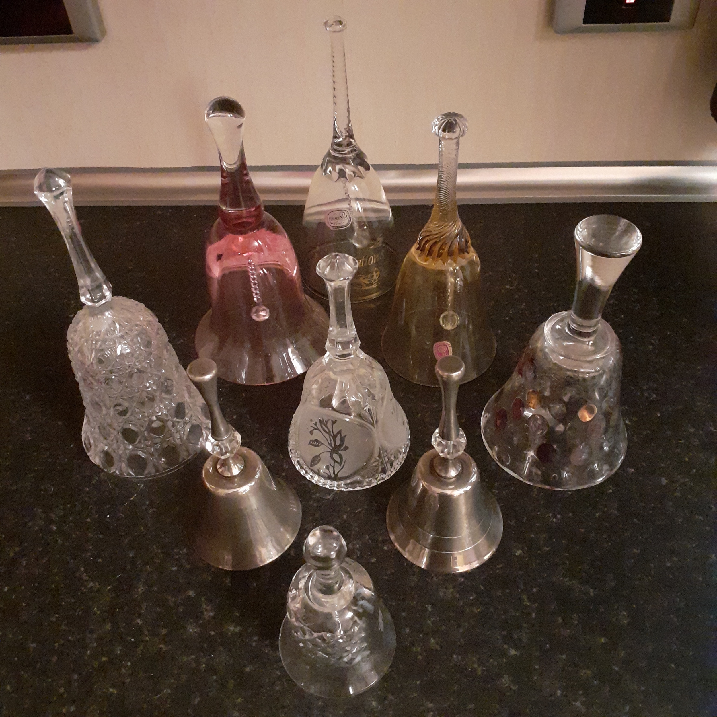 Quantity of glass and metal bells, some chrystal and coloured glass.