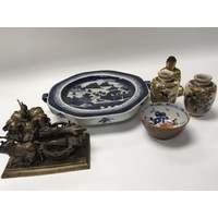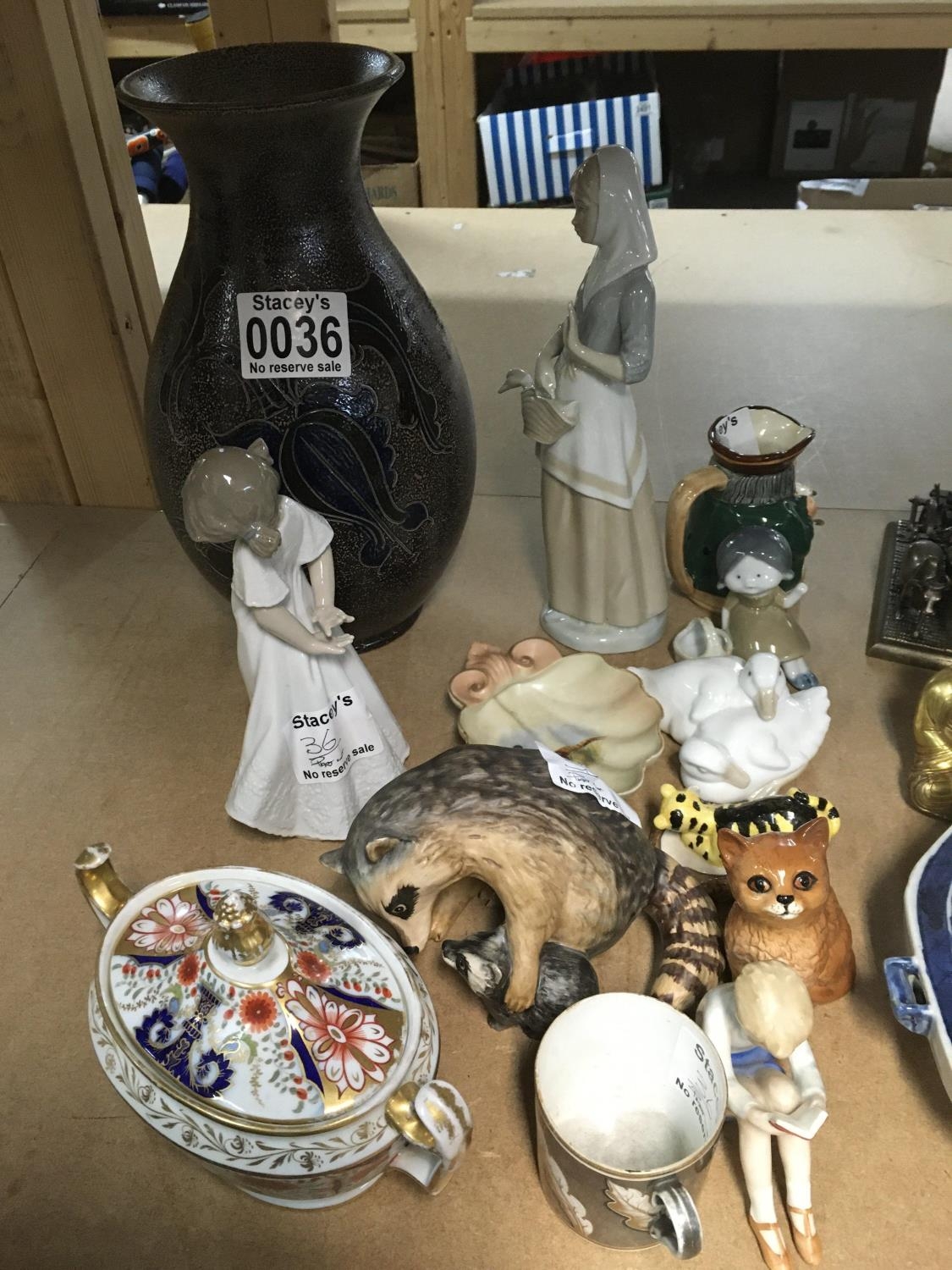 A 19th Derby type porcelain dish and cover a hand painted Lock&Co Worcester dish Doulton figures a stoneware art vase Neo and Lladro figures. (a lot)