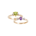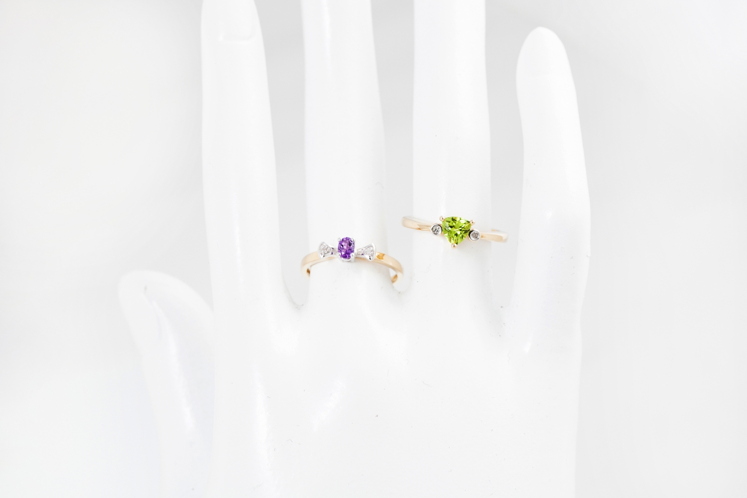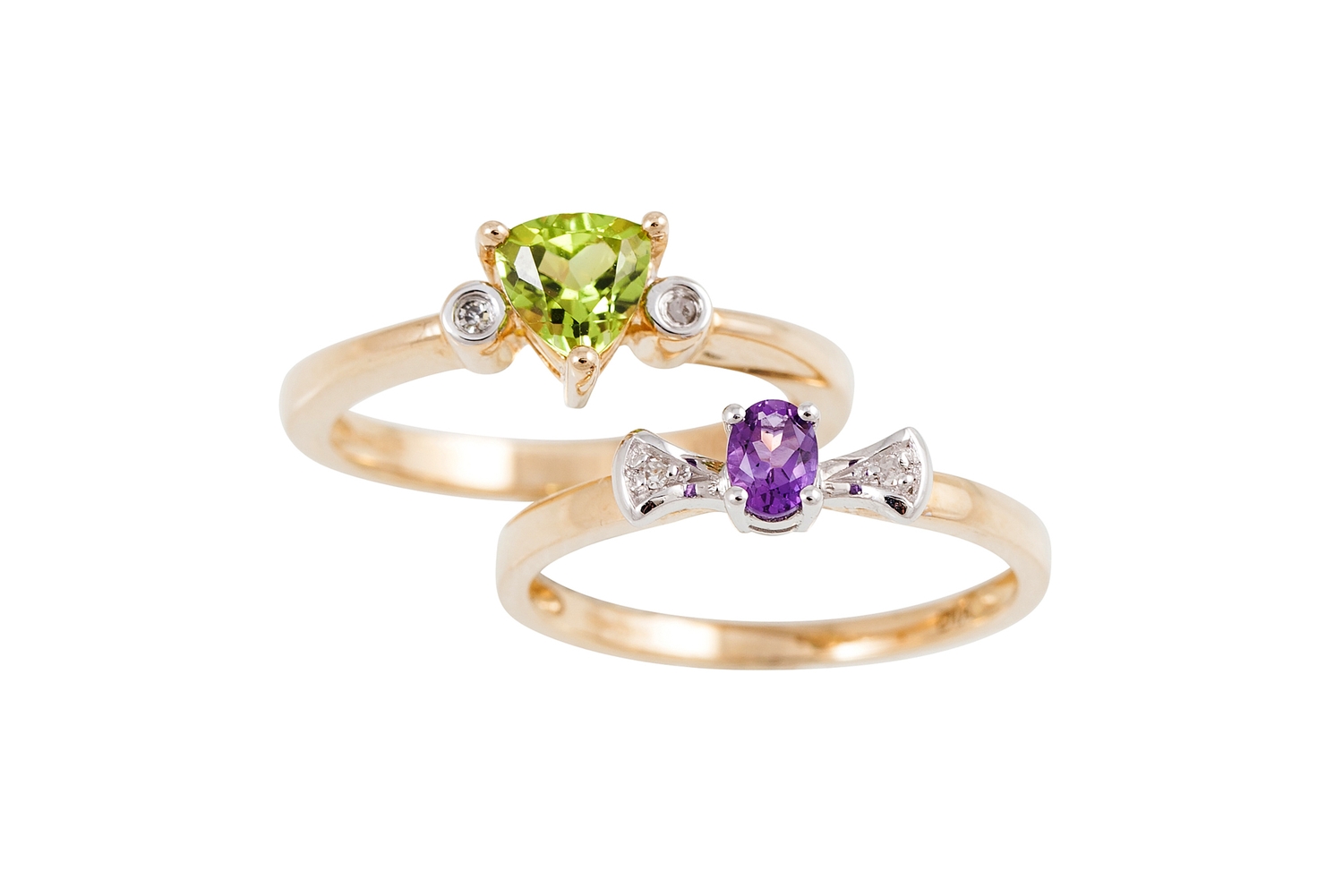 AN AMETHYST AND DIAMOND RING, mounted in 9ct gold, together with a diamond and peridot ring mounted in 9ct gold, sizes J & K