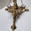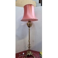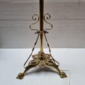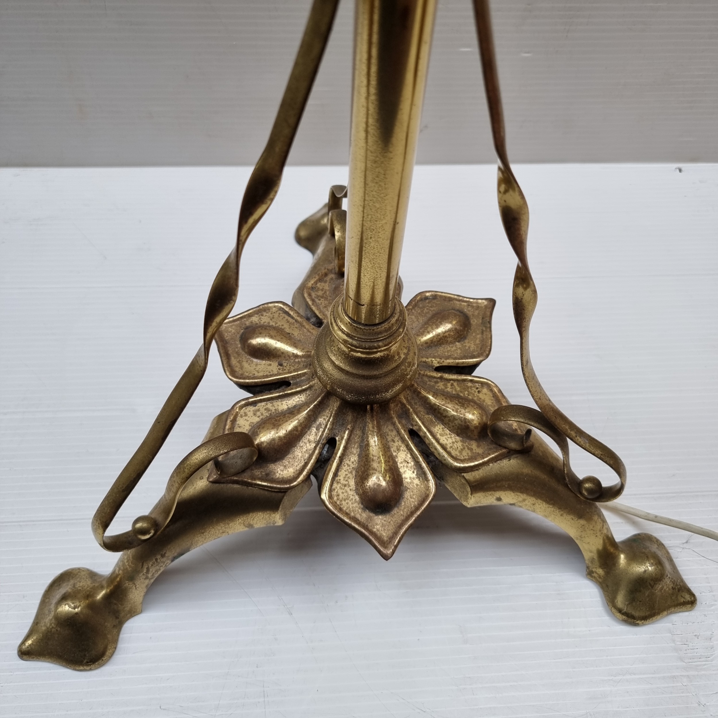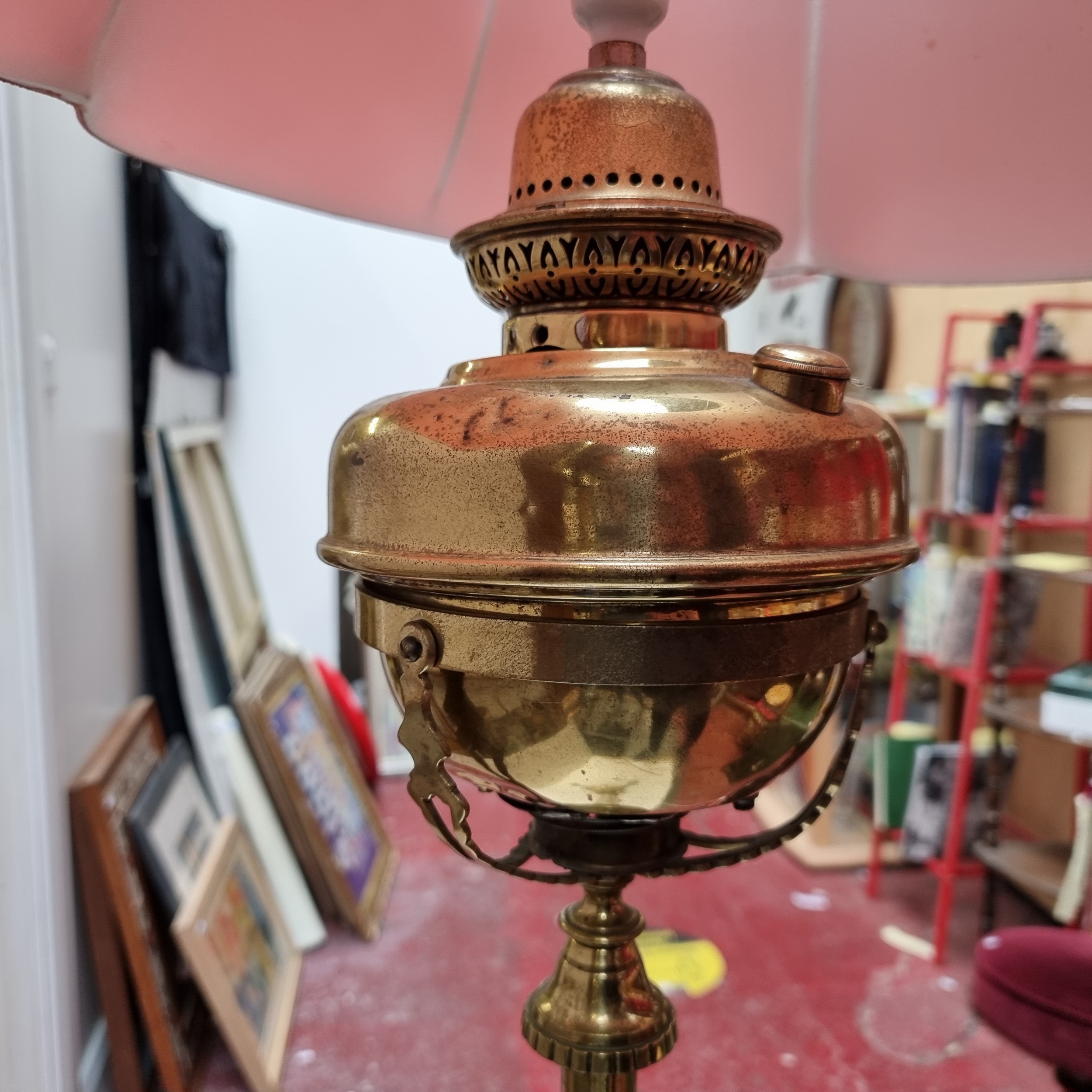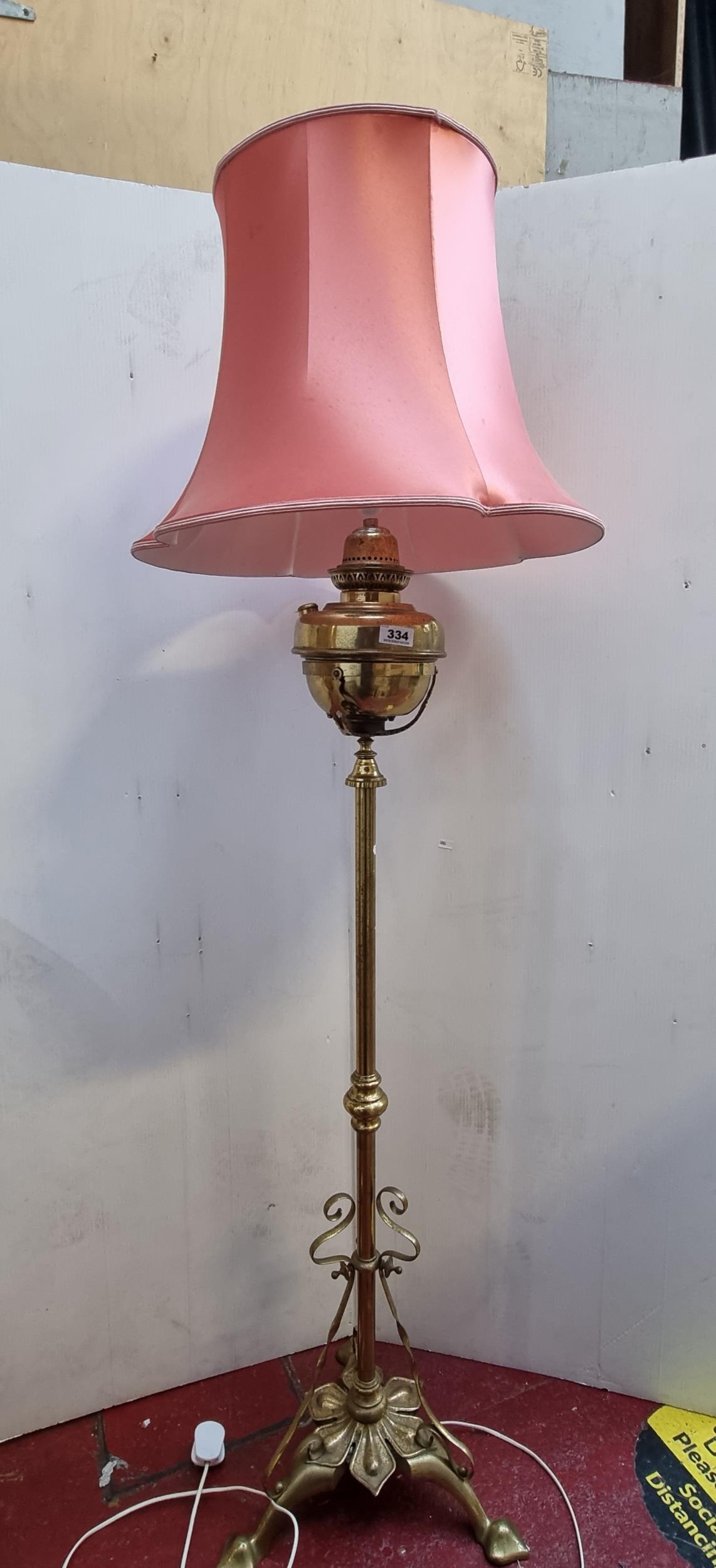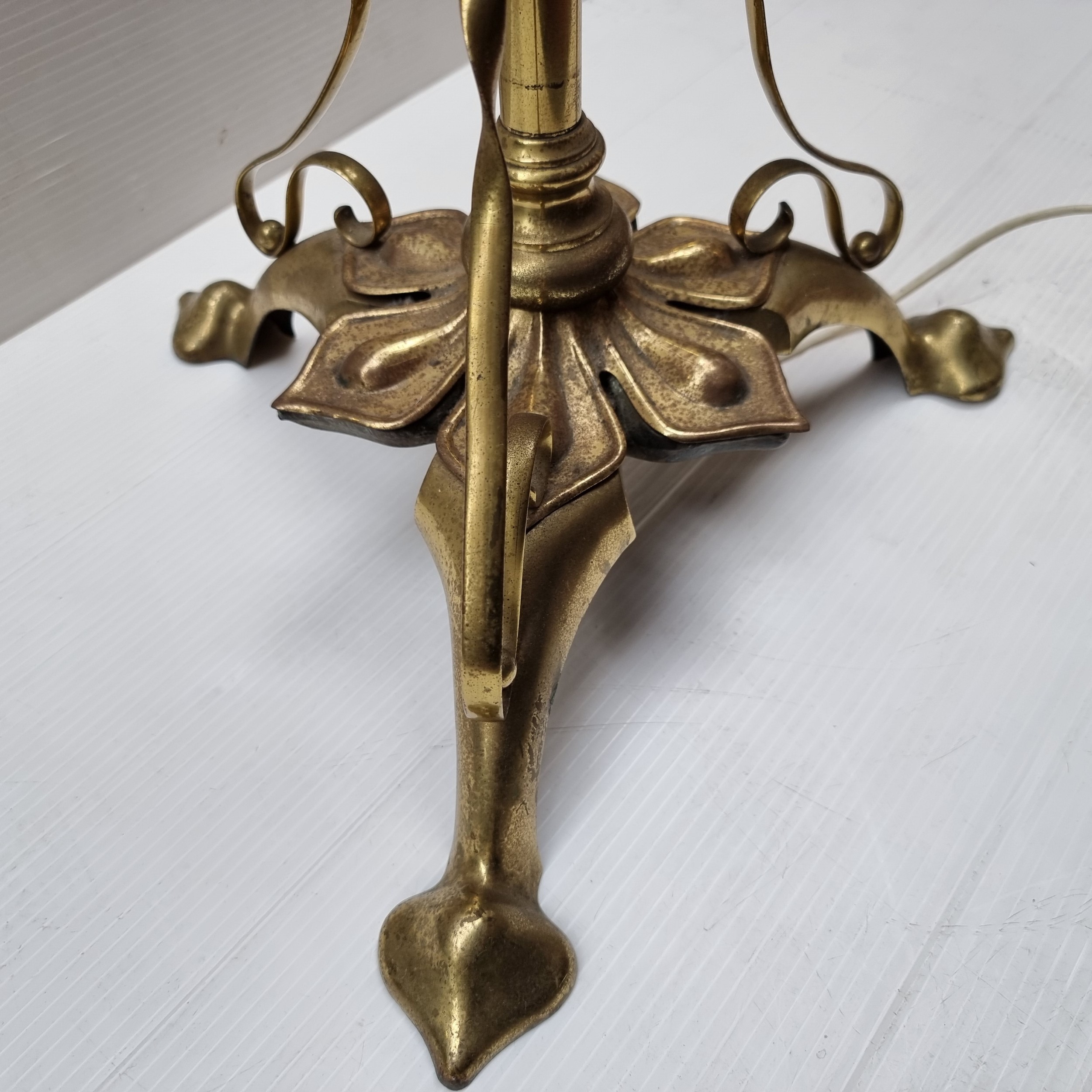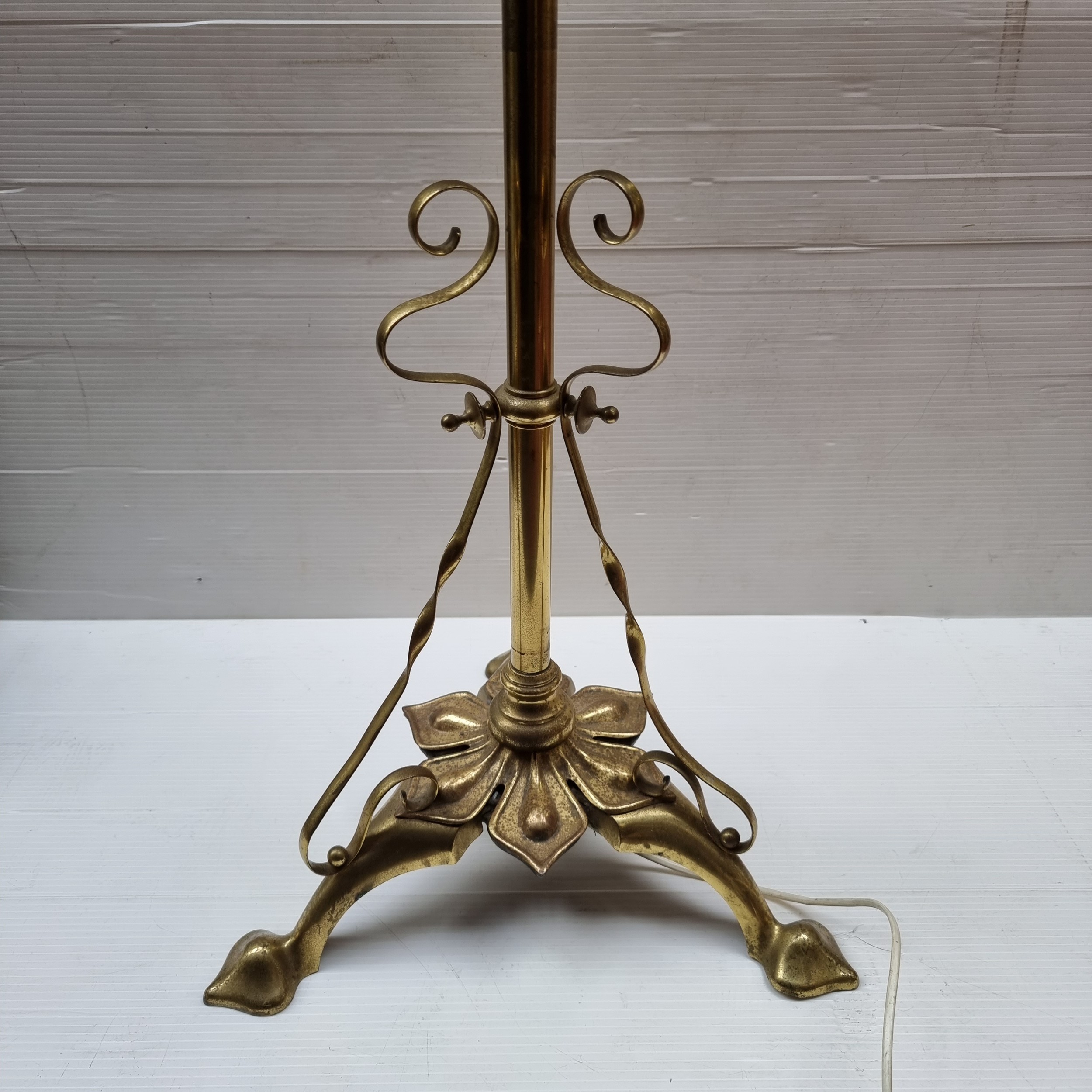 A beautiful brass Art Nouveau standing floor lamp, manufactured by The Veritas Lamp Works, Germany. This converted oil lamp has stunning foliate scroll work and a blush satin shade.
