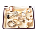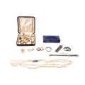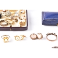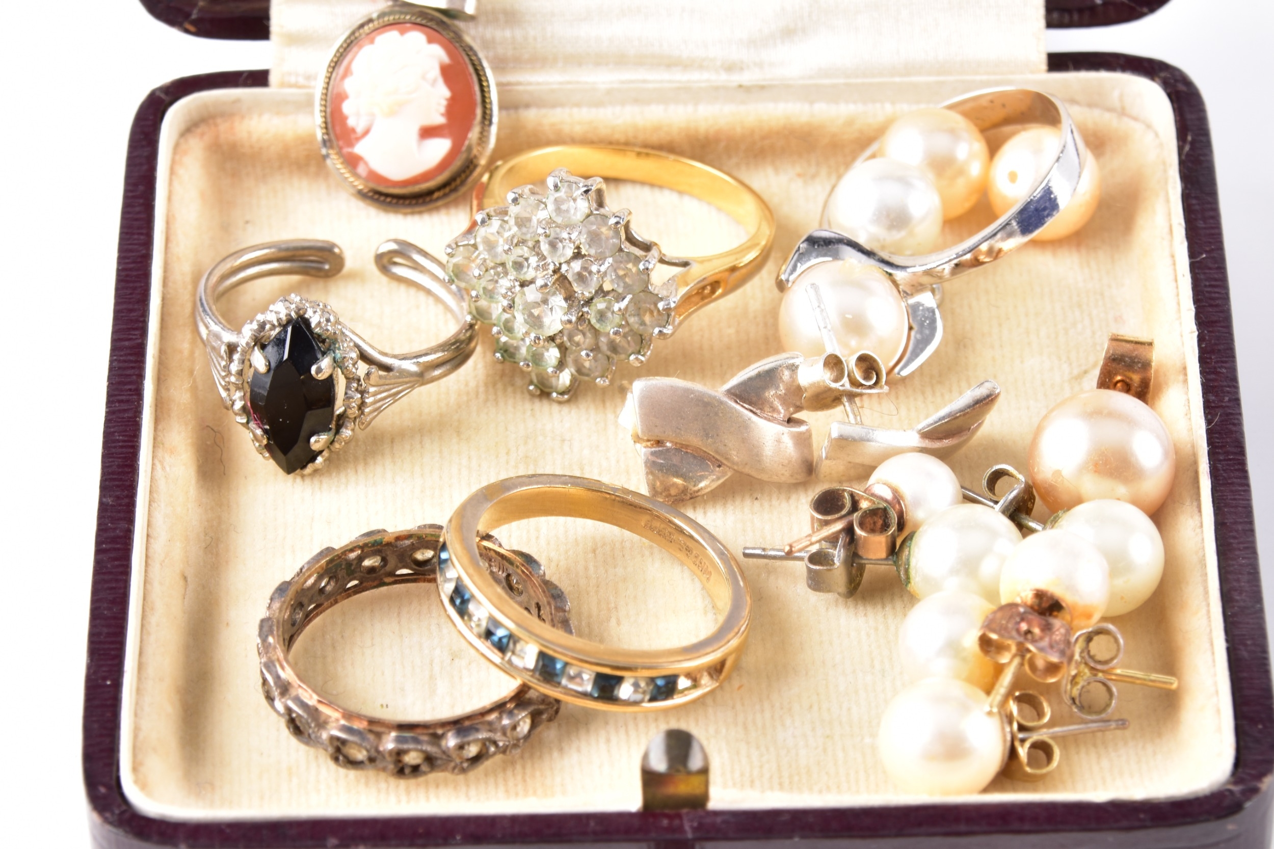 Group of assorted jewellery items, including a 9ct rose gold pendant mount a/f, a pair of 9ct rose gold cameo clip on earrings, a 9ct yellow gold citrine dress ring hallmarked for Birmingham 1965, a pair of 18ct yellow gold cultured pearl stud earrings with rope detail setting, a silver 1977 silver ingot, a vintage faux pearl necklace, various silver and costume rings, a silver cross pendant and loose studs.