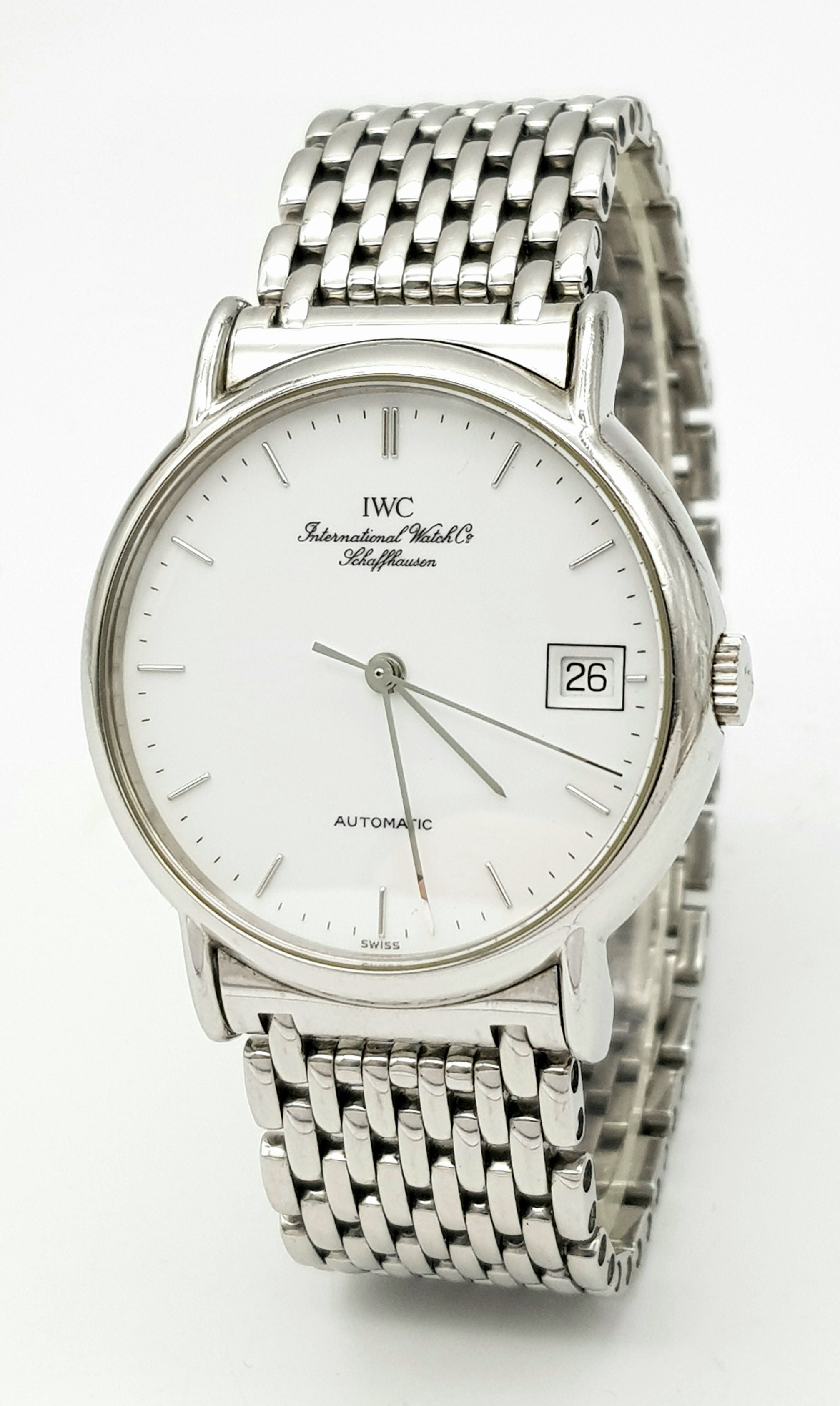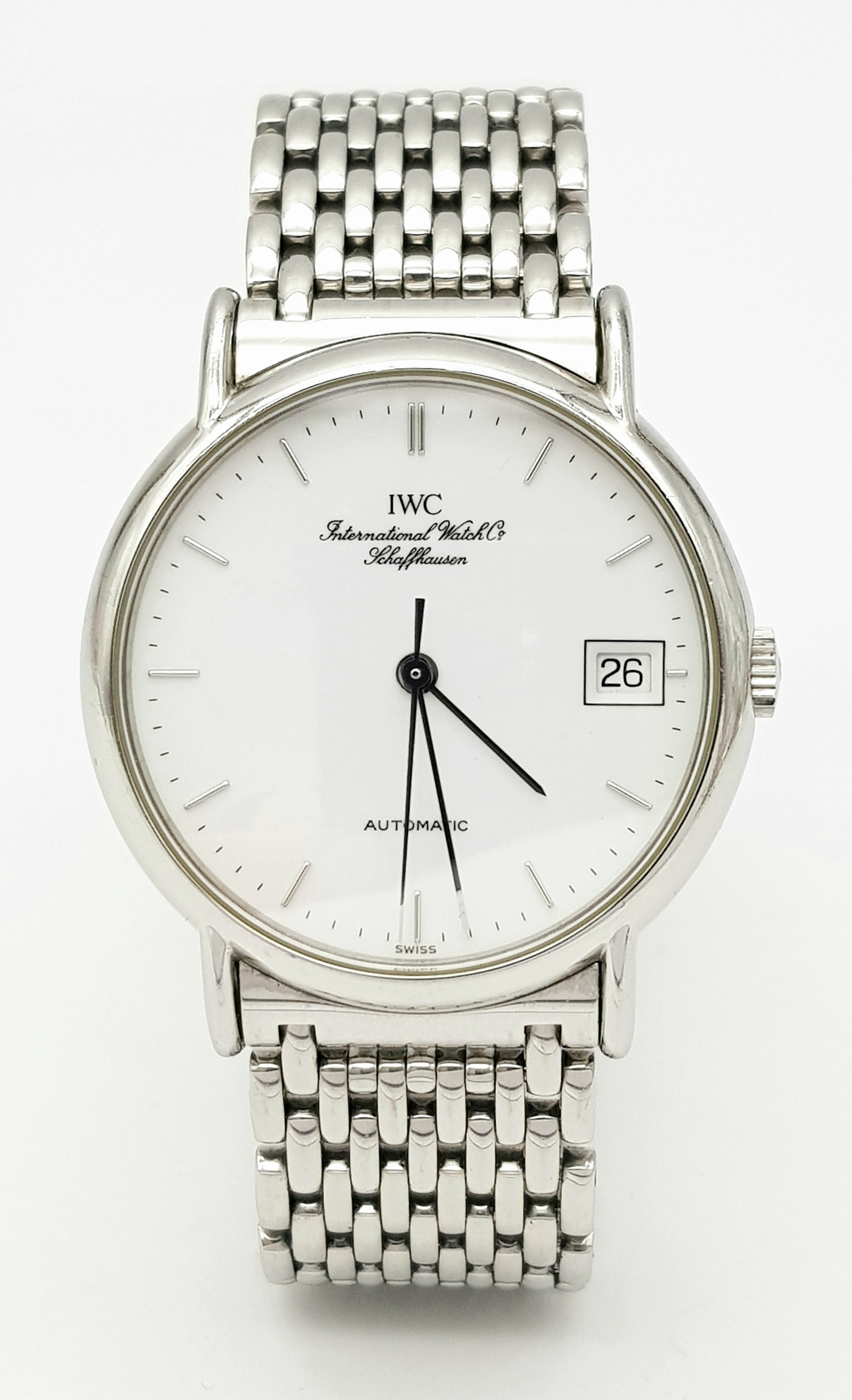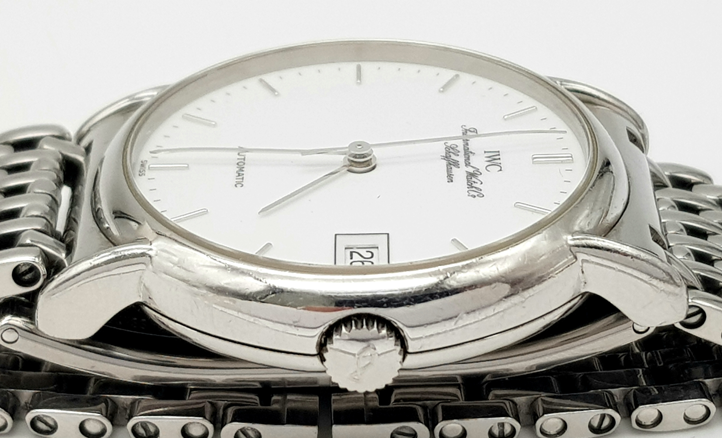 An IWC Schaffhausen Automatic Gents Watch. Stainless steel bracelet and case - 34mm. White dial with date window. In good condition and working order.