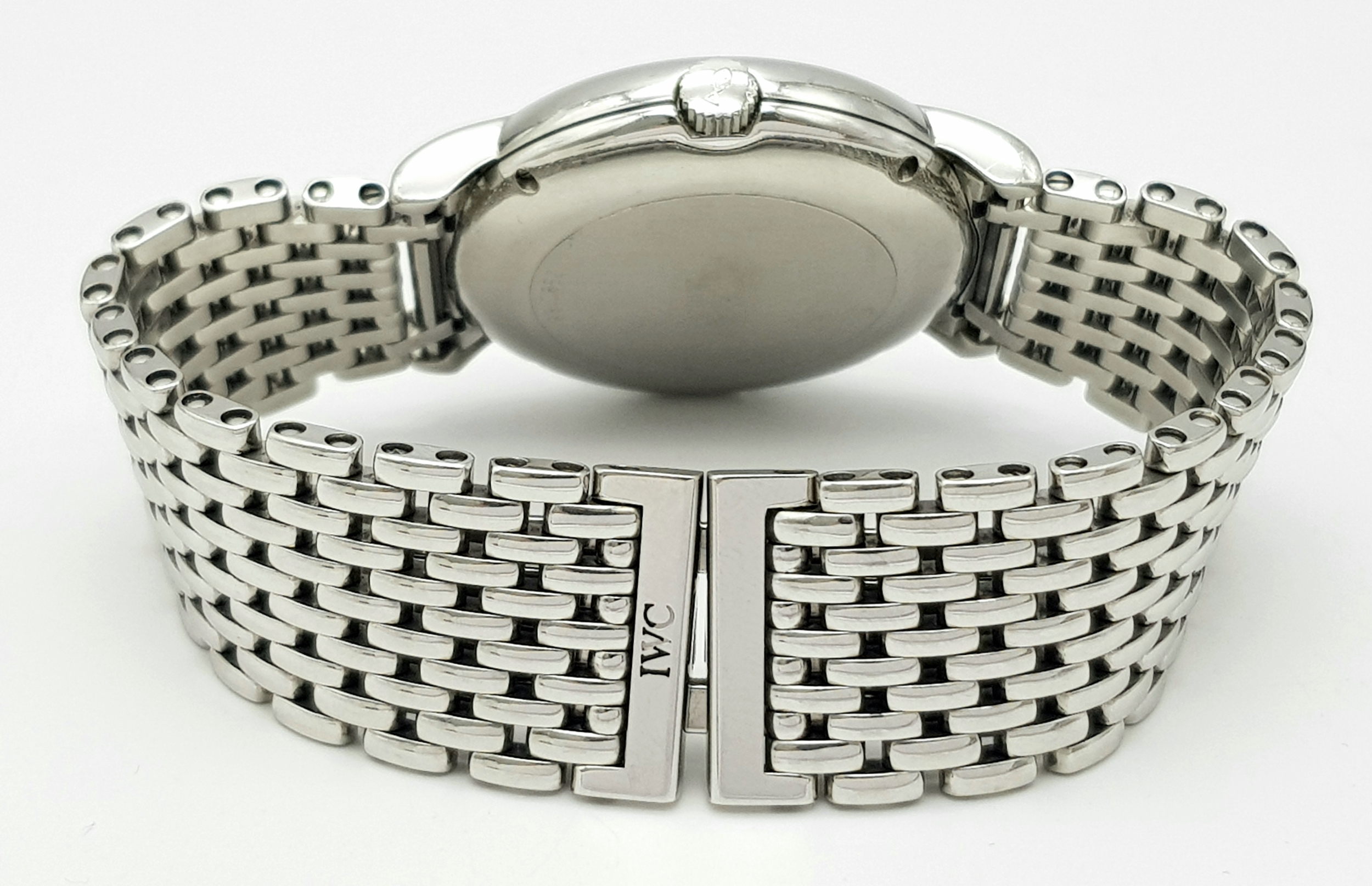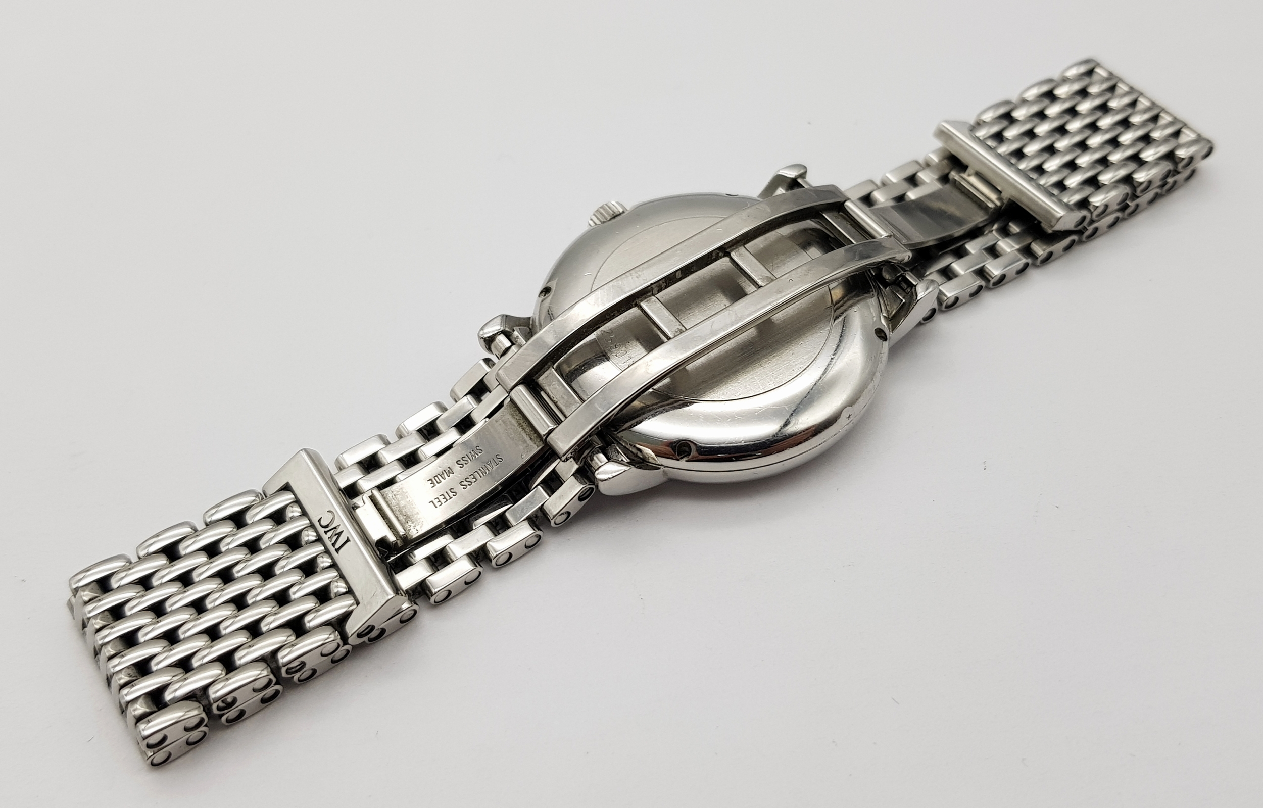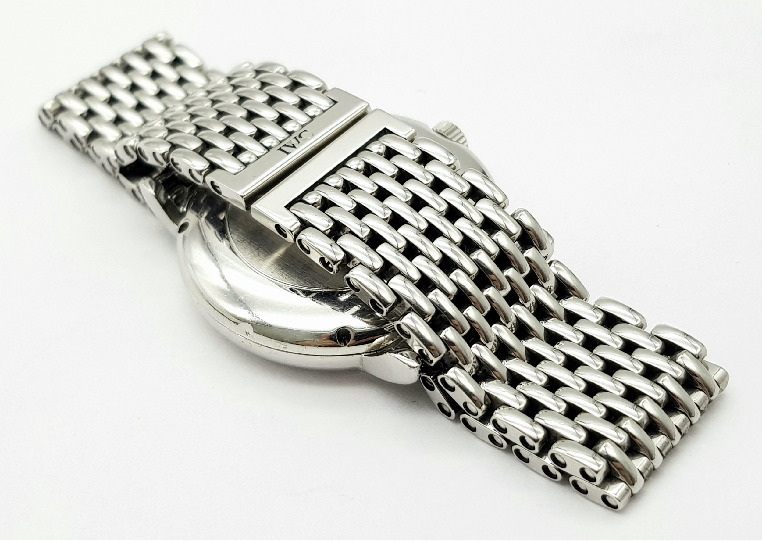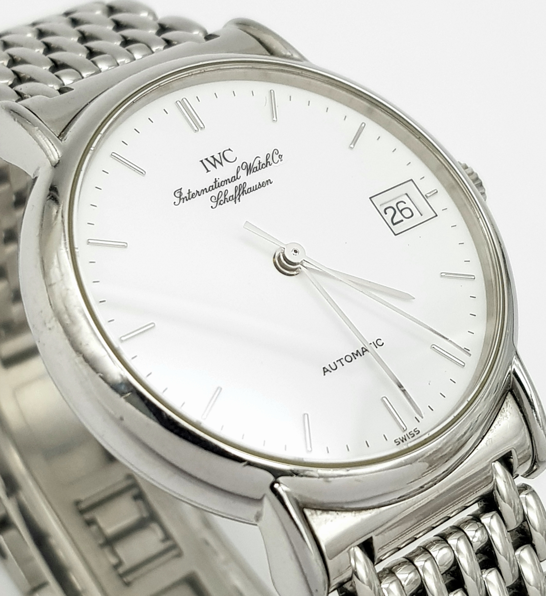 An IWC Schaffhausen Automatic Gents Watch. Stainless steel bracelet and case - 34mm. White dial with date window. In good condition and working order.