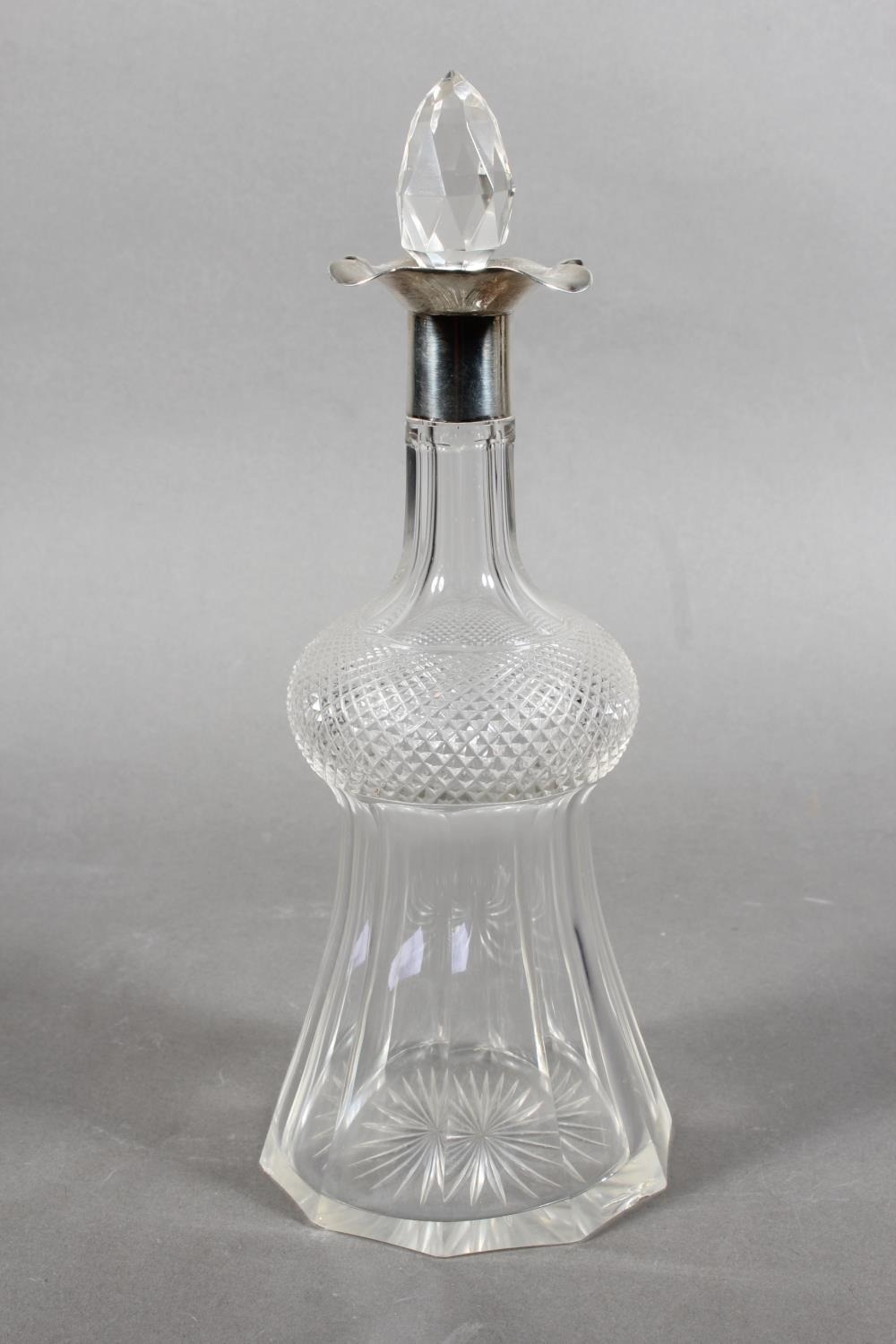 Cut glass decanter and stopper with silver collar, manufactured in Birmingham 1900.