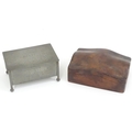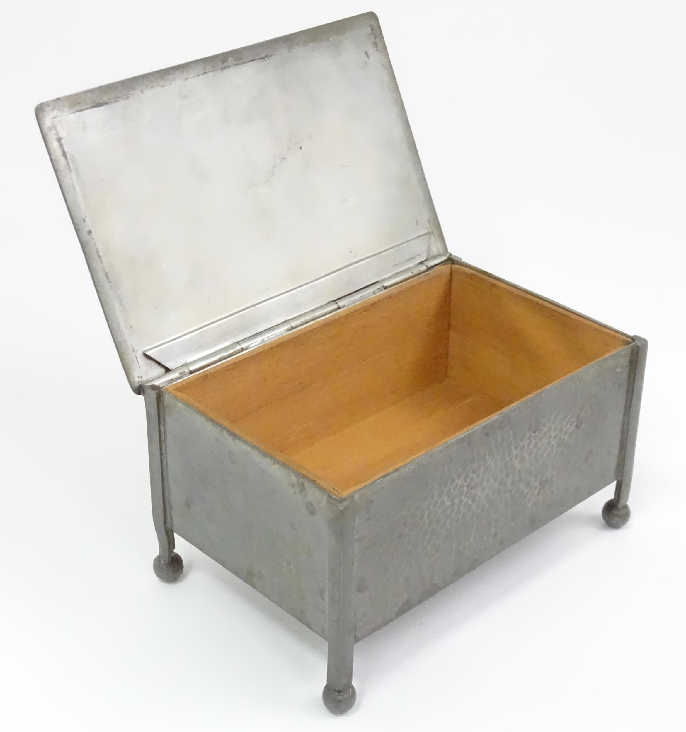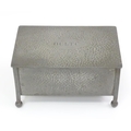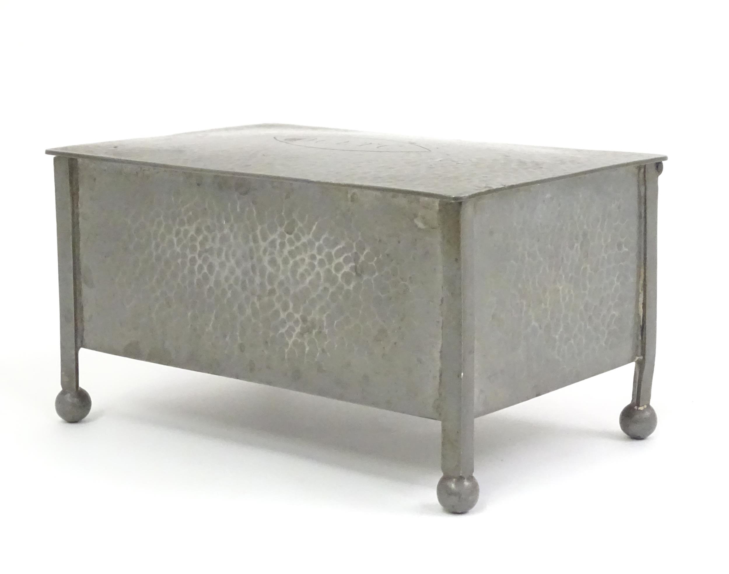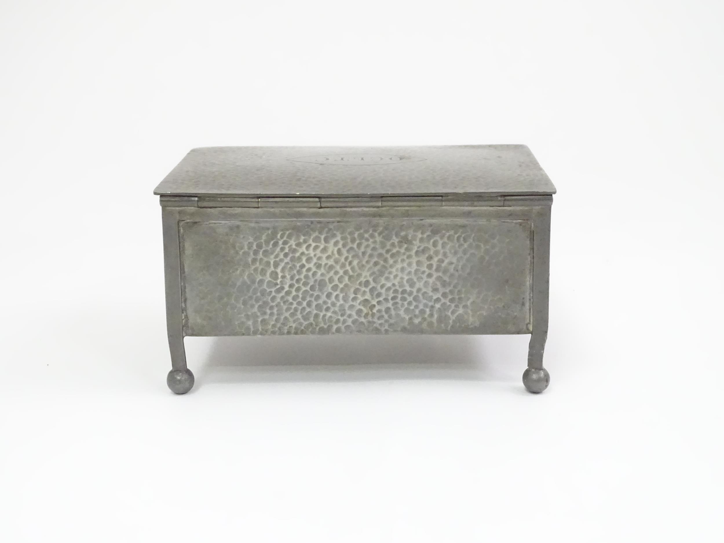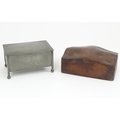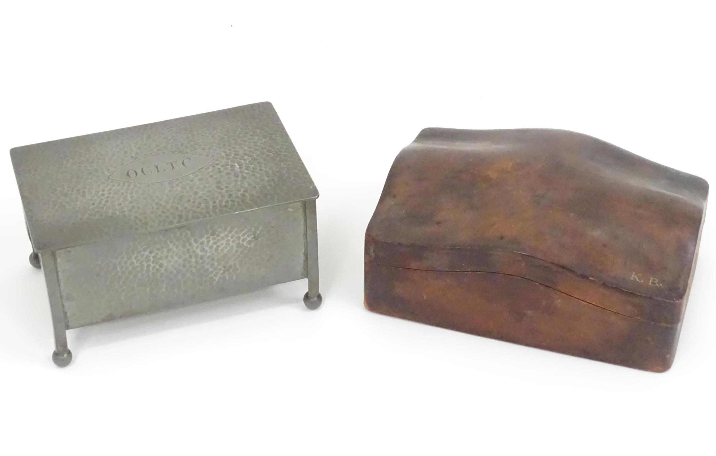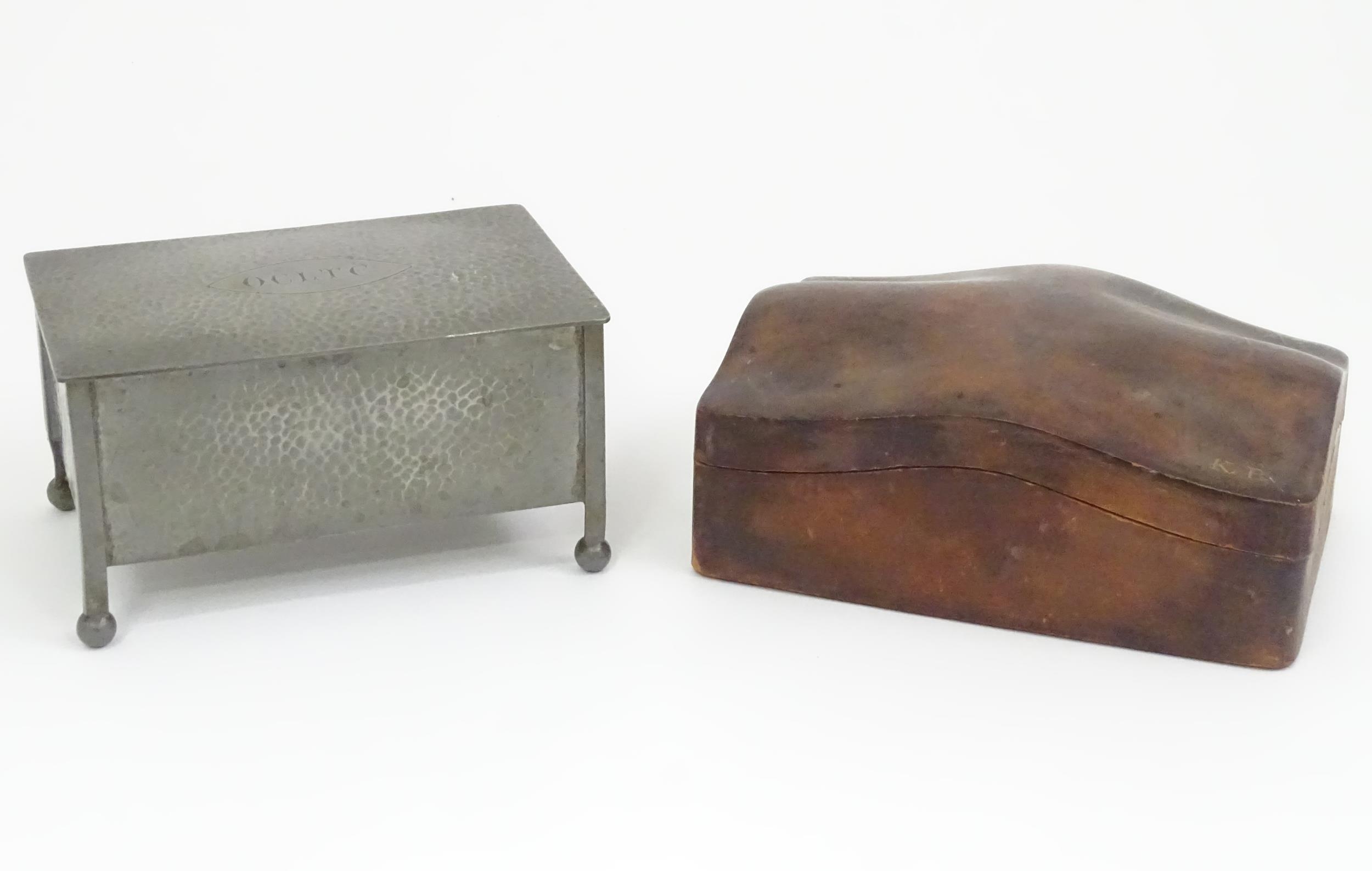 An Arts & Crafts James Dixon & Sons Cornish pewter cigarette box with hammered decoration. Marked under and numbered W1846. Together with a leather cigarette box with shaped lid. Pewter example approx. 5 3/4" wide (2)