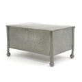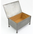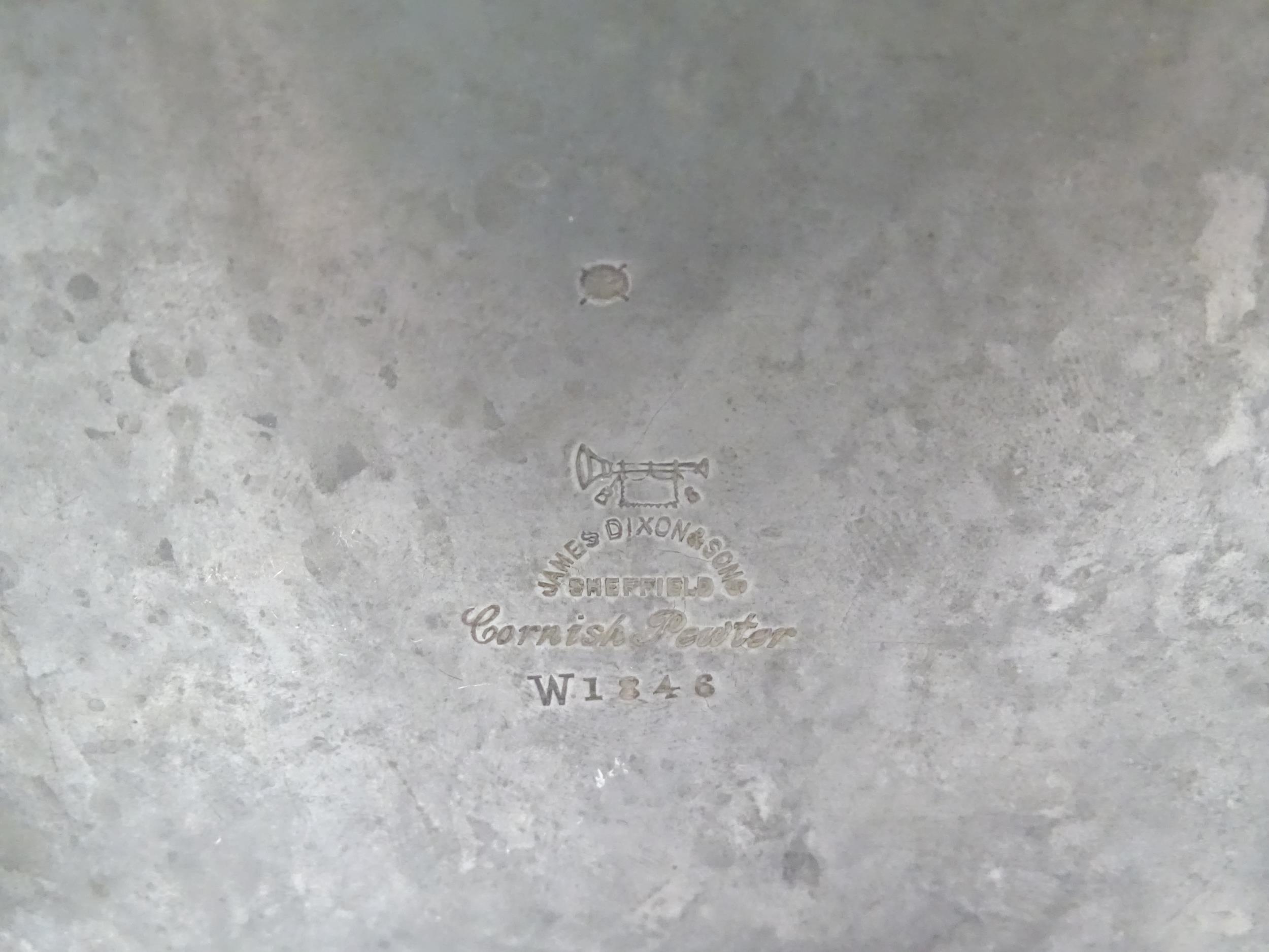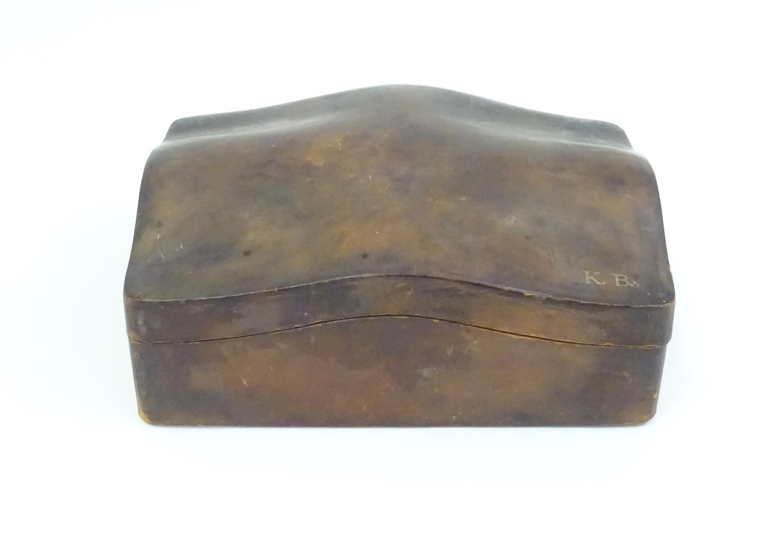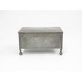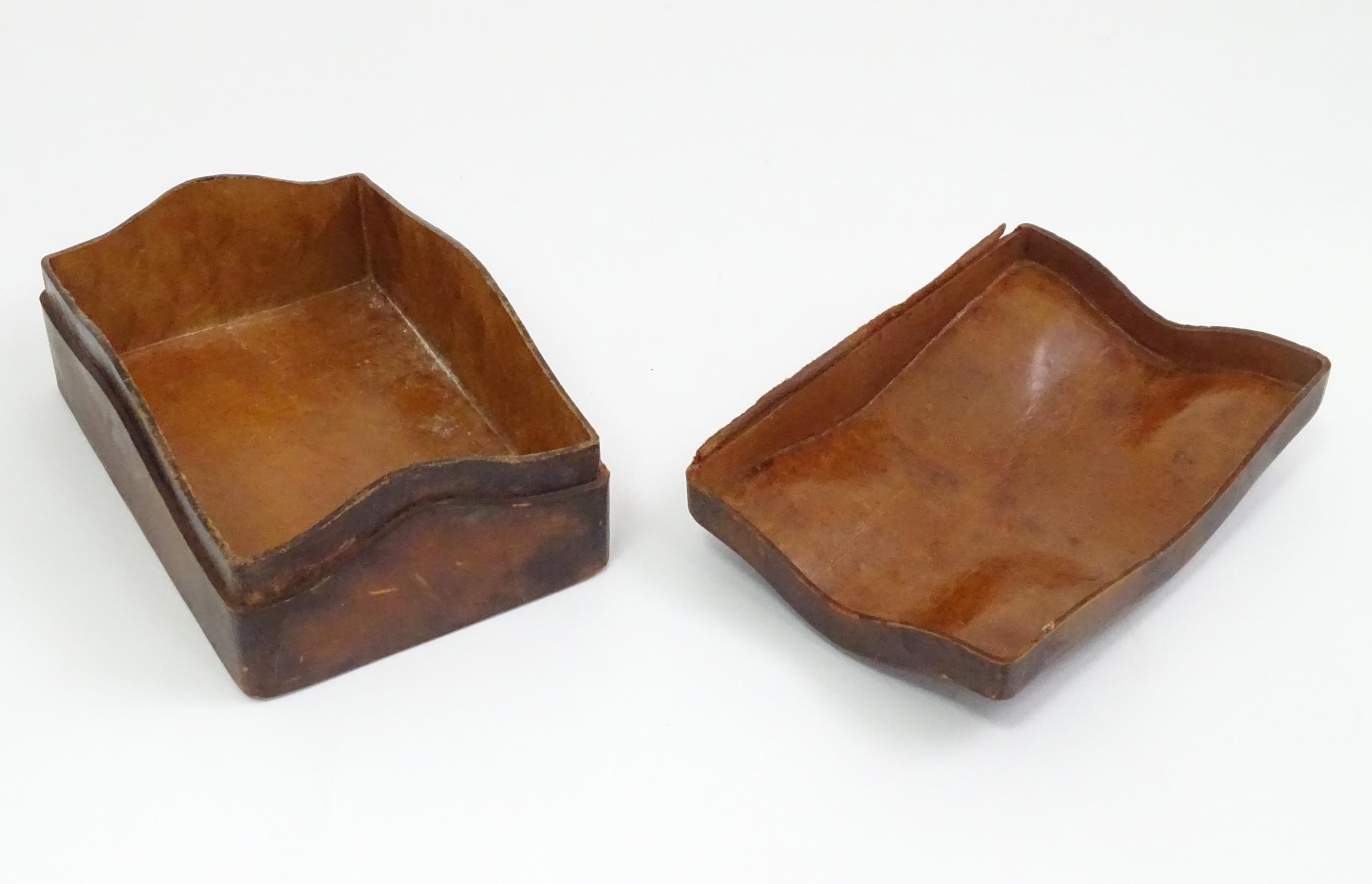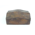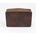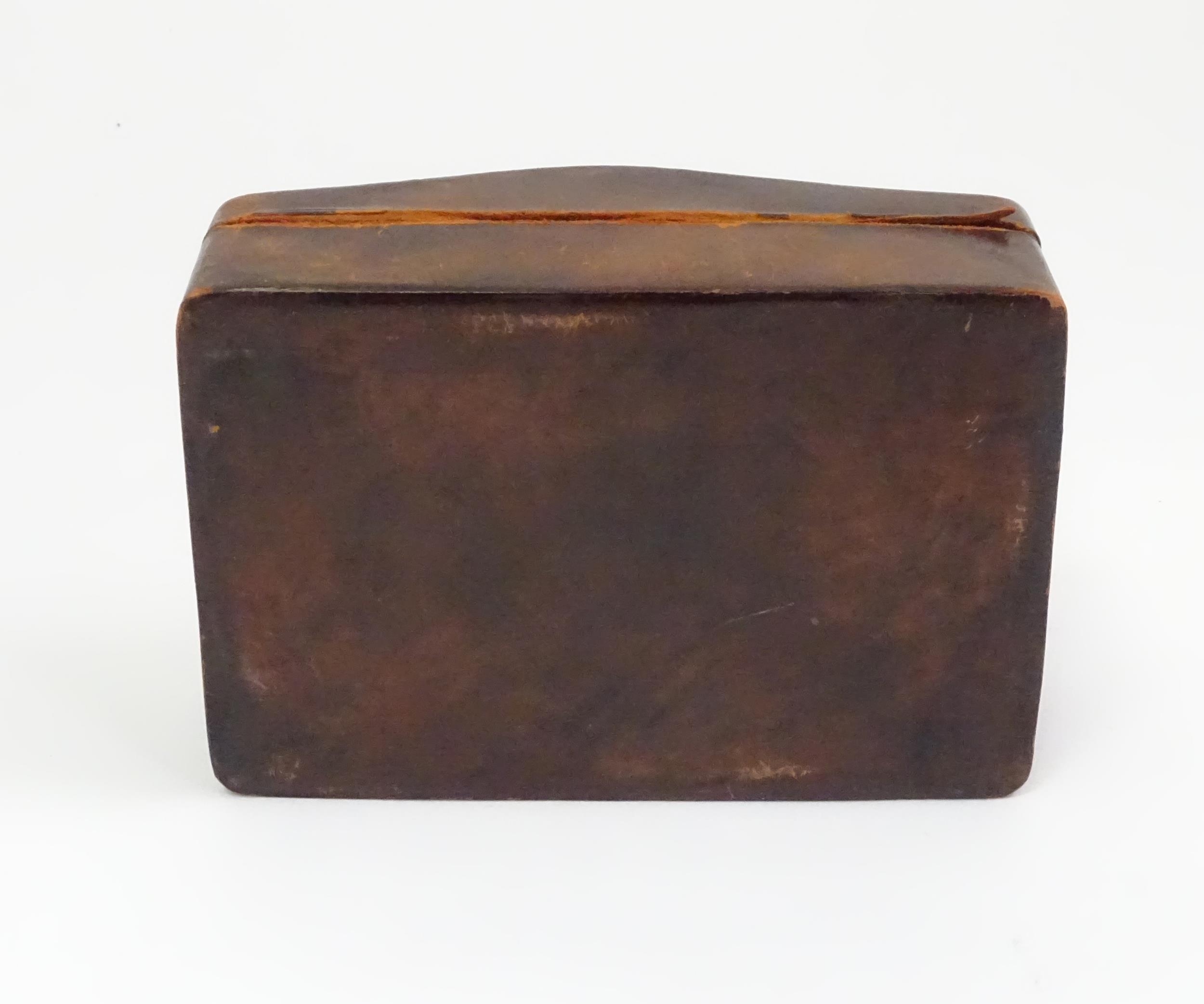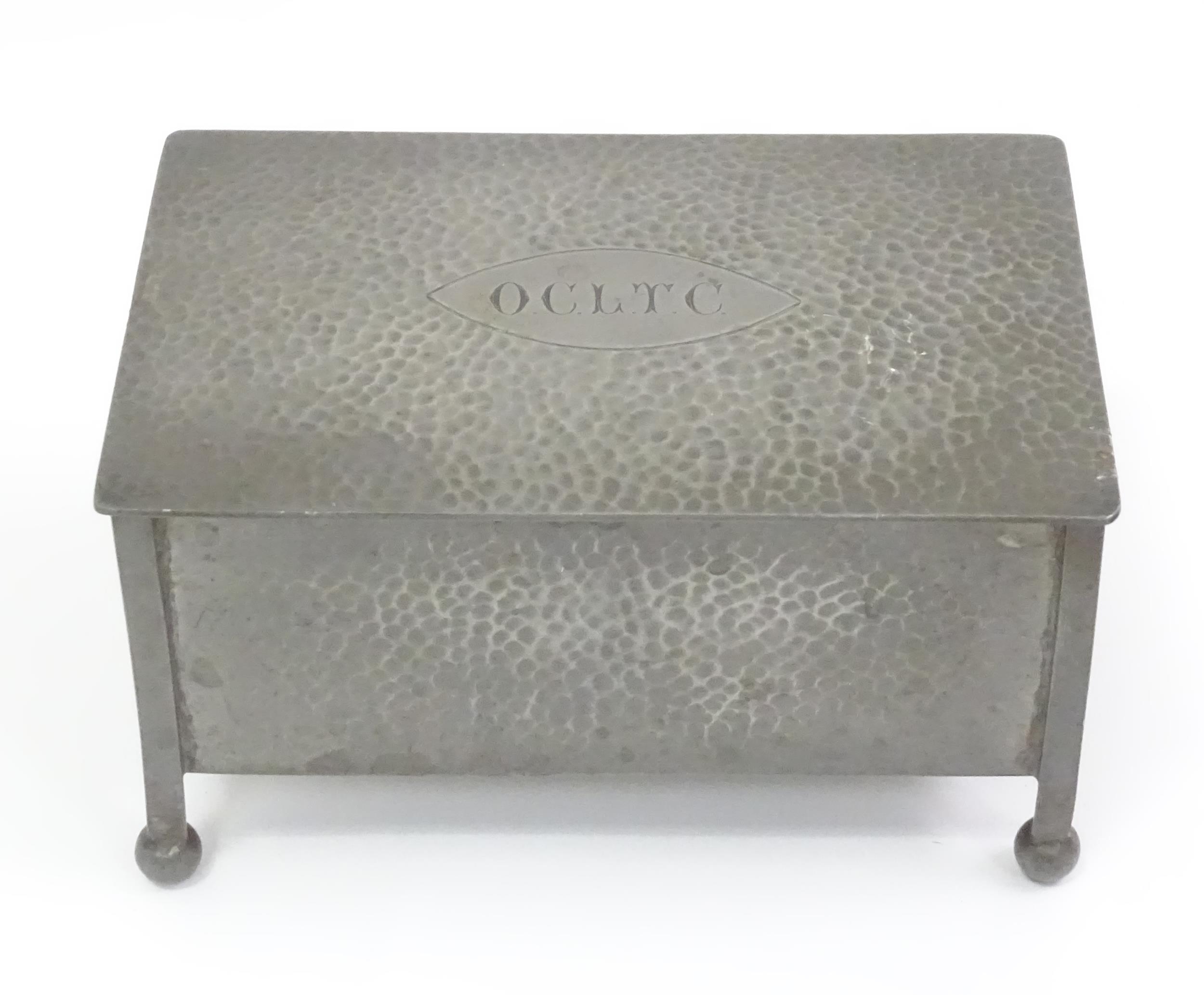 An Arts & Crafts James Dixon & Sons Cornish pewter cigarette box with hammered decoration. Marked under and numbered W1846. Together with a leather cigarette box with shaped lid. Pewter example approx. 5 3/4" wide (2)