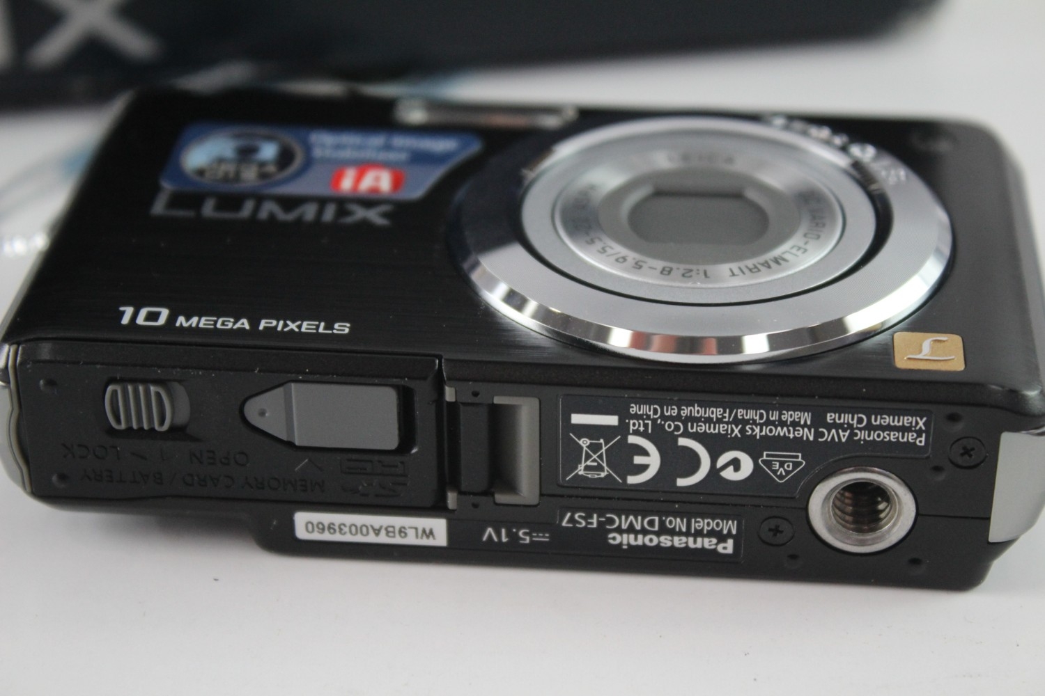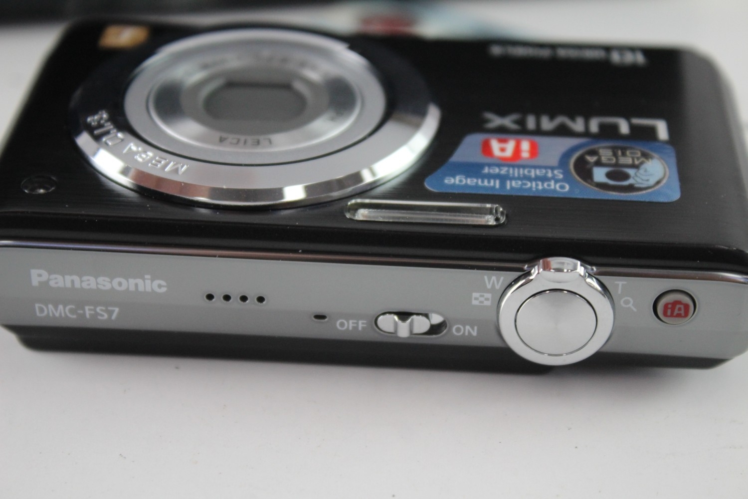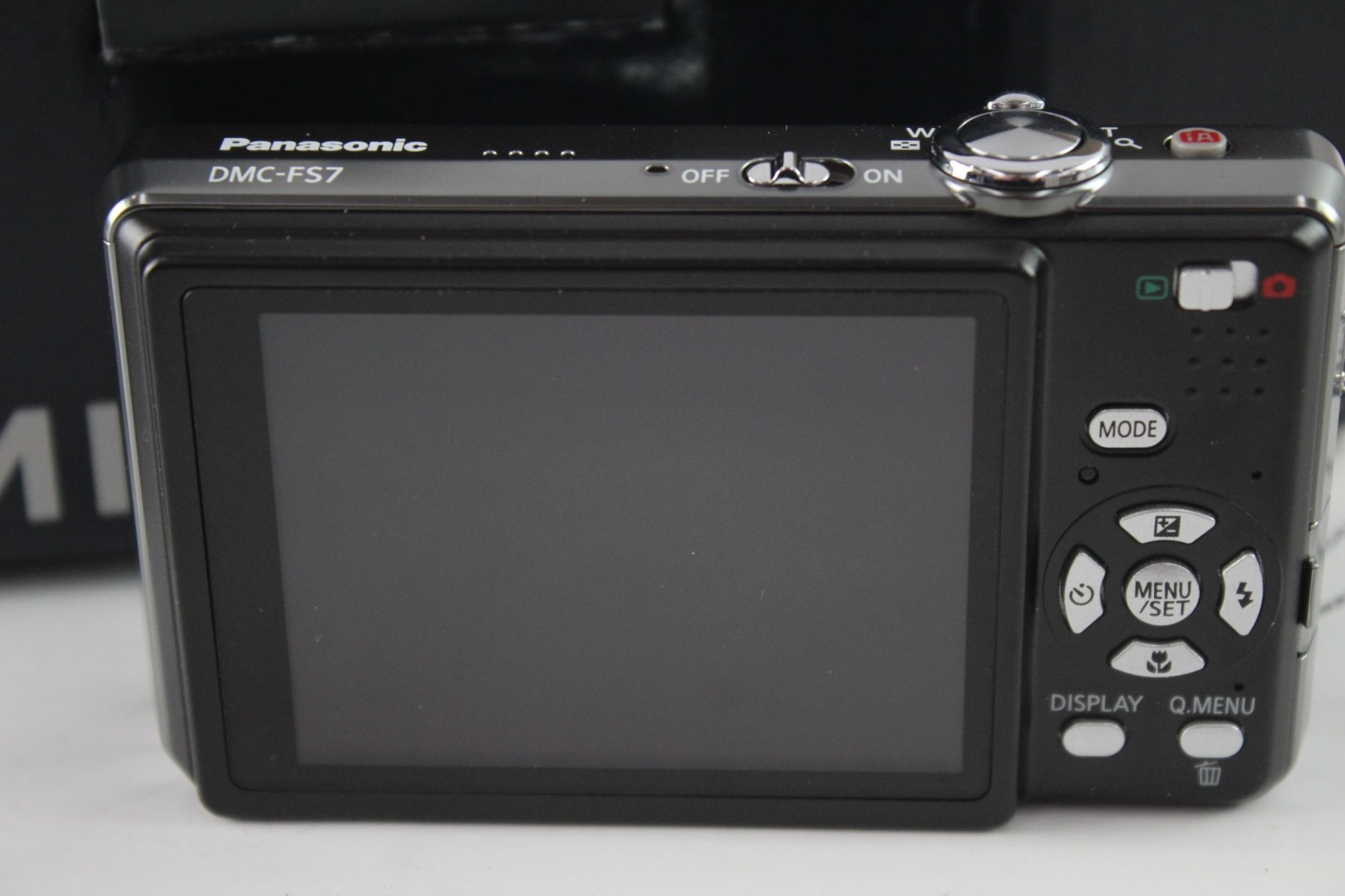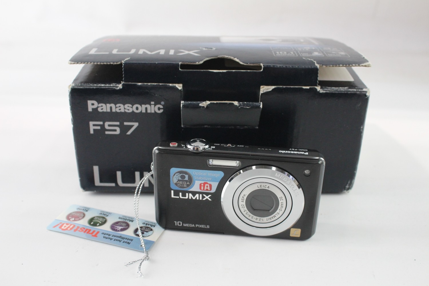 A boxed Panasonic Lumix DMC-FS7 10.1mp CCD sensor compact digital camera with charger, cables, software disc and instruction manual