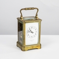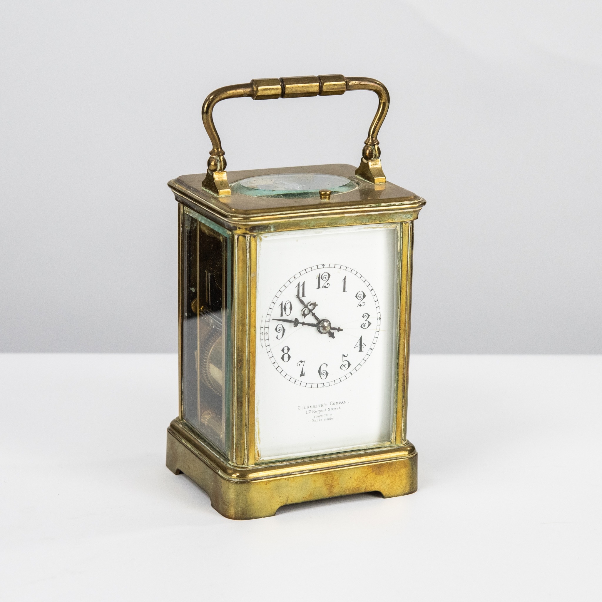 EARLY TWENTIETH CENTURY FRENCH BRASS CASED REPEATER CARRIAGE CLOCK striking on a COILED GONG, the backplate stamped PATENT S J RETYPOLLER, the WHITE ENAMEL dial with ARABIC NUMERALS inscribed with GOLDSMITH'S COMPANY, LONDON retailer's name, 6 ½" (16.5cm) high, with KEY