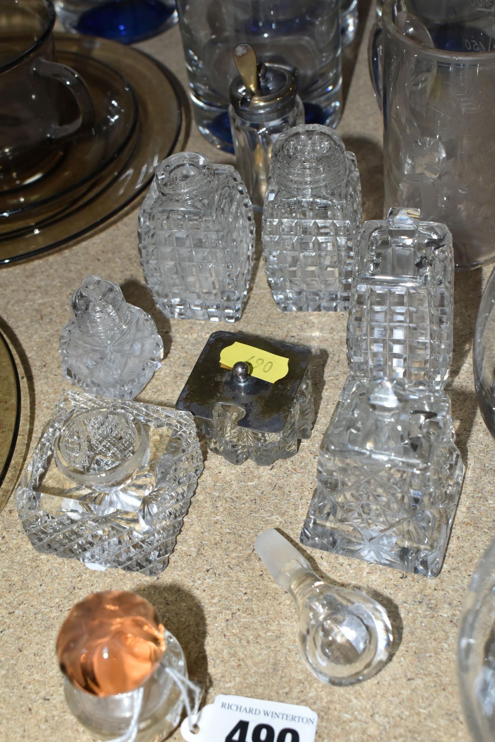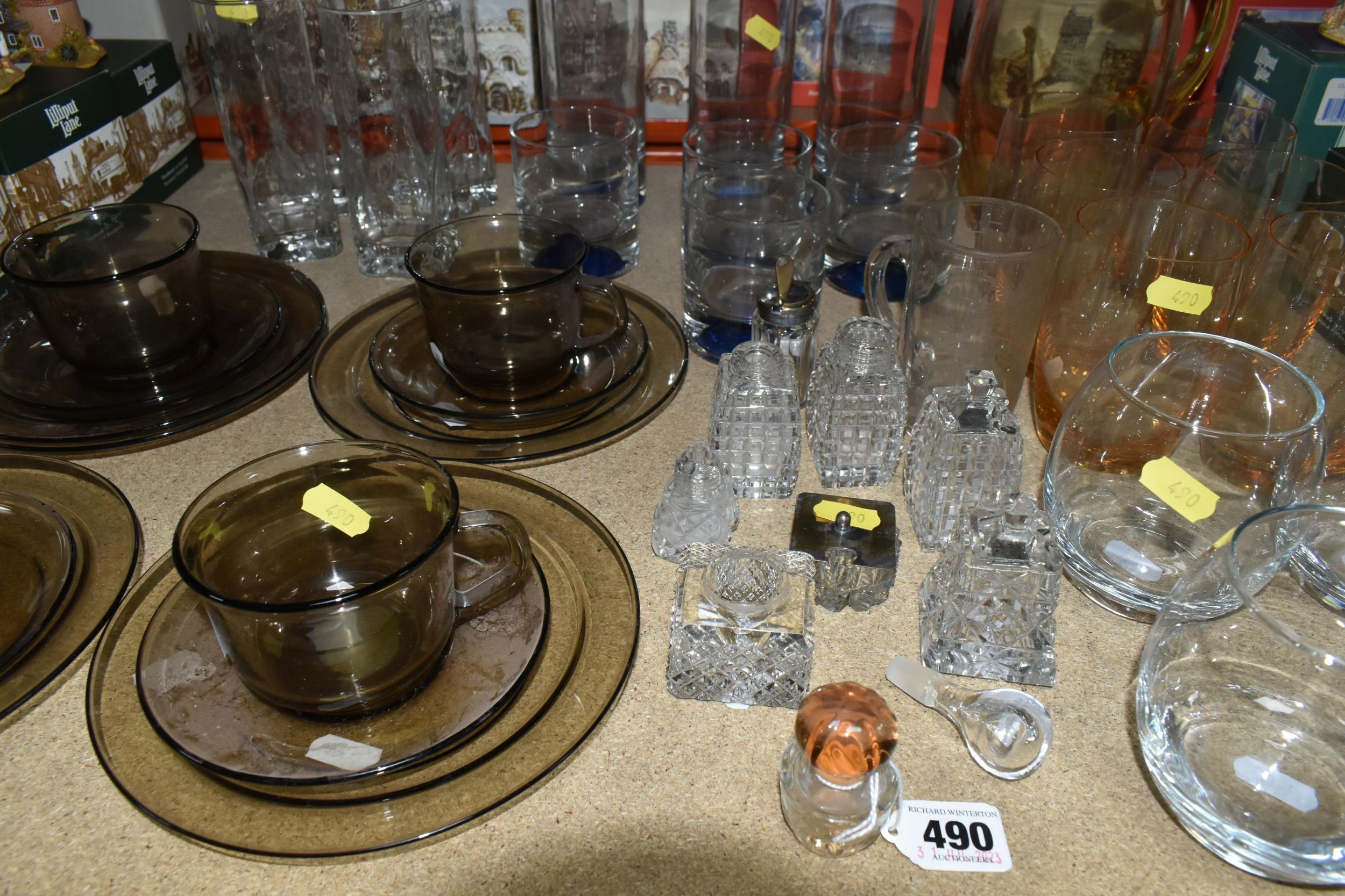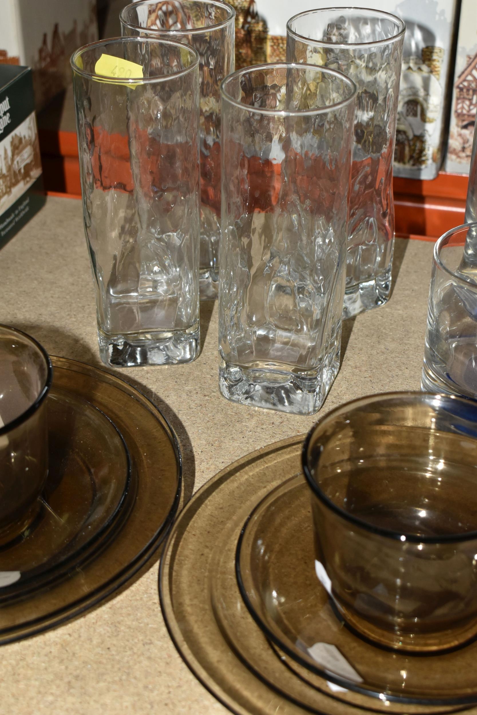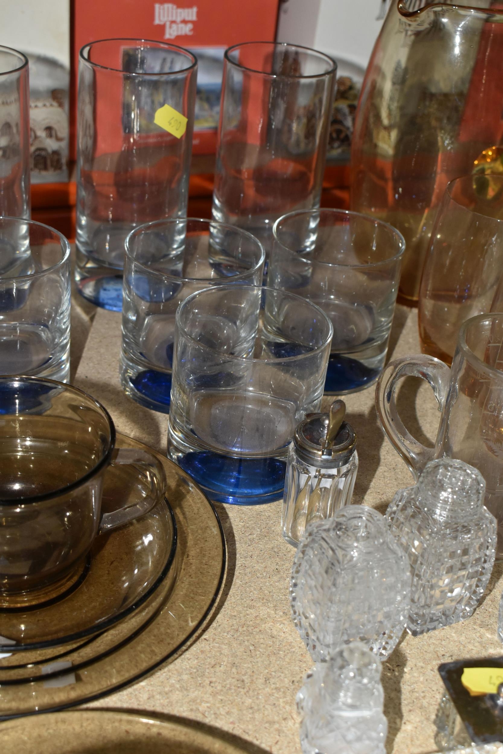 A GROUP OF GLASSWARE, comprising a mid-century amber coloured lemonade set, four whisky tumblers and three tall tumblers with blue bases, a set of four cups, four saucers and five tea plates in vintage French Acoroc smoked glass, a French Fabergé perfume bottle, cut crystal glass ink well and parts of a cut glass cruet set, etc. (Qty)
