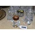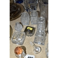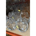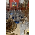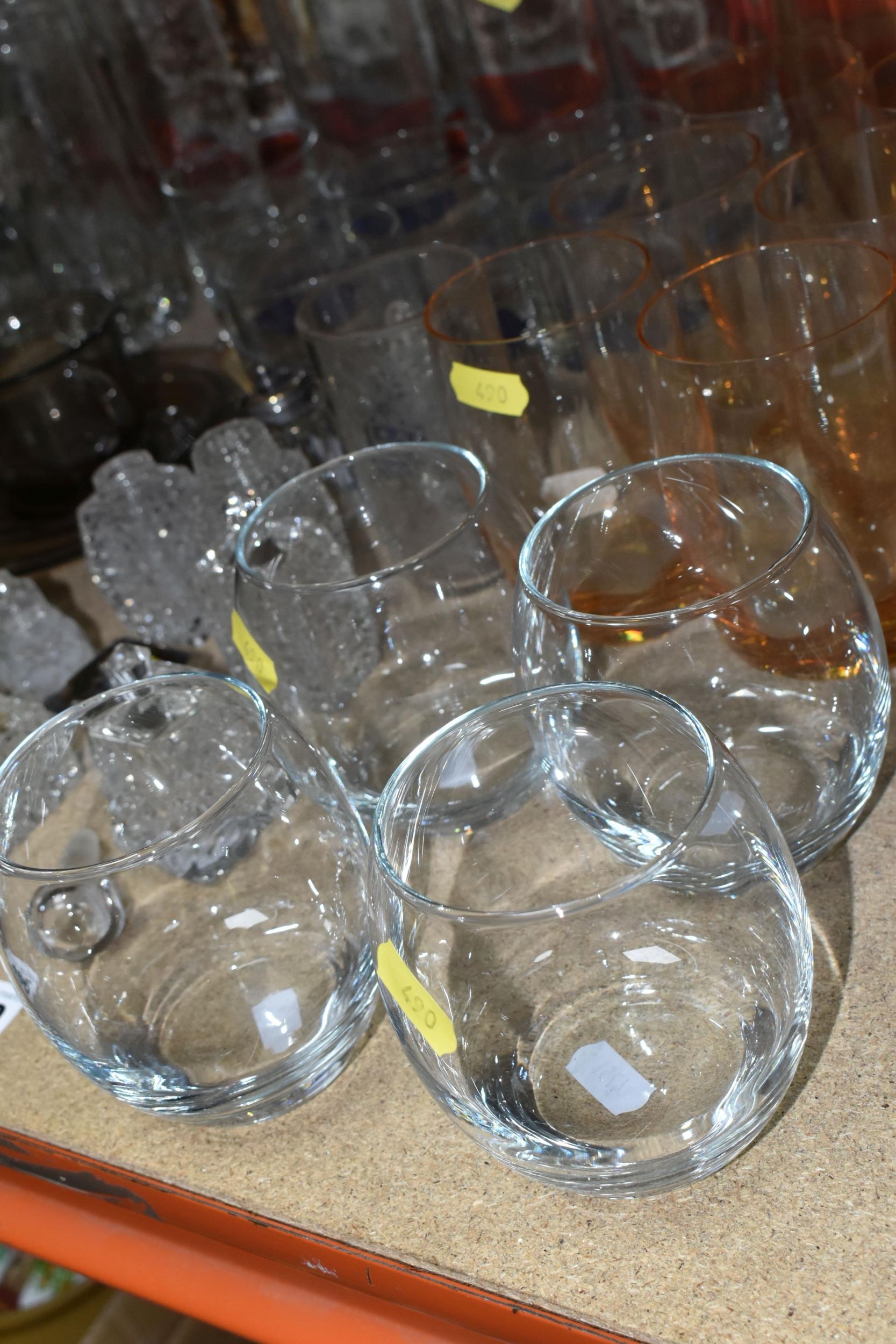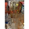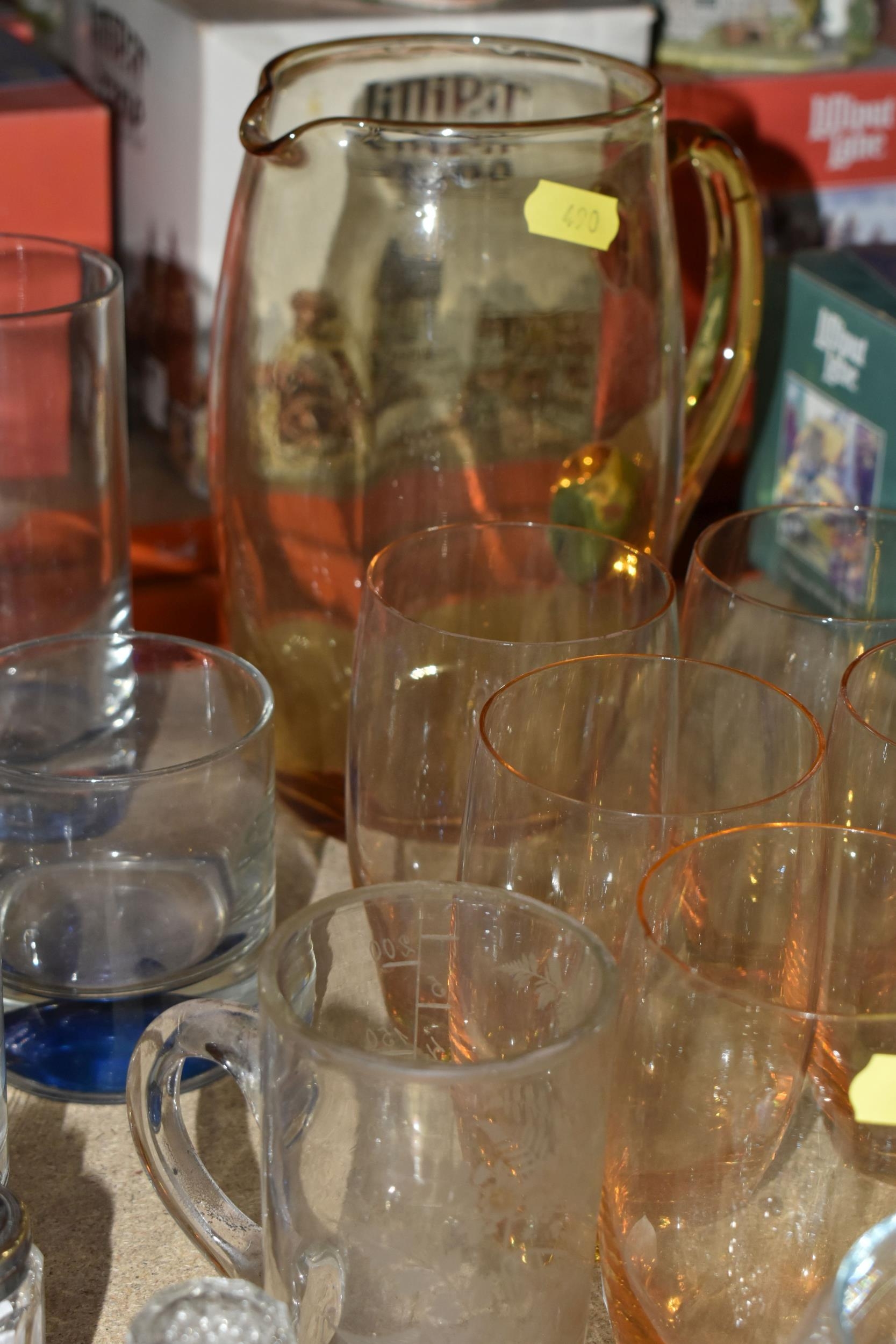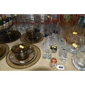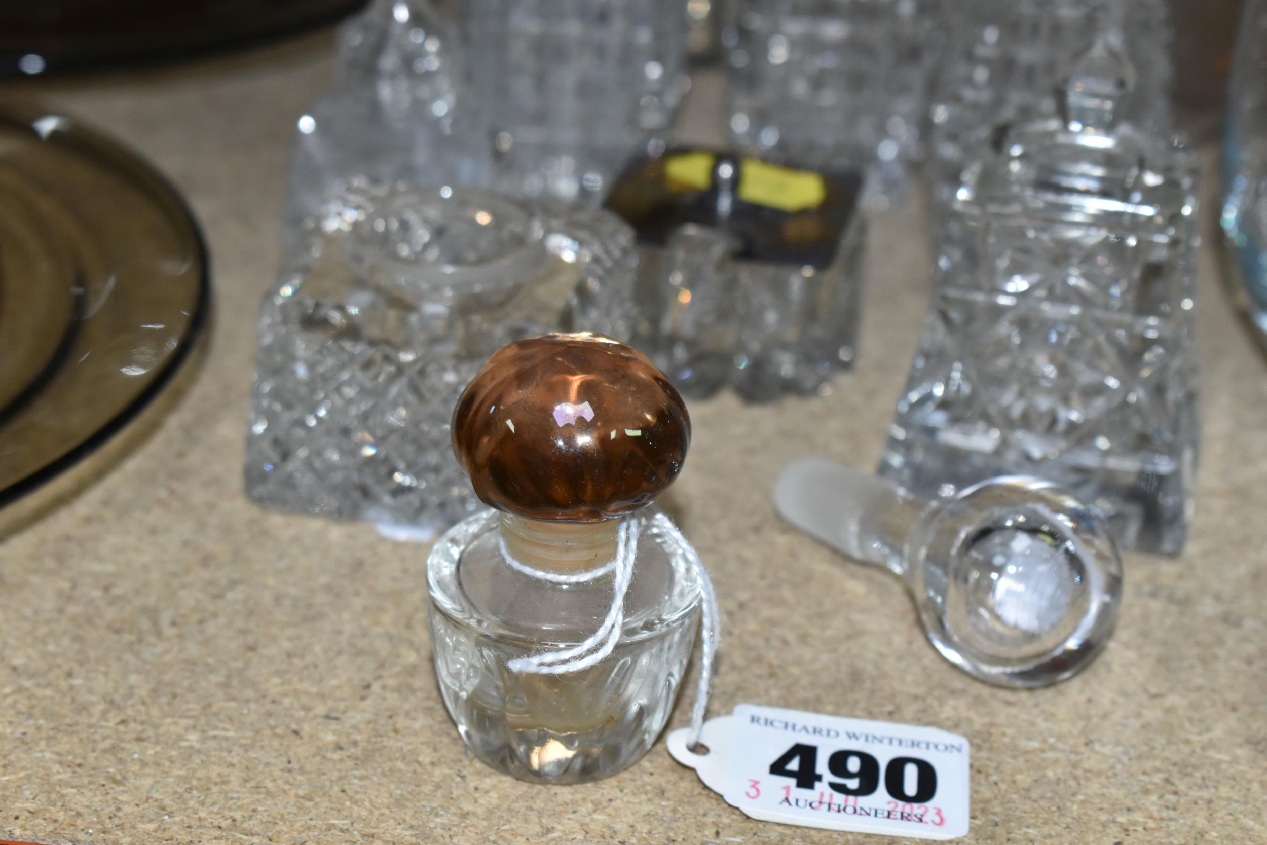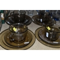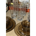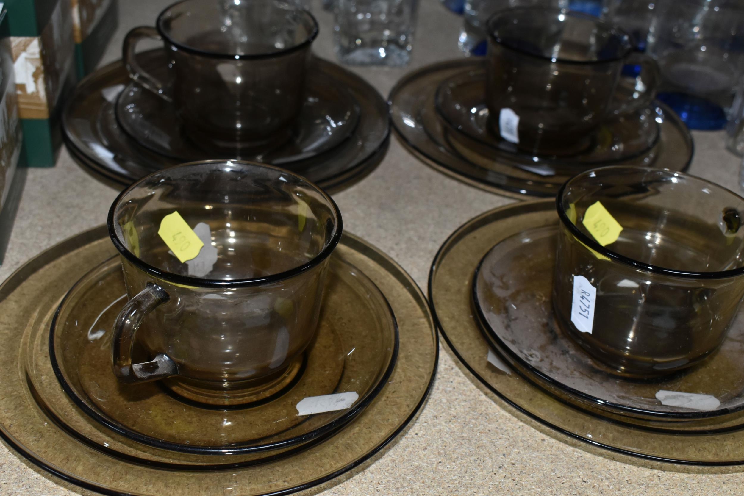 A GROUP OF GLASSWARE, comprising a mid-century amber coloured lemonade set, four whisky tumblers and three tall tumblers with blue bases, a set of four cups, four saucers and five tea plates in vintage French Acoroc smoked glass, a French Fabergé perfume bottle, cut crystal glass ink well and parts of a cut glass cruet set, etc. (Qty)