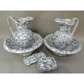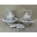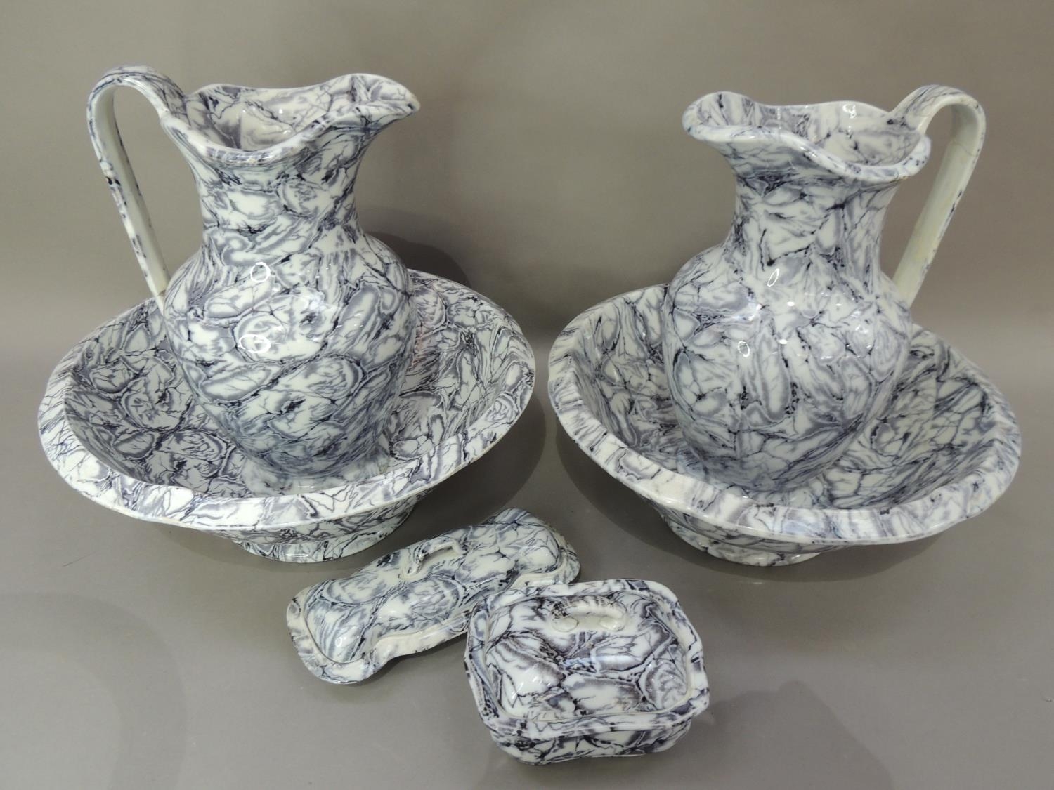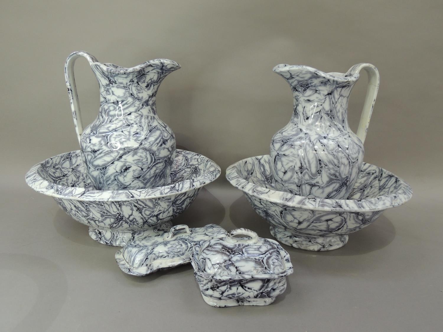 A Victorian six piece toilet set of grey marbled decoration comprising two water jugs, two bowls on circular foot, a toothbrush box and cover and a soap dish and cover, repairs