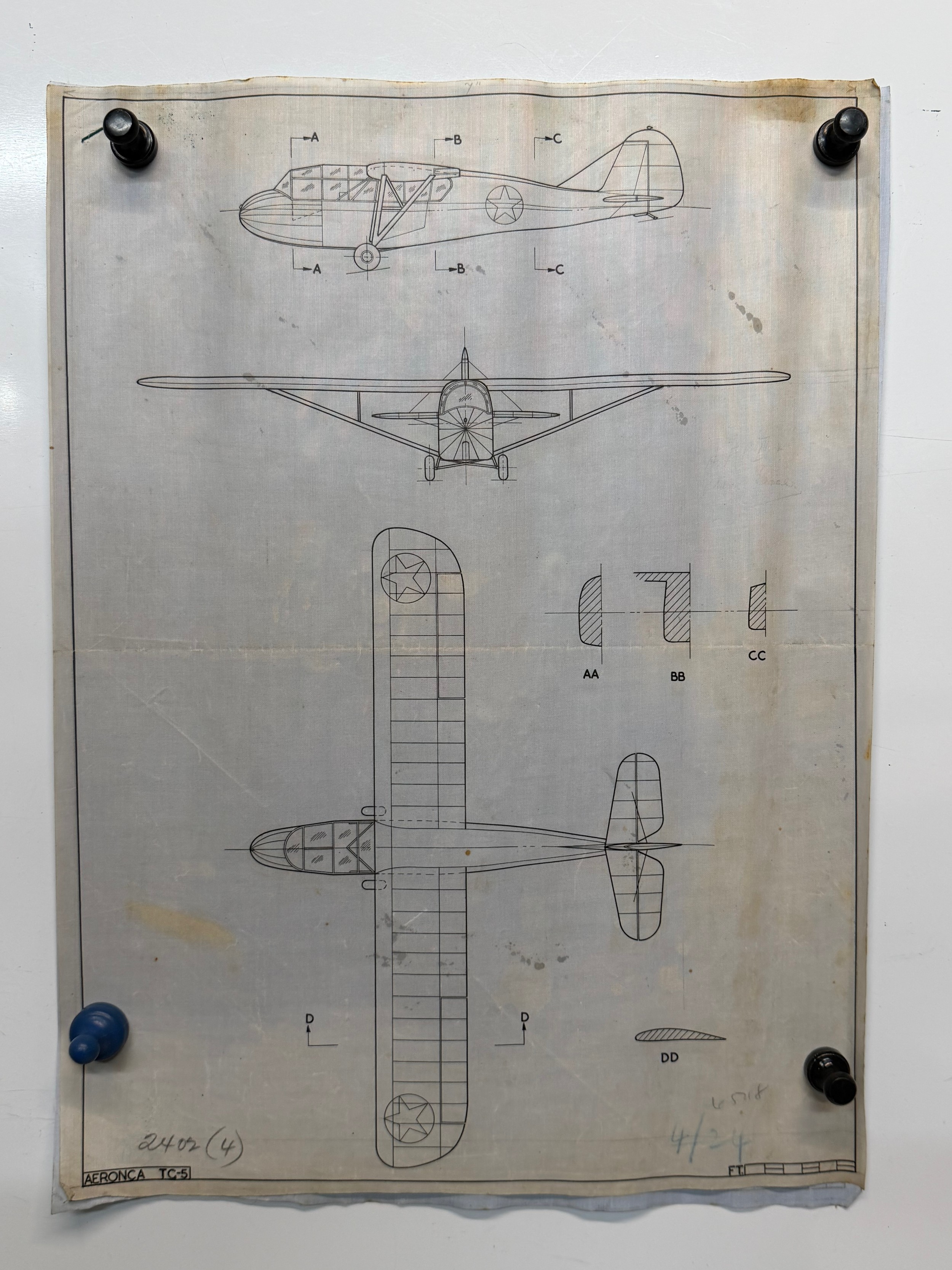 Militaria, ephemera, 2 WWII US aircraft plans on linen, a Aeronca TC5, 38 cm x 28 cm