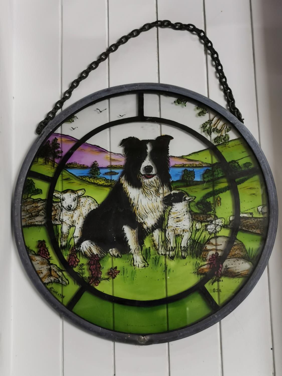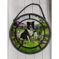 15.5 cm diameter light reflecting painted glass hanging panel showing sheep dog and sheep