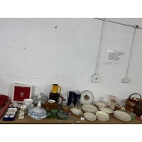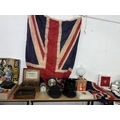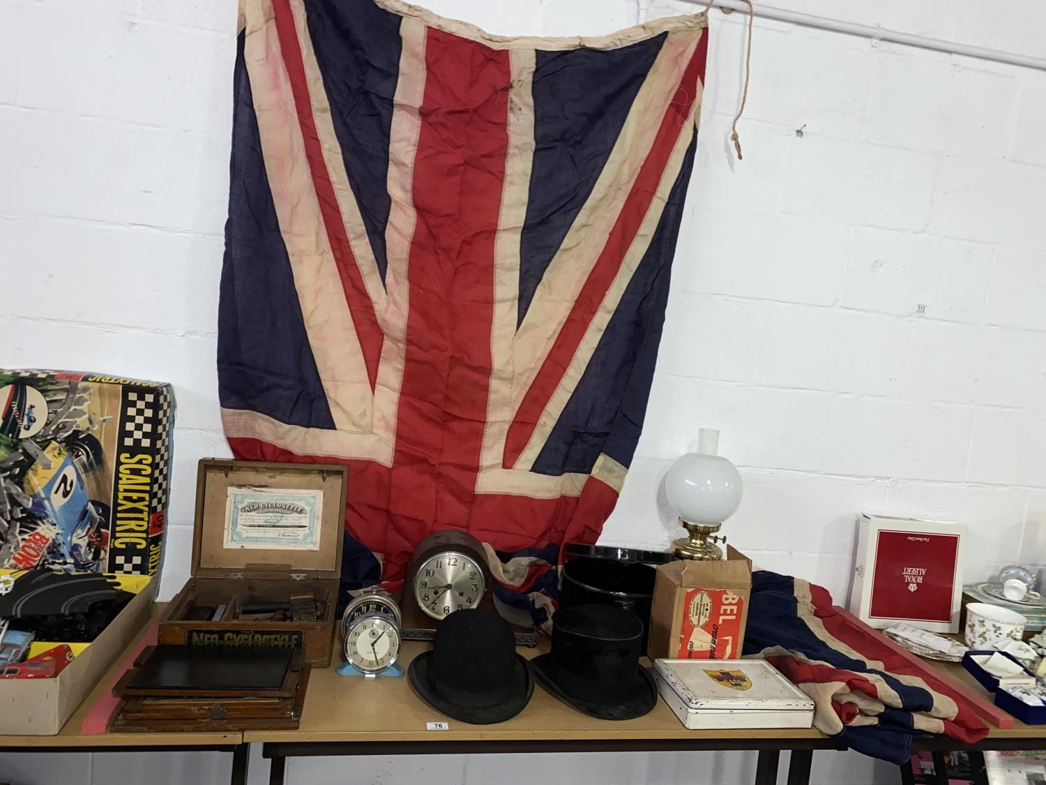 A vintage lot to include bowler hat, clock, oil lamp, boxed Neo cyclostyle duplicating apparatus, two very large early Union Jack flags etc.