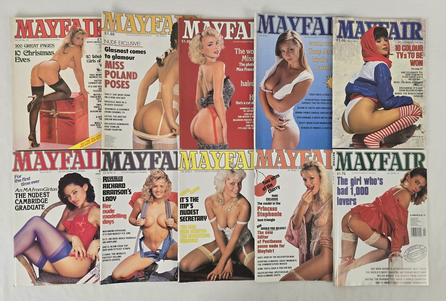 10 vintage 1980's & early 90's issues of Mayfair: Entertainment for Men adult magazine. Issues are from volumes 20 - 25.